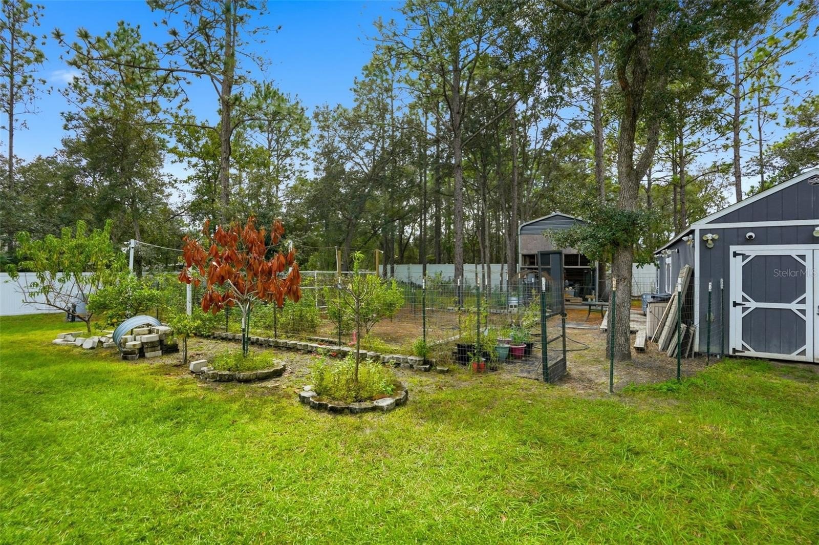 BEAUTIFUL HOME with EXTRAS!! Built in 2020! PAVED ROAD!! NO HOA!! NO CDD!! NO FLOOD!! UPGRADED, OPEN FLOOR PLAN HOME with 4 Bedrooms + 2 full bathrooms + 2-Car Garage + almost 1/2 acre property + Large screened-in back patio (24 x 22) + large shed (32 x 12) with power for extra storage + large carport (12 x 20) converted to shed/storage + completely fenced with 8' tall white privacy fence in the backyard and 6' privacy fence with two gates for bringing in large vehicles + ready-to-plant Garden Area with irrigation in the backyard for the family who wants to grow their own healthy fruits and vegetables!! Large chick coop (can come with the 3 laying hens)! UPGRADES in every room! Large common living space with HIGH ceilings and lots of windows and slider to add natural light! Home feel slight, bright, and spacious!! The kitchen has upgraded, real wood cabinets with slide out drawers and 42" upper cabinets! Granite countertops and breakfast bar! Added recess lighting!! Extra coffee bar and cabinets with granite serving area added when the home was built - gives so much extra storage and counter top space!! GORGEOUS laminate wood flooring that matches the cabinets!! In mint condition! Front formal living room can be used as an office/den or bonus room! Forma dining room and breakfast room! Kitchen is open to the large family room and breakfast room with glass sliders to the large covered patio and screen room - great for entertaining family and friends!!