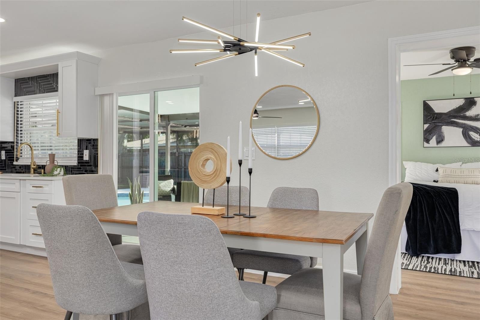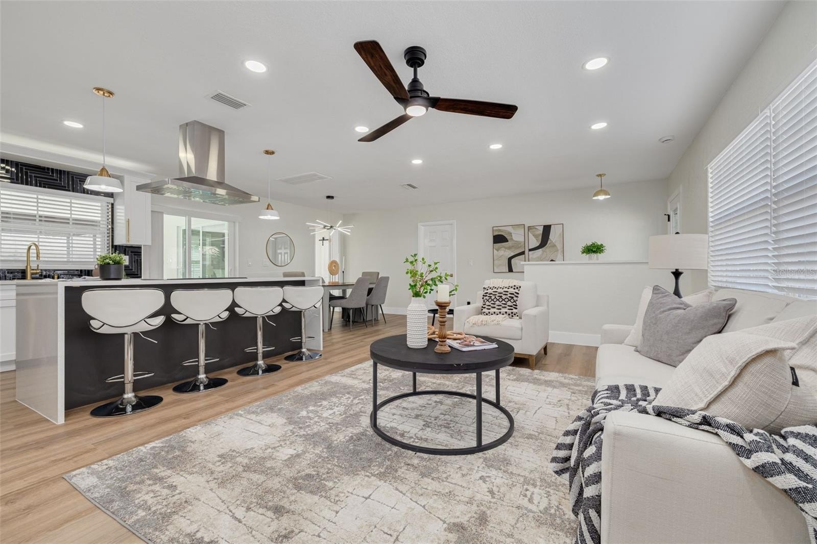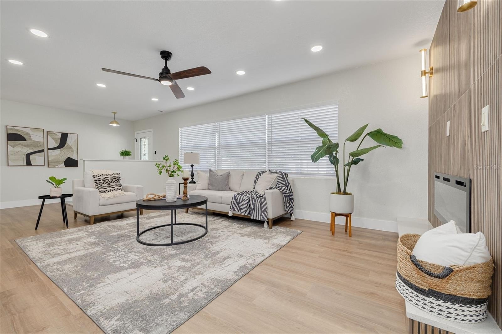 Step inside to a bright open-concept floor plan combining the living, dining, and kitchen areas. The space is enhanced by luxury, water-resistant vinyl plank flooring and an eye-catching contemporary electric fireplace that serves as the home’s centerpiece.