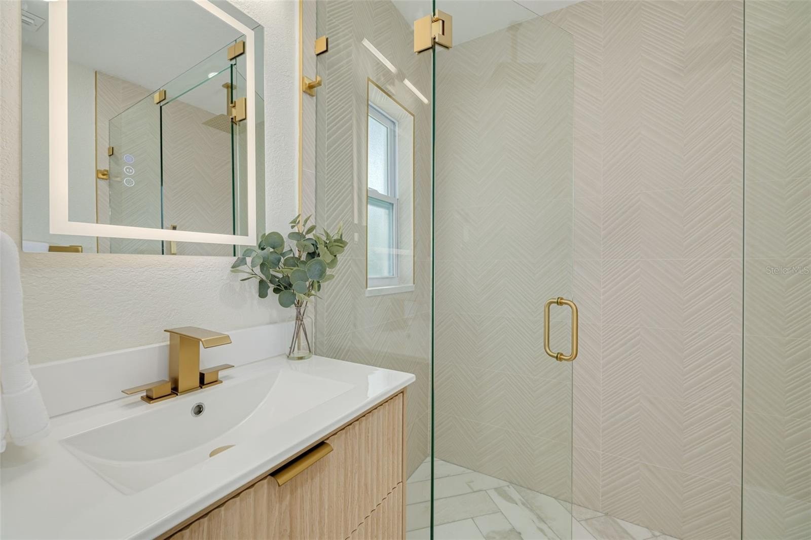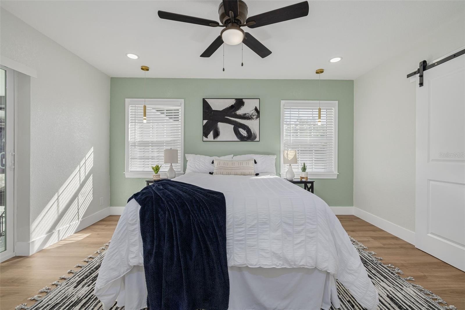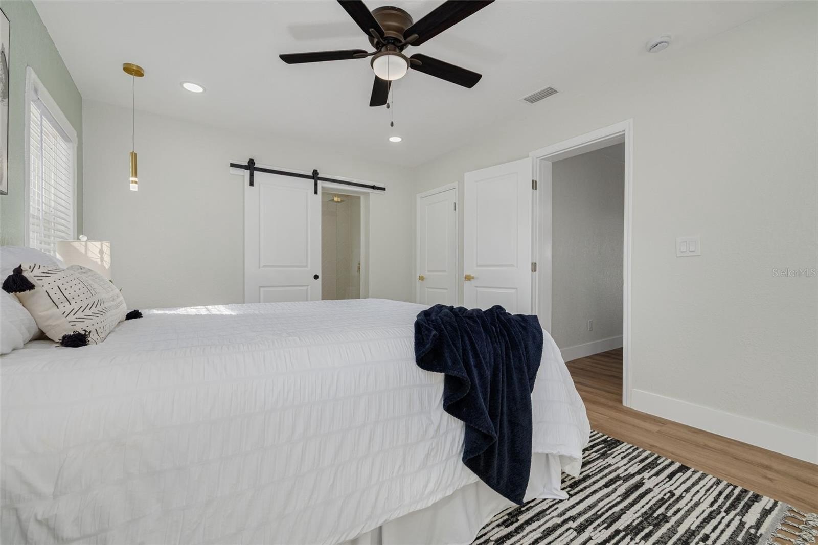 The split-floor plan primary suite offers privacy and elegance, featuring a large walk-in closet, modern barn door, and a luxurious en-suite bath complete with a frameless glass shower with multiple shower heads and a sleek new vanity.Both bathrooms have been completely renovated with high-end finishes and contemporary fixtures.