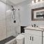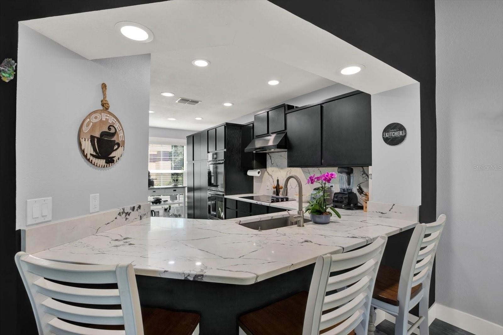 The spacious kitchen features stone countertops, a built-in double oven, modern cabinetry, and stylish finishes—offering plenty of room for cooking and entertaining. Both bathrooms are stunning, showcasing exquisite stone and tile work for a luxurious spa-like feel.