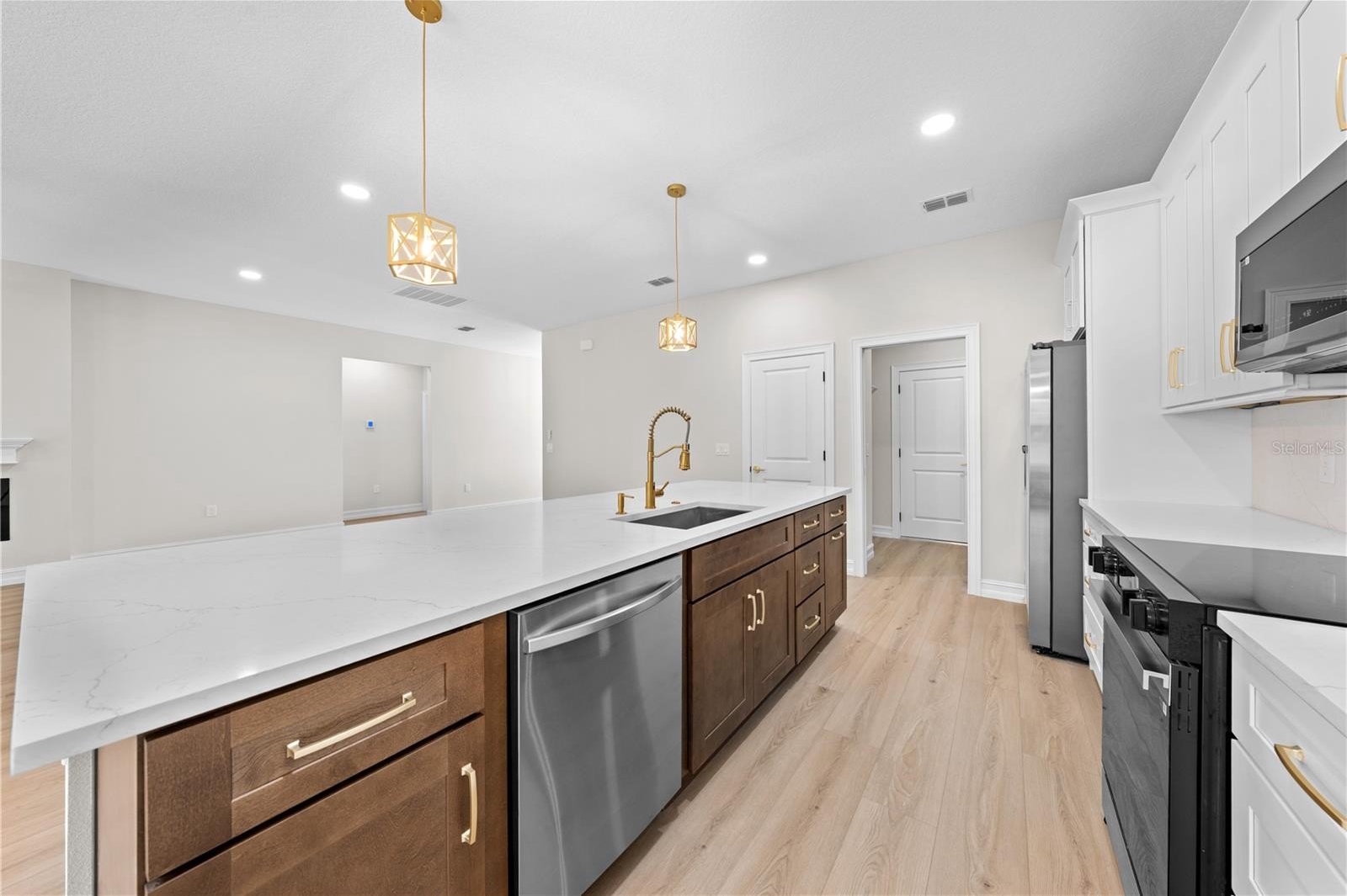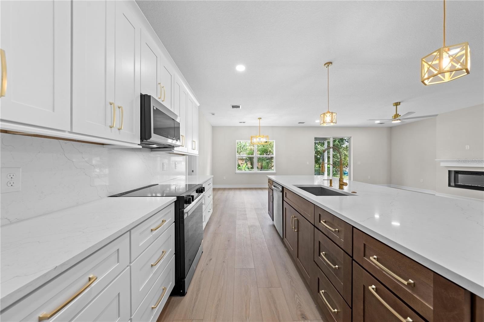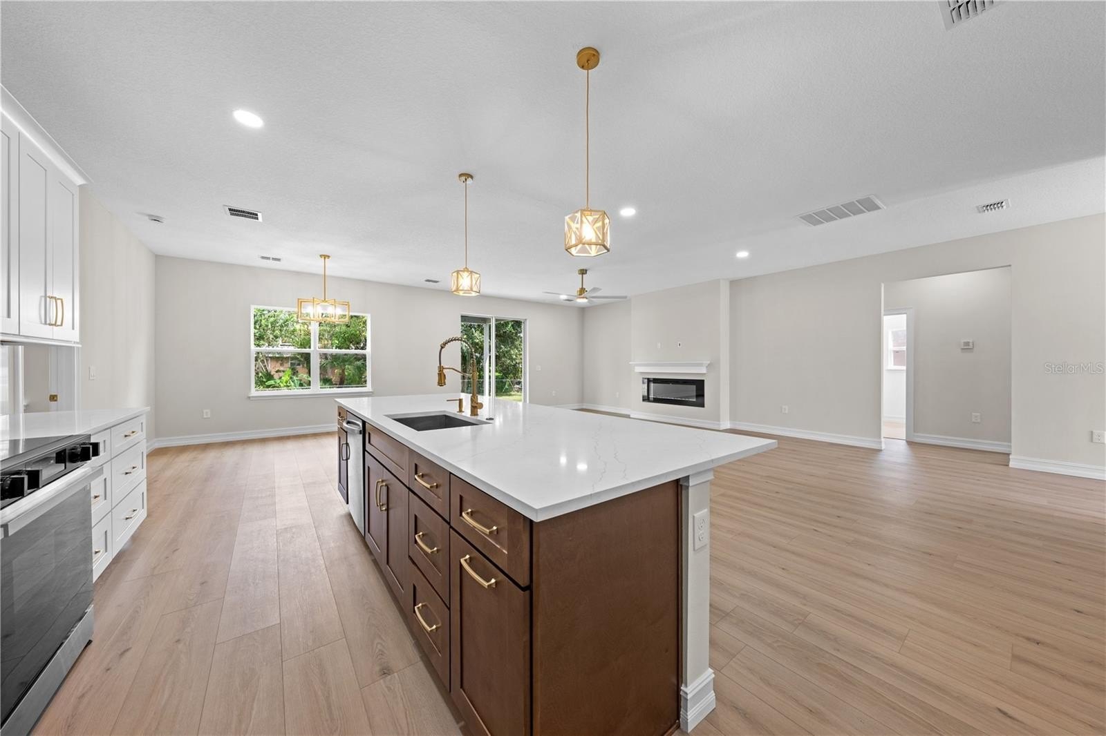 electric fireplace in the living room, and quartz counters in kitchen and baths. The kitchen features a closet pantry, breakfast bar, 42"