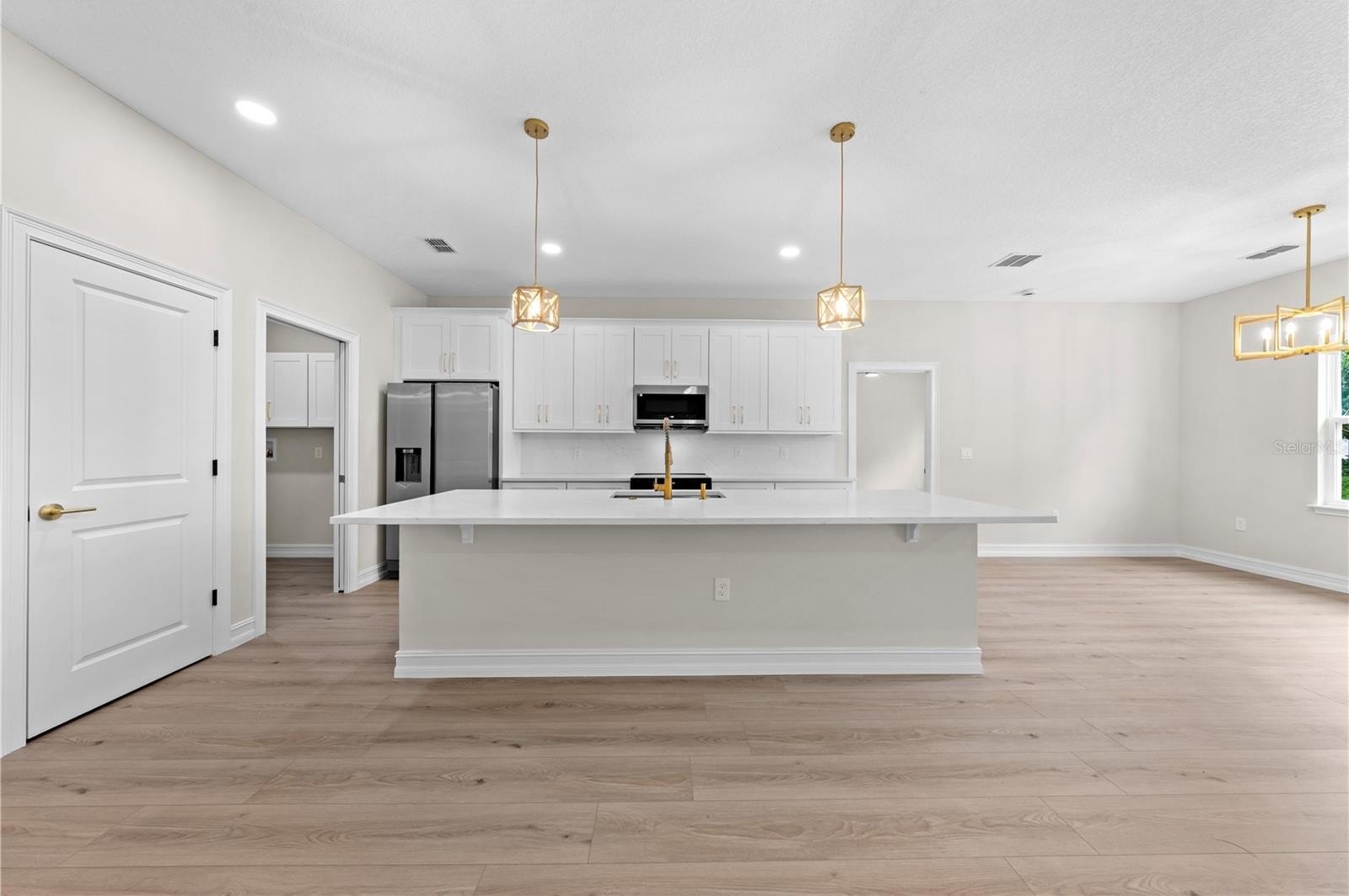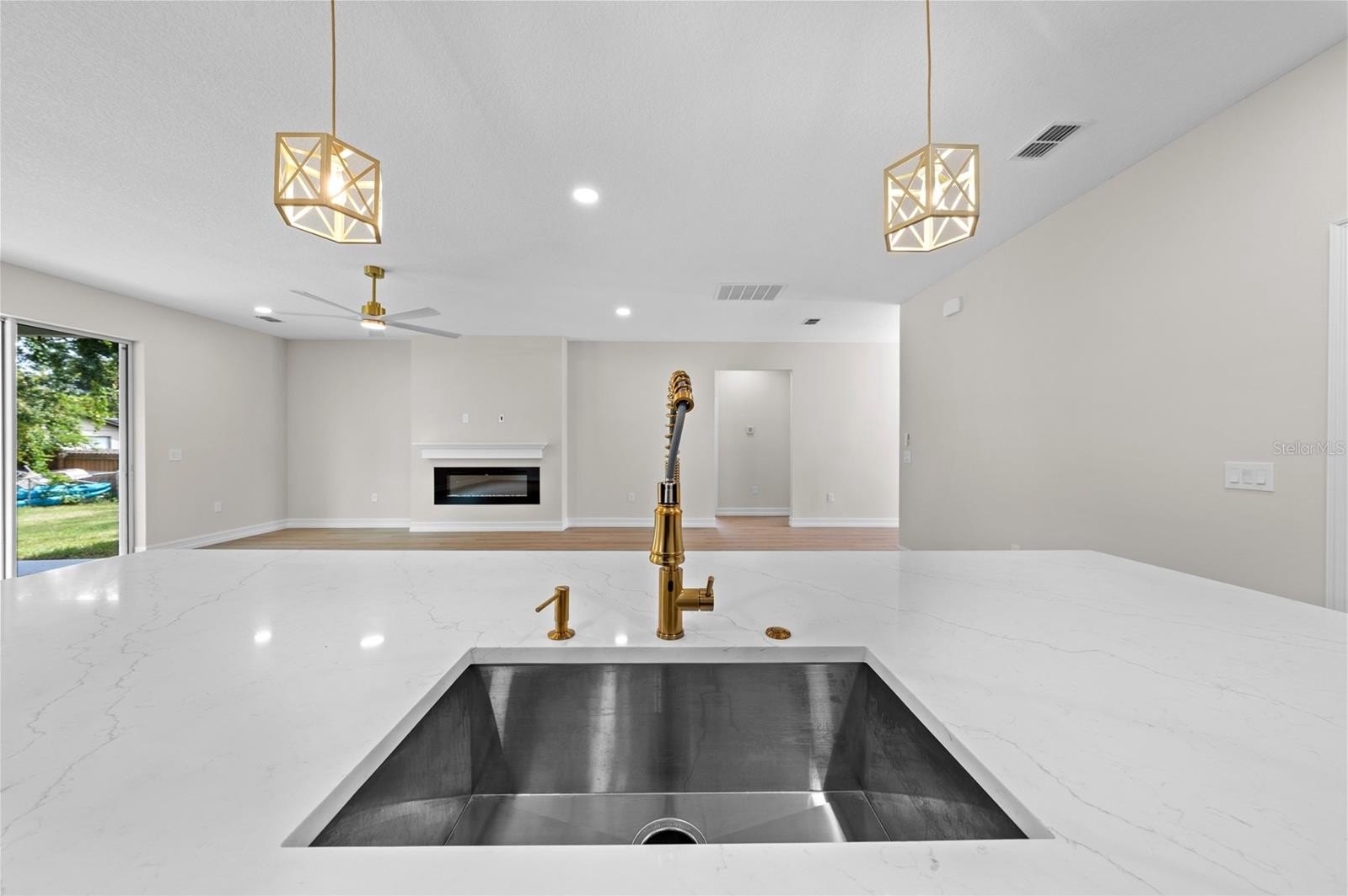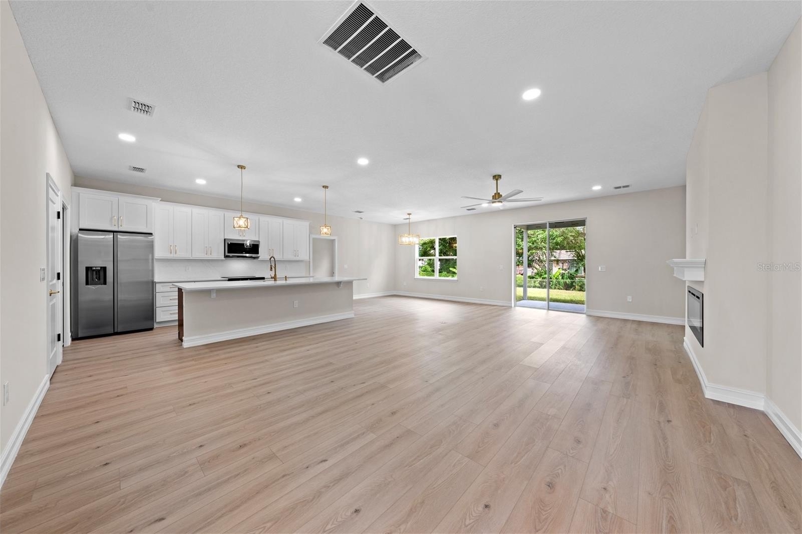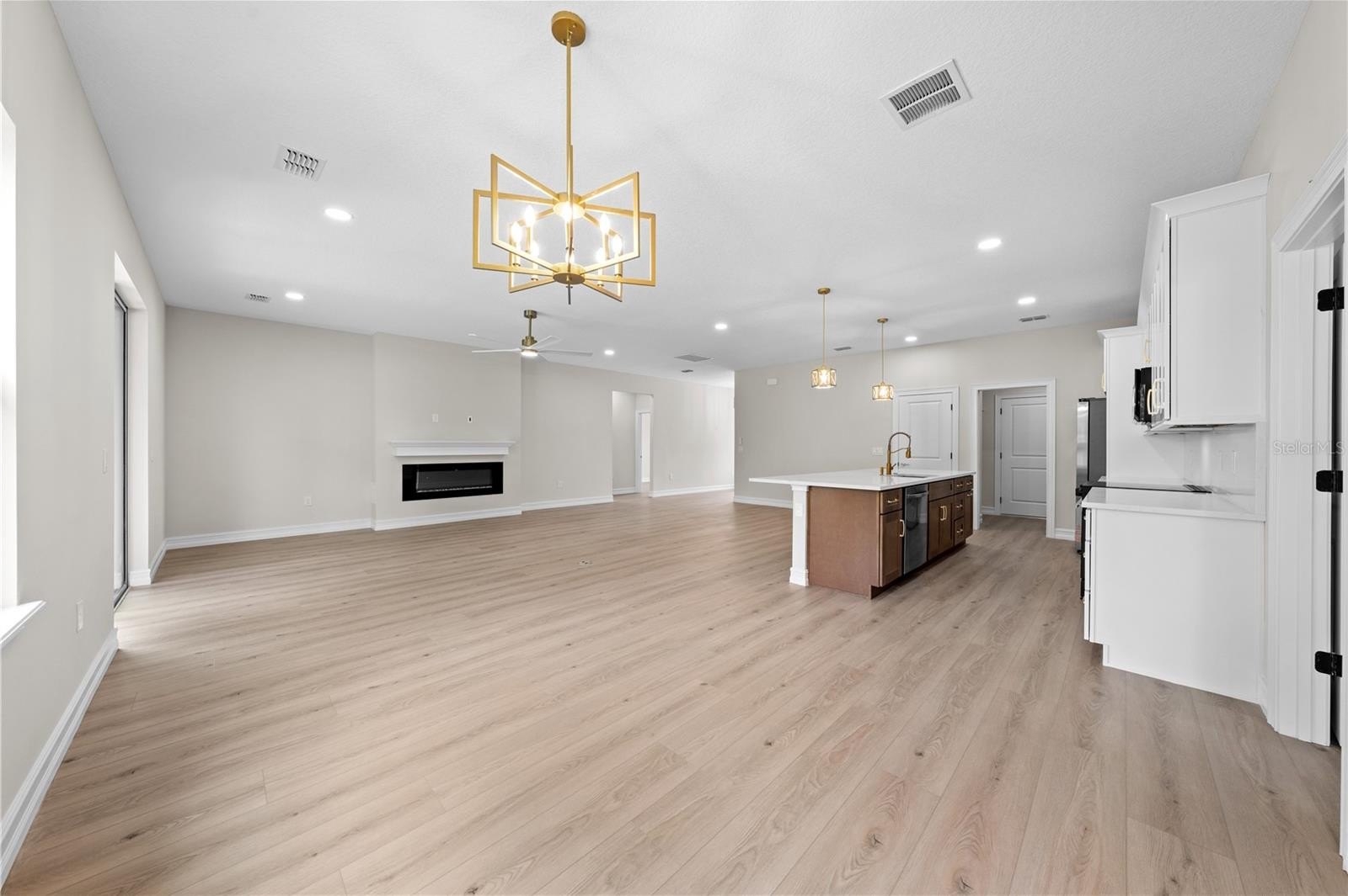 electric fireplace in the living room, and quartz counters in kitchen and baths. The kitchen features a closet pantry, breakfast bar, 42"