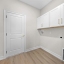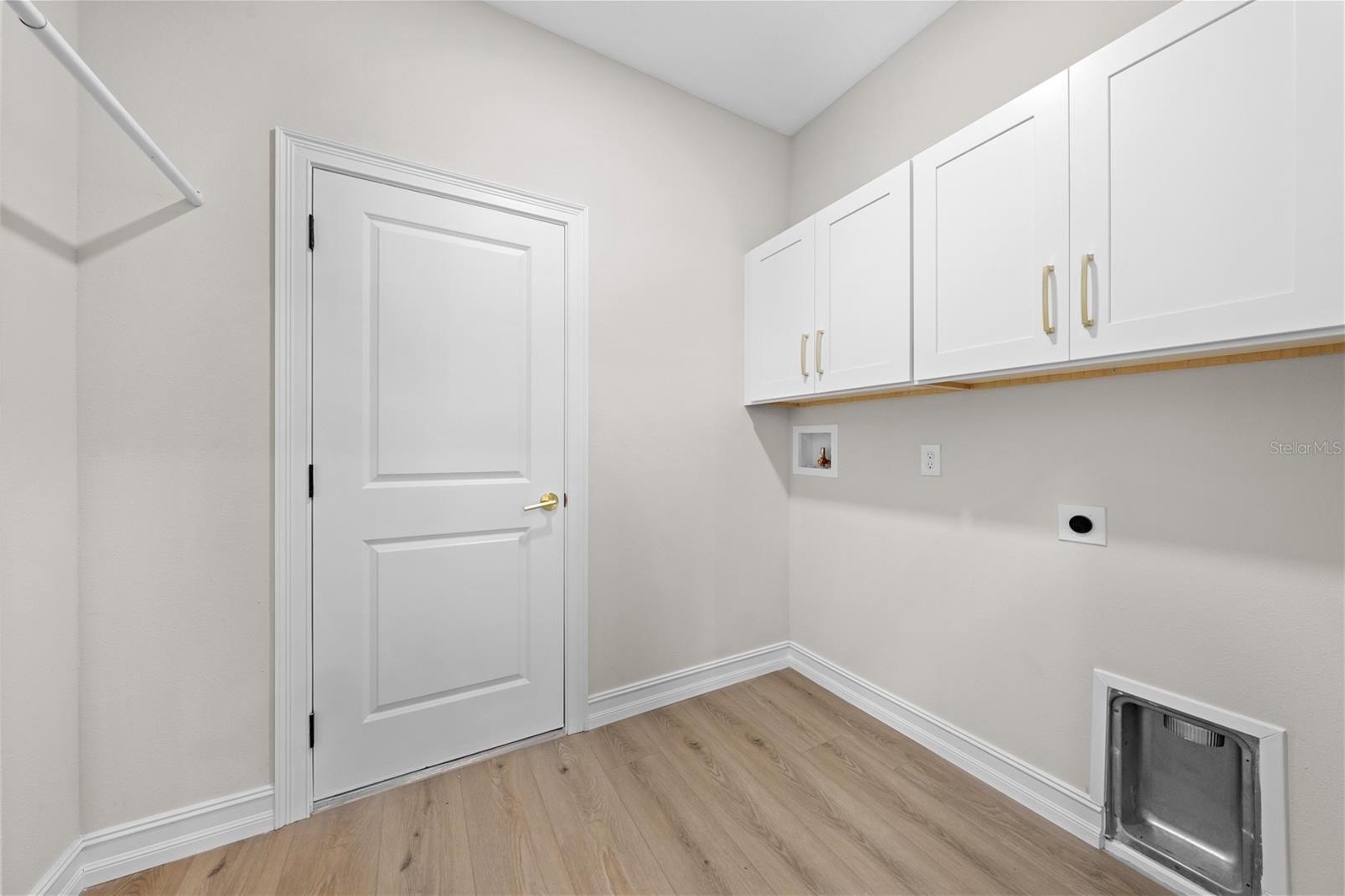 laundry room is versatile and includes cabinets, a pocket door to the kitchen, a dowel and niche for hanging clothes. There are 2
