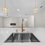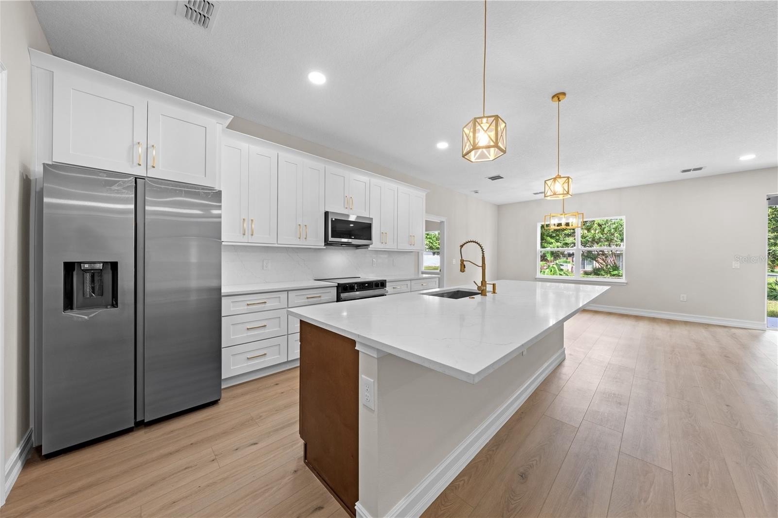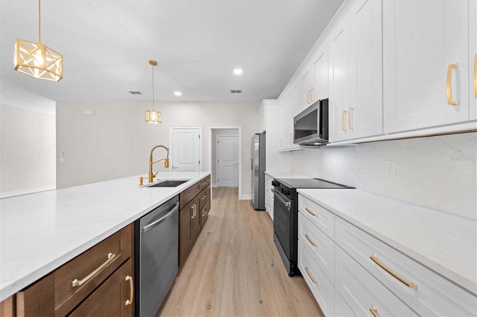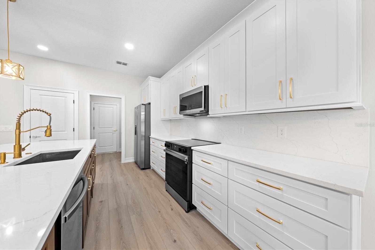 cabinets with crown and base molding, backsplash, convection oven, pendant lights, multiple drawers and a stainless steel sink. The