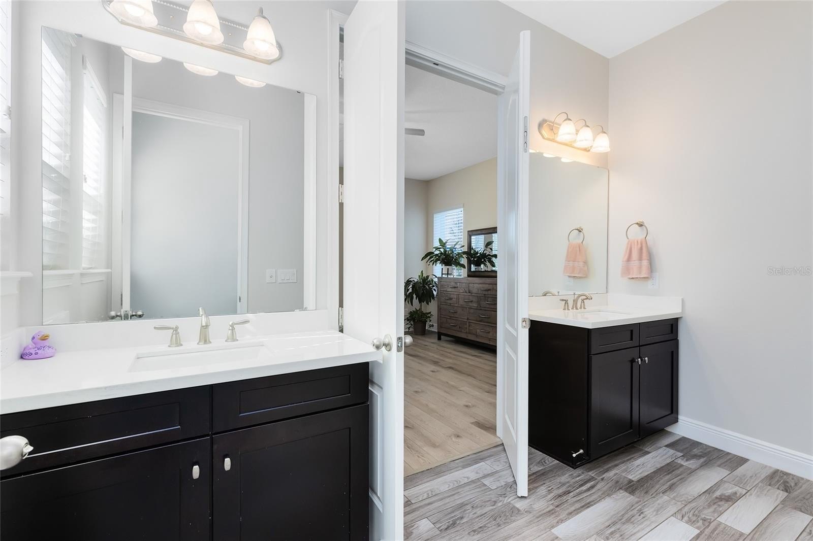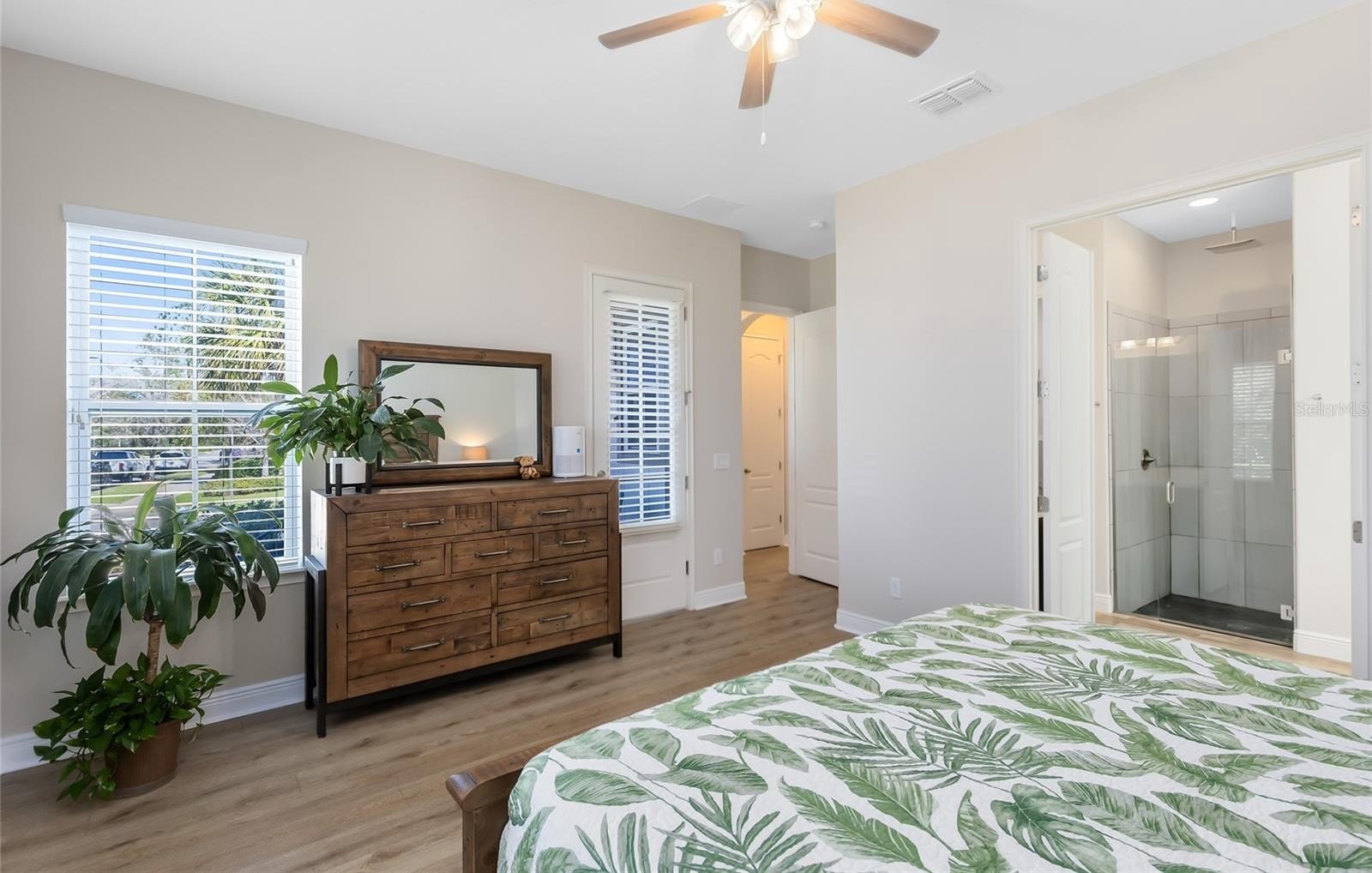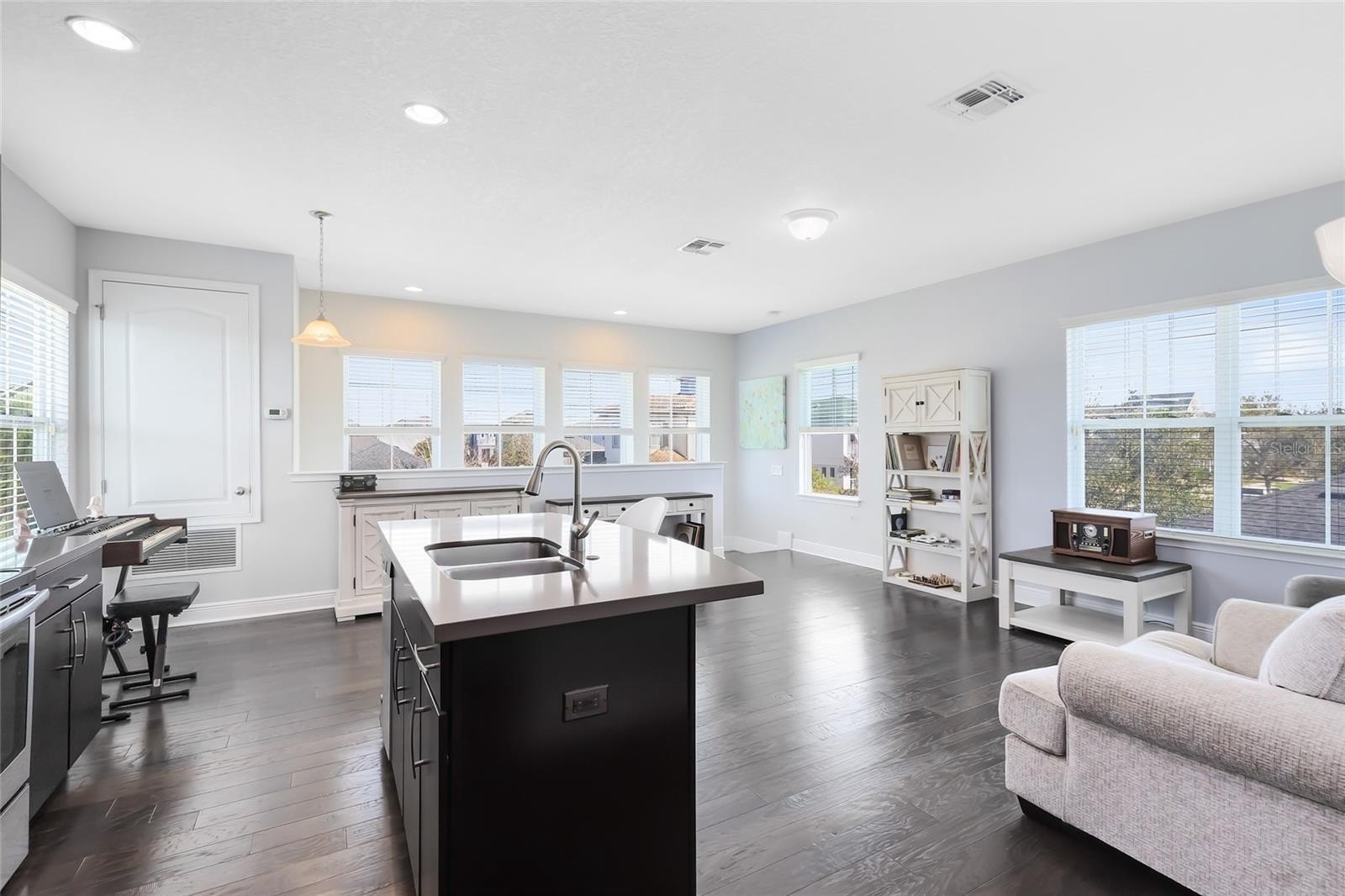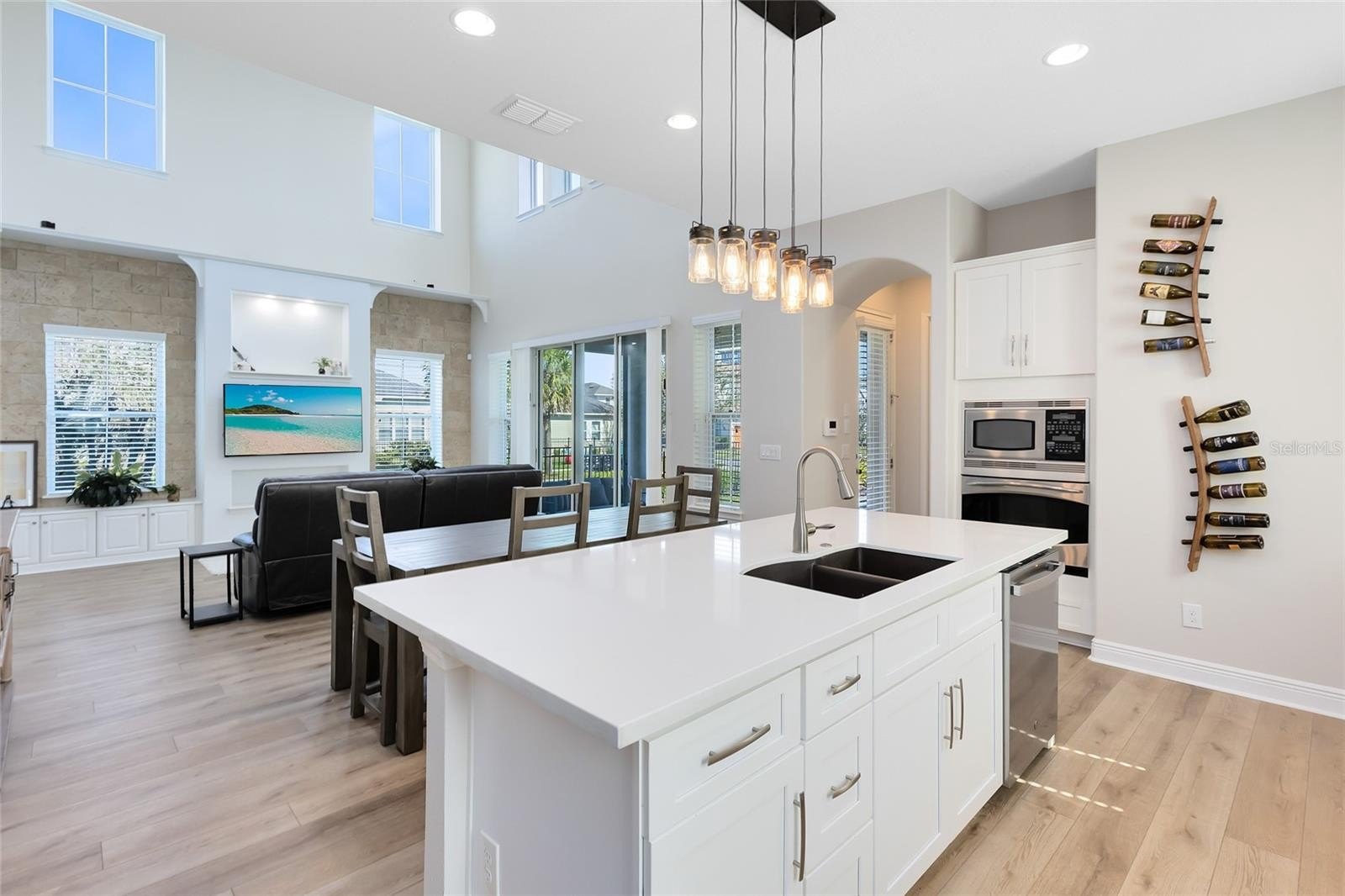 Inside, a fresh, modern palette and white oak-style LVP flooring flow seamlessly throughout the first floor, complementing the open-concept layout and upgraded finishes. The ground-level primary suite enhances accessibility and comfort, while the sun-filled two-story great room impresses with large windows that bathe the space in natural light. The chef’s kitchen showcases pristine quartz countertops, a spacious island, a gourmet wall oven, and designer lighting—ideal for both casual meals and formal entertaining.