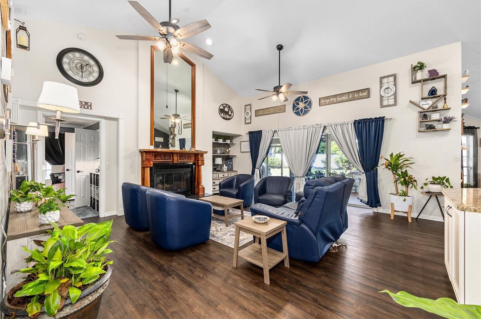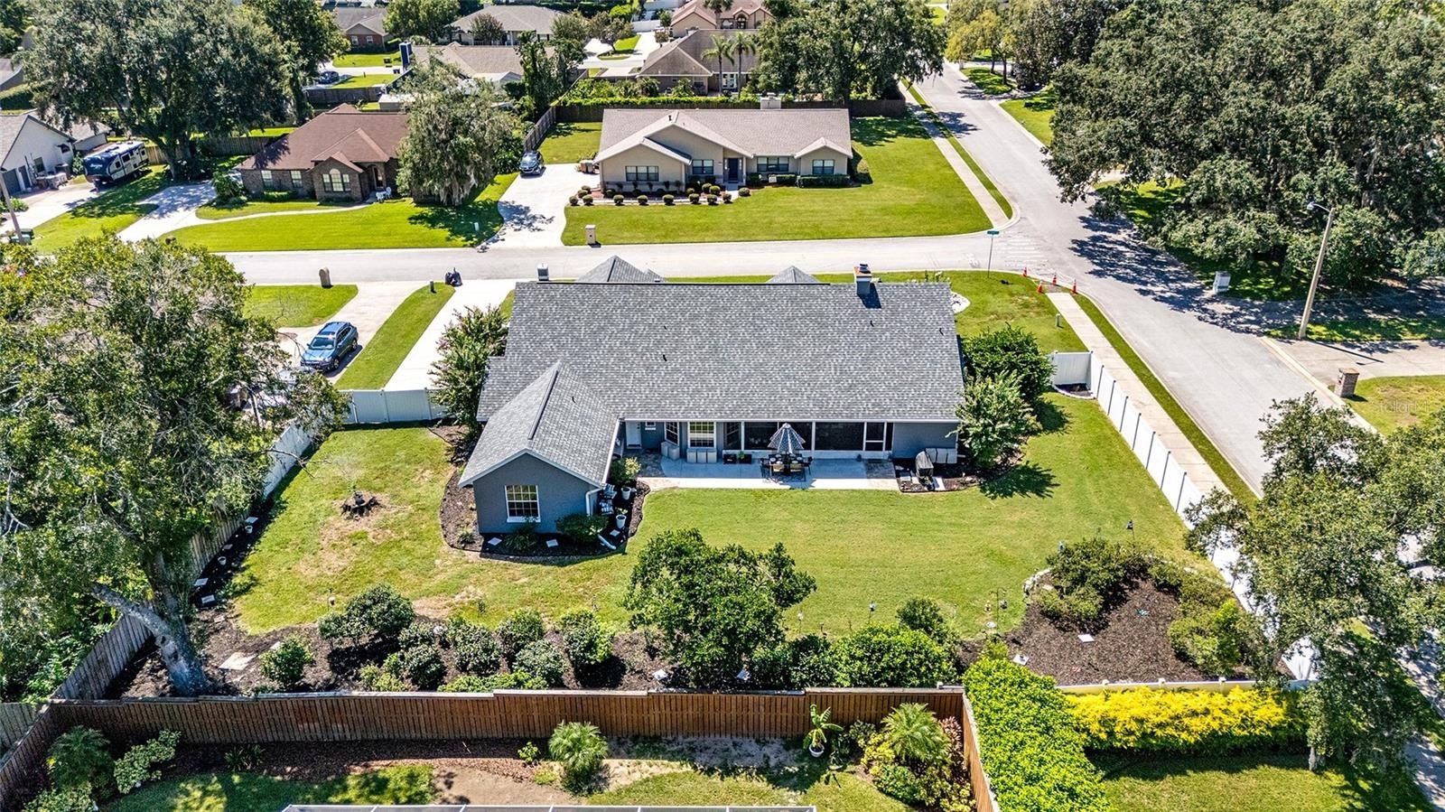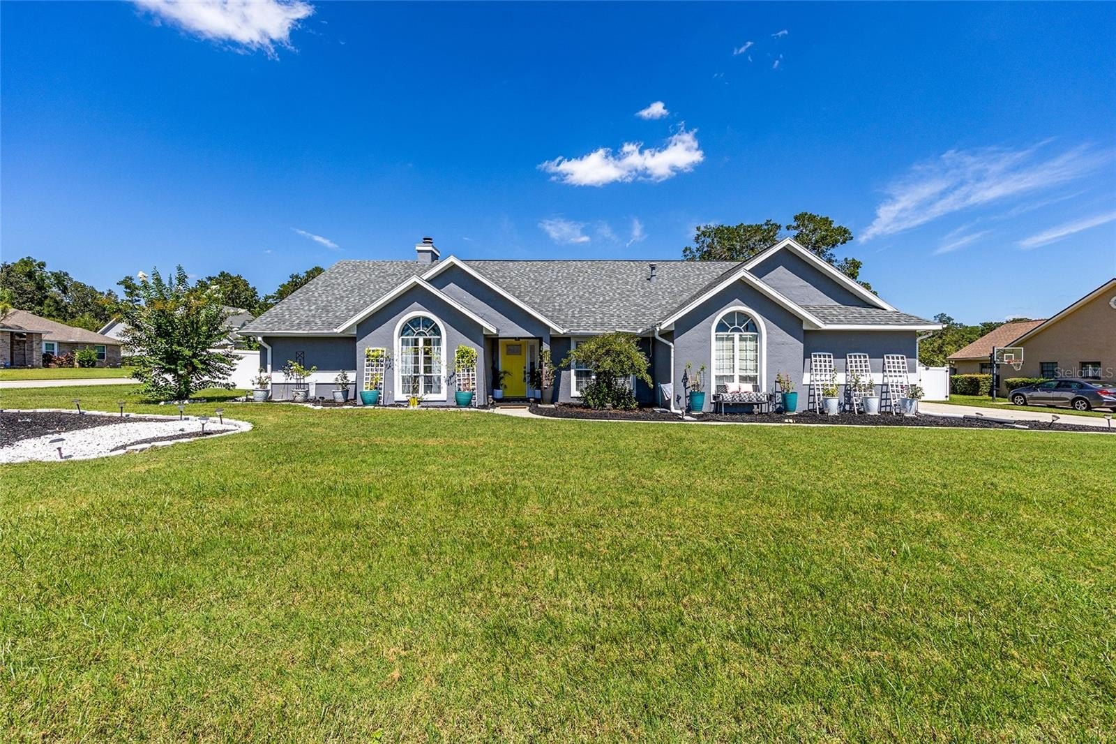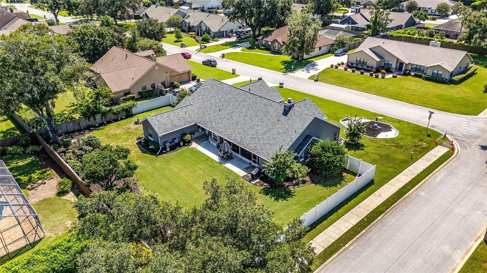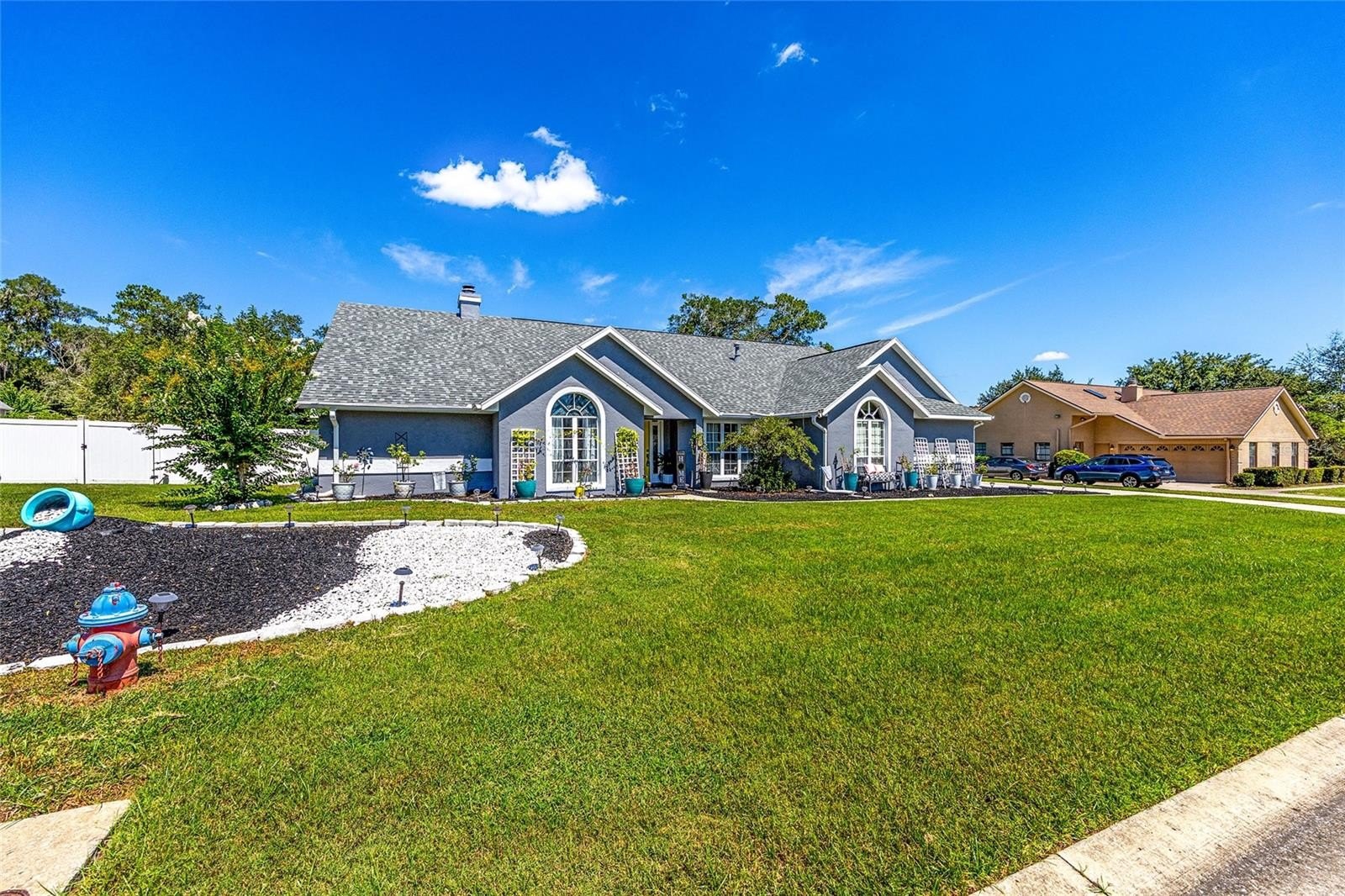 Stylish and spacious 4-bedroom, 3-bath home on a landscaped corner lot with vinyl fencing, offering both comfort and function. Inside, enjoy soaring ceilings, a decorative fireplace, and an open-concept design that flows seamlessly from the granite kitchen with double oven into the living and dining areas. A versatile bonus room makes the perfect game room, theater, or flex space, while the large dining room is currently set up as an office. The primary suite features tray ceilings, a walk-in tiled shower, makeup vanity, and a private water closet. Accessibility is thoughtfully designed with wider doors and upgraded toilets. Recent updates include a new roof, HVAC, and water heater (all 2023) plus a UV air filtration system for peace of mind. Relax year-round in the screened lanai overlooking the backyard. Beautifully maintained with hardwood beneath vinyl plank, this home blends modern updates with timeless charm.