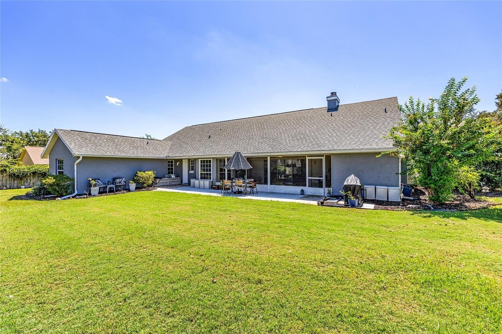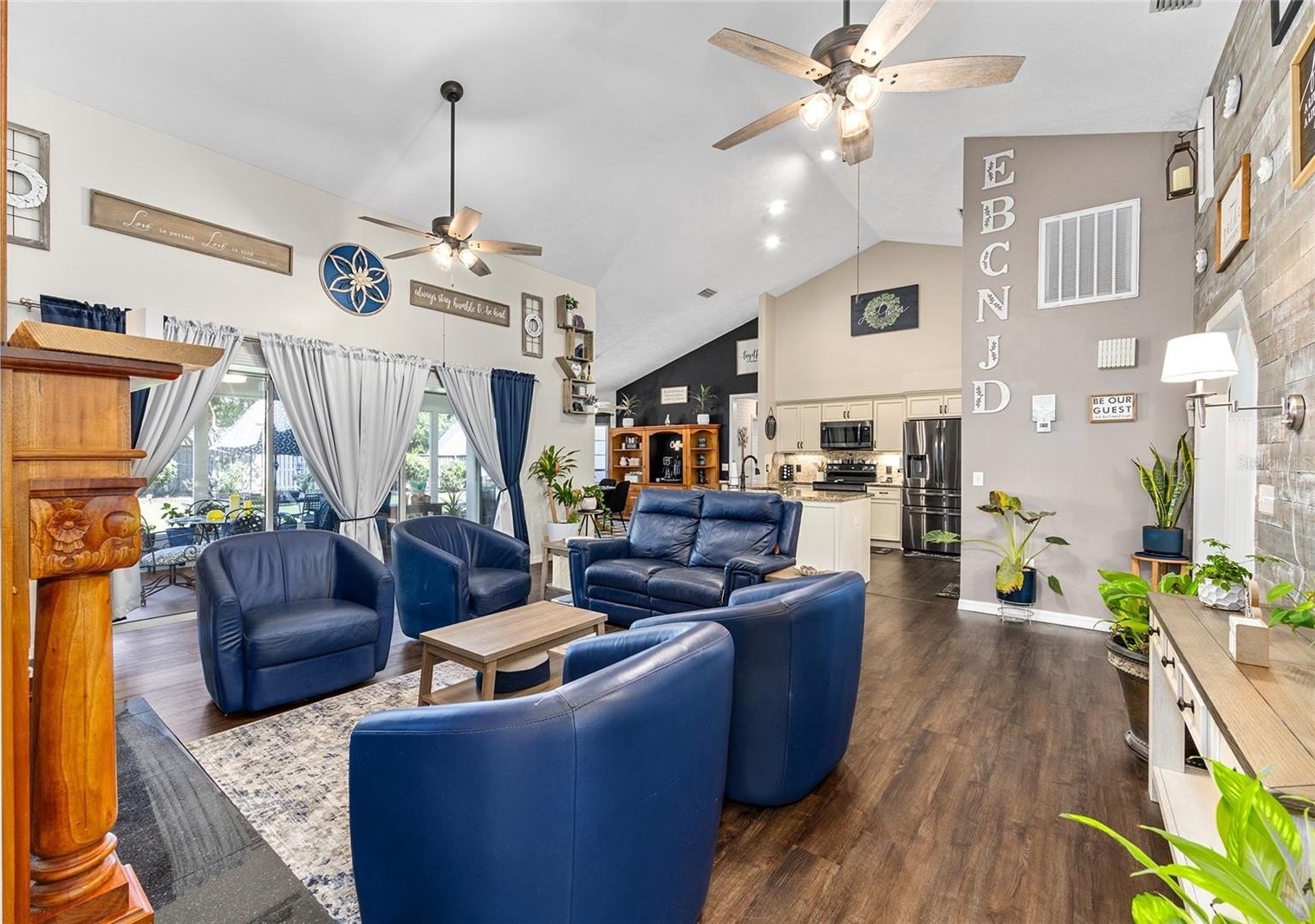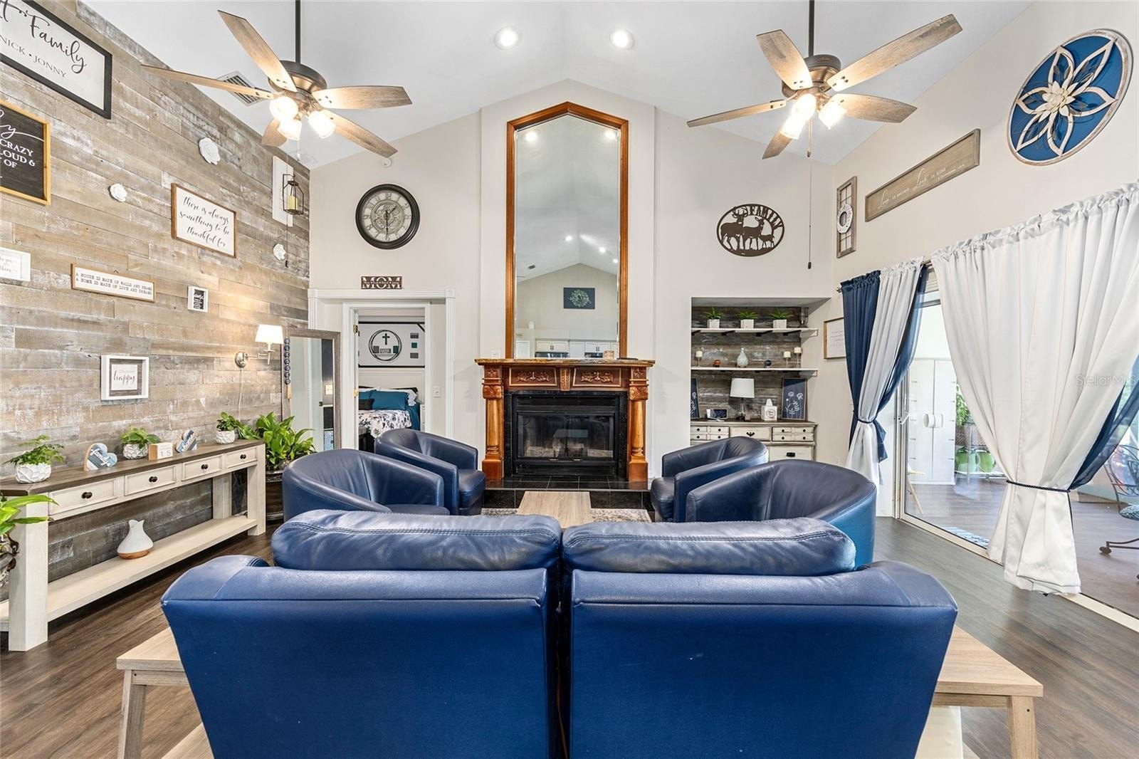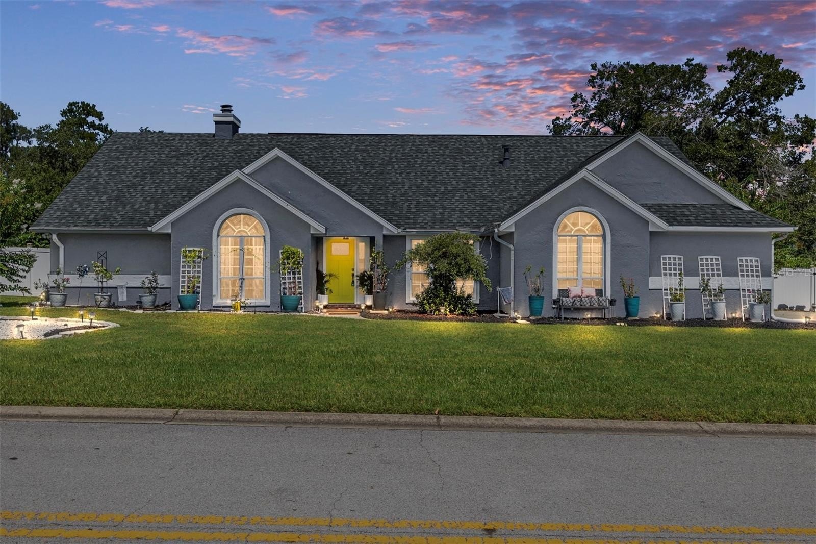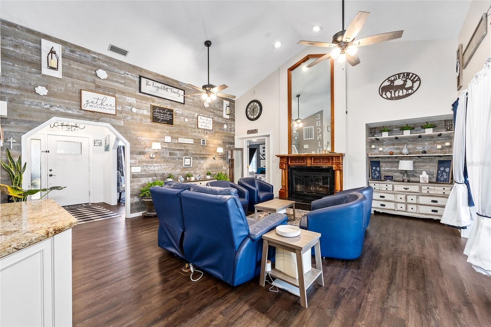 Stylish and spacious 4-bedroom, 3-bath home on a landscaped corner lot with vinyl fencing, offering both comfort and function. Inside, enjoy soaring ceilings, a decorative fireplace, and an open-concept design that flows seamlessly from the granite kitchen with double oven into the living and dining areas. A versatile bonus room makes the perfect game room, theater, or flex space, while the large dining room is currently set up as an office. The primary suite features tray ceilings, a walk-in tiled shower, makeup vanity, and a private water closet. Accessibility is thoughtfully designed with wider doors and upgraded toilets. Recent updates include a new roof, HVAC, and water heater (all 2023) plus a UV air filtration system for peace of mind. Relax year-round in the screened lanai overlooking the backyard. Beautifully maintained with hardwood beneath vinyl plank, this home blends modern updates with timeless charm.
