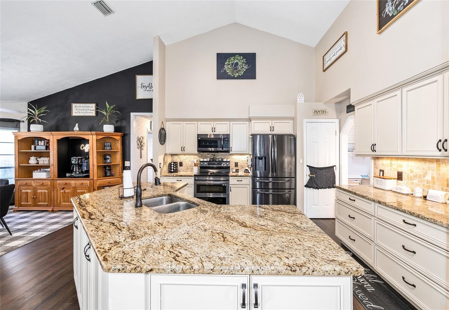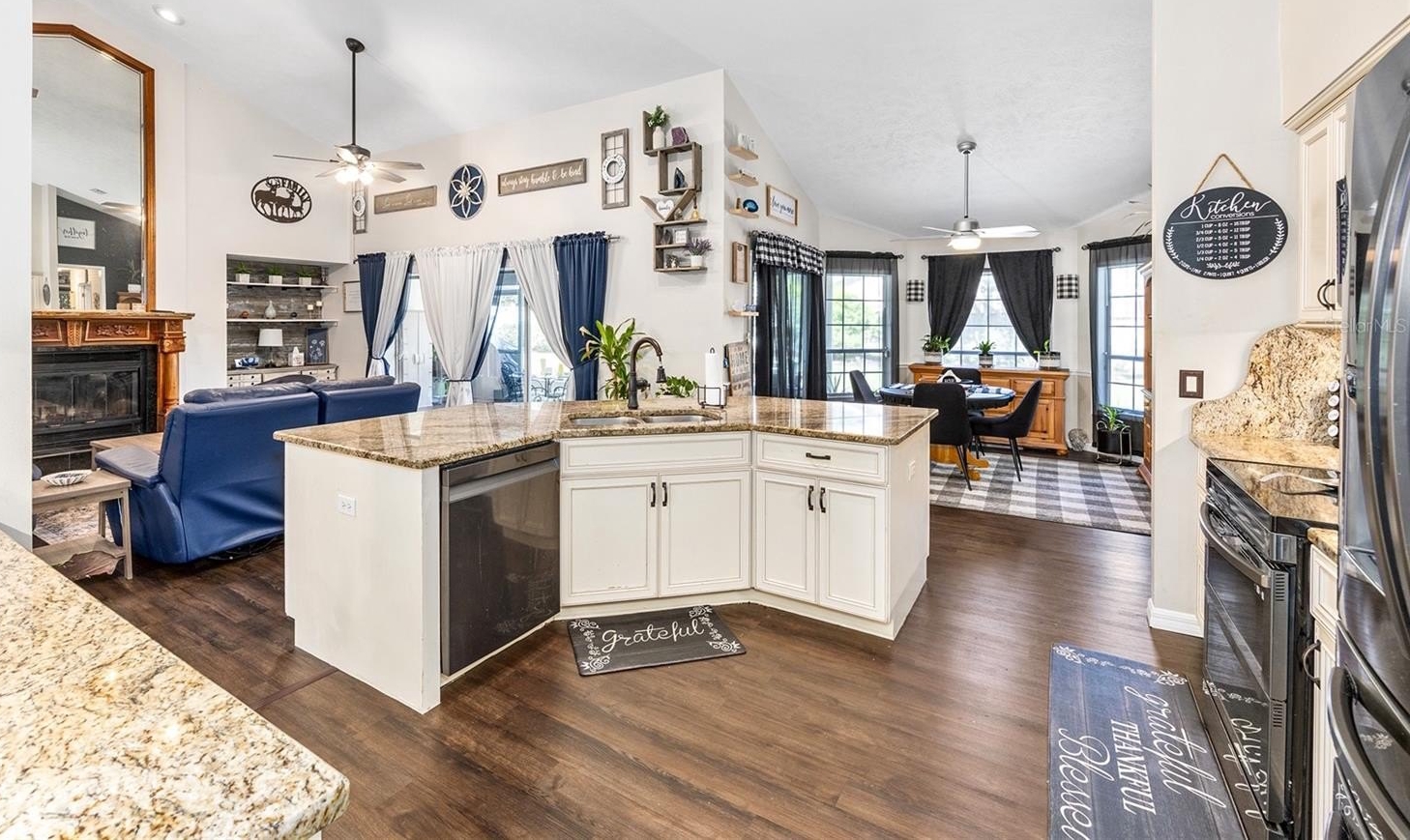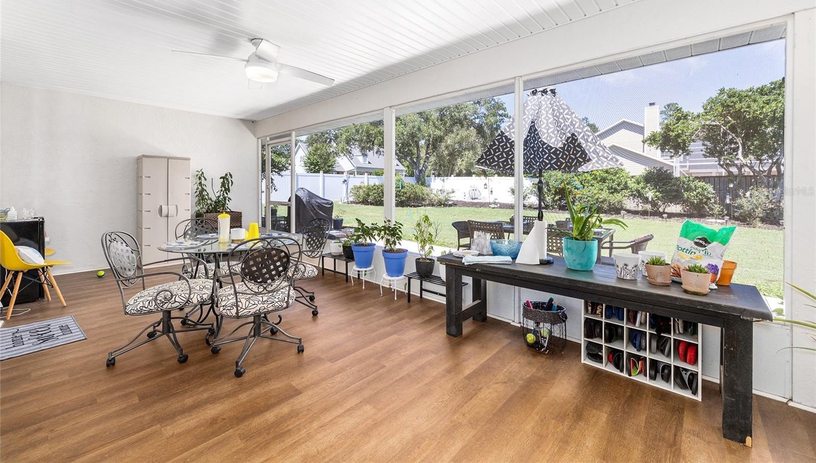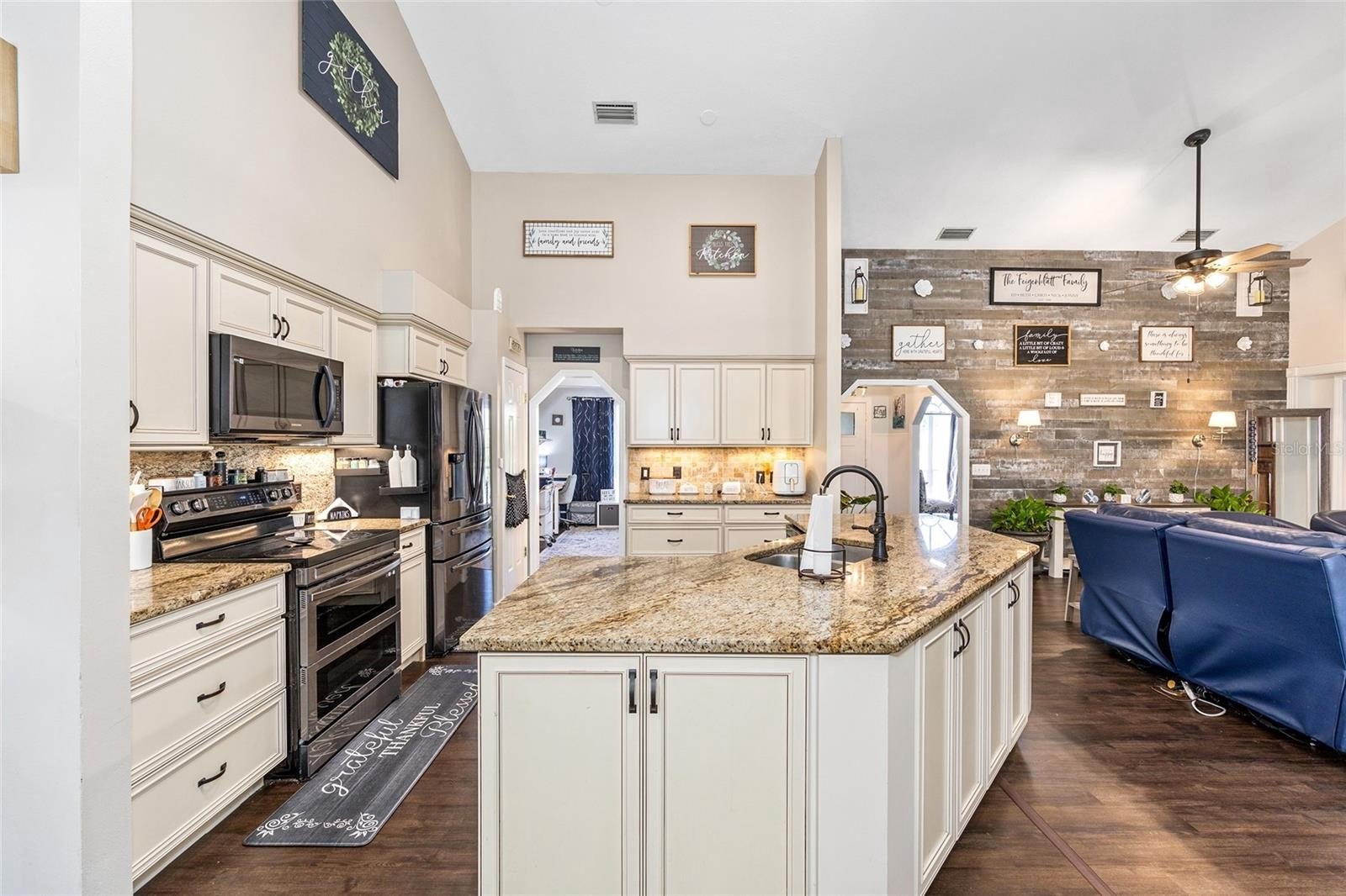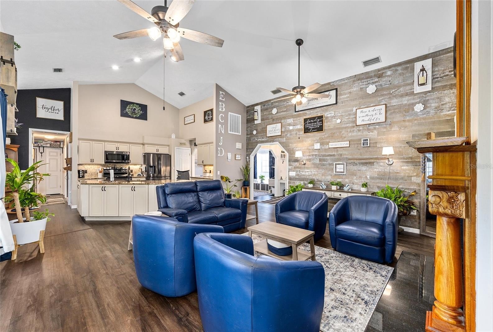 Stylish and spacious 4-bedroom, 3-bath home on a landscaped corner lot with vinyl fencing, offering both comfort and function. Inside, enjoy soaring ceilings, a decorative fireplace, and an open-concept design that flows seamlessly from the granite kitchen with double oven into the living and dining areas. A versatile bonus room makes the perfect game room, theater, or flex space, while the large dining room is currently set up as an office. The primary suite features tray ceilings, a walk-in tiled shower, makeup vanity, and a private water closet. Accessibility is thoughtfully designed with wider doors and upgraded toilets. Recent updates include a new roof, HVAC, and water heater (all 2023) plus a UV air filtration system for peace of mind. Relax year-round in the screened lanai overlooking the backyard. Beautifully maintained with hardwood beneath vinyl plank, this home blends modern updates with timeless charm.