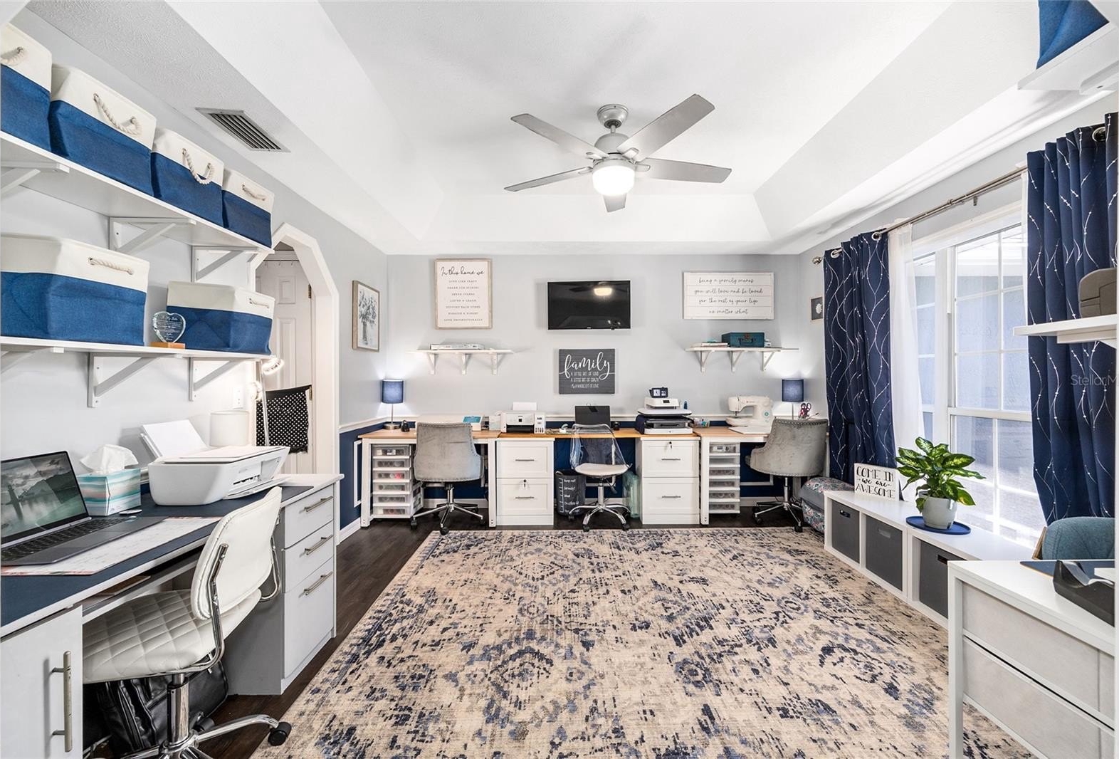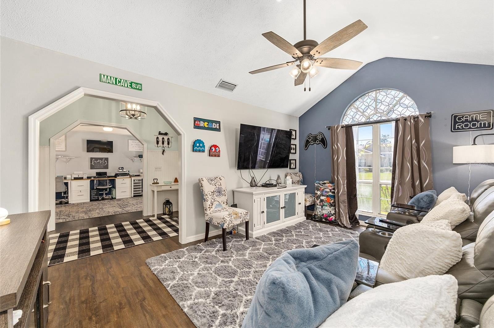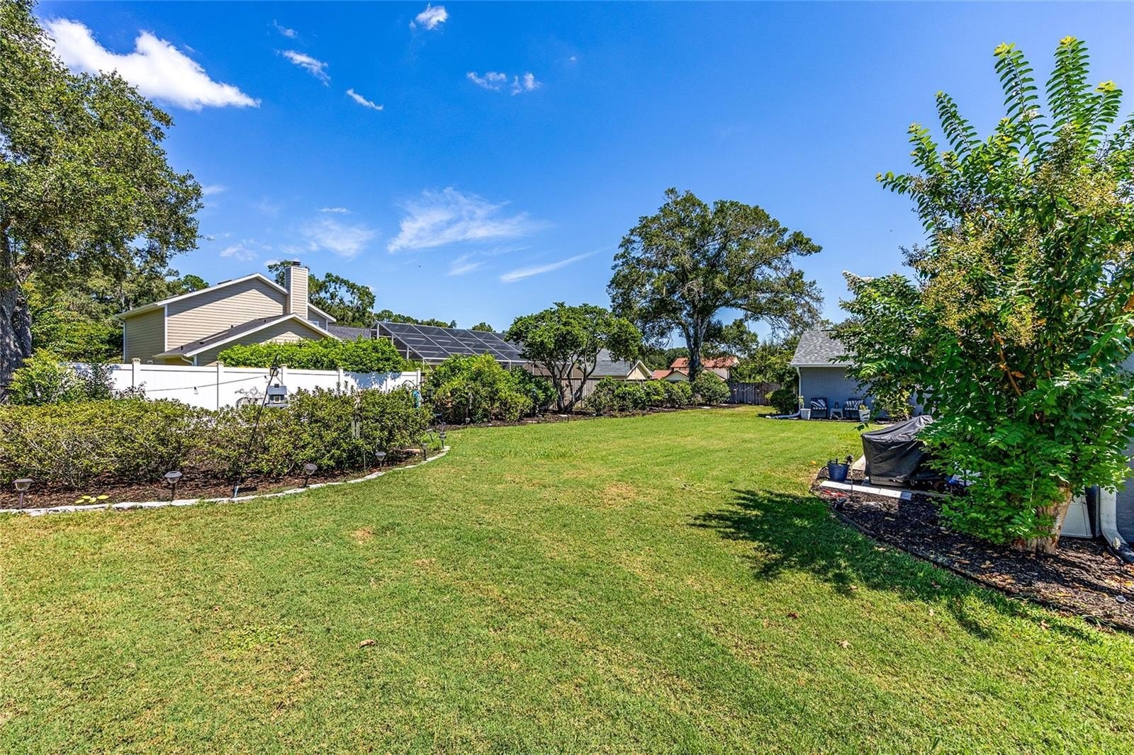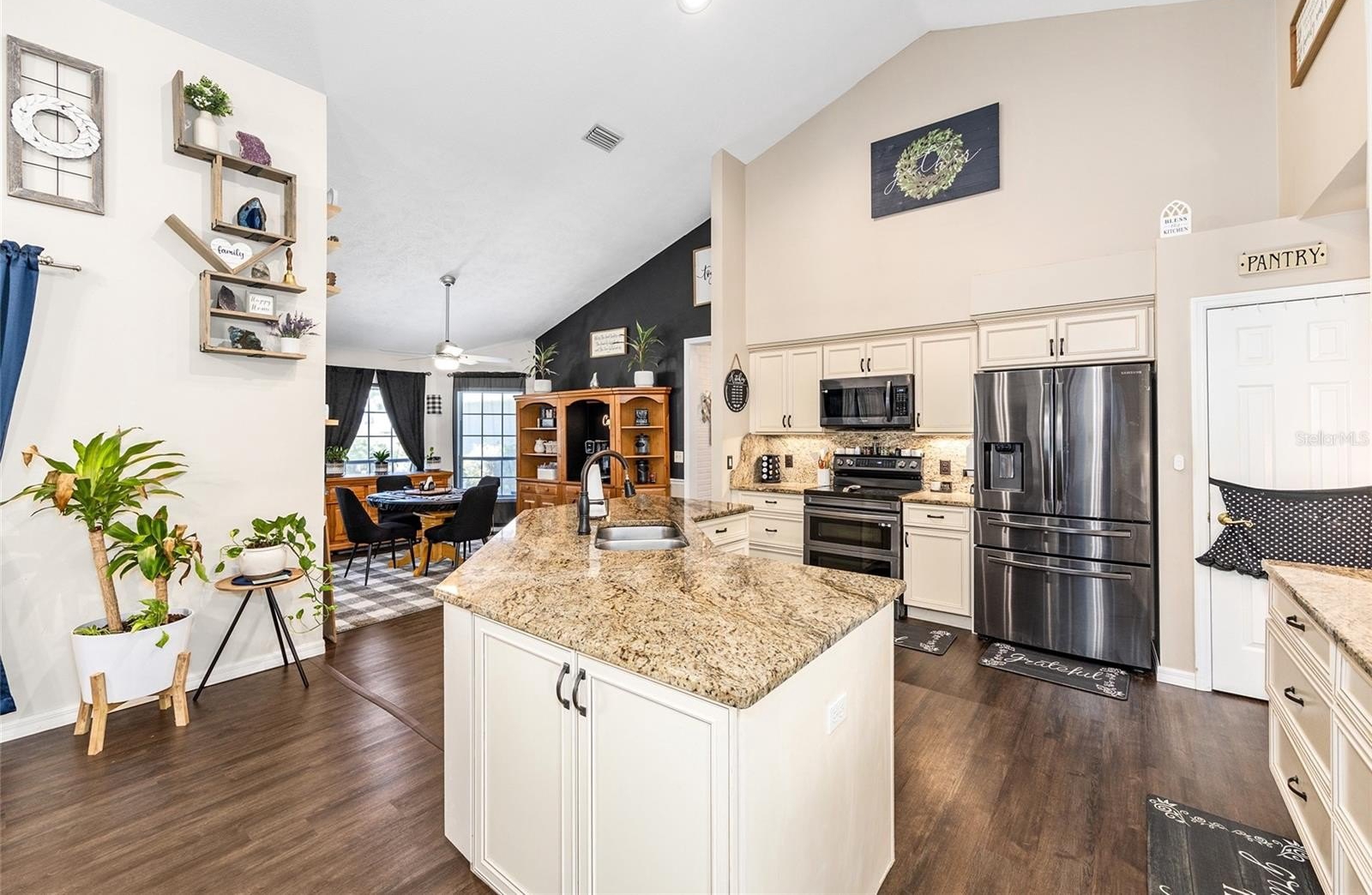 Stylish and spacious 4-bedroom, 3-bath home on a landscaped corner lot with vinyl fencing, offering both comfort and function. Inside, enjoy soaring ceilings, a decorative fireplace, and an open-concept design that flows seamlessly from the granite kitchen with double oven into the living and dining areas. A versatile bonus room makes the perfect game room, theater, or flex space, while the large dining room is currently set up as an office. The primary suite features tray ceilings, a walk-in tiled shower, makeup vanity, and a private water closet. Accessibility is thoughtfully designed with wider doors and upgraded toilets. Recent updates include a new roof, HVAC, and water heater (all 2023) plus a UV air filtration system for peace of mind. Relax year-round in the screened lanai overlooking the backyard. Beautifully maintained with hardwood beneath vinyl plank, this home blends modern updates with timeless charm.