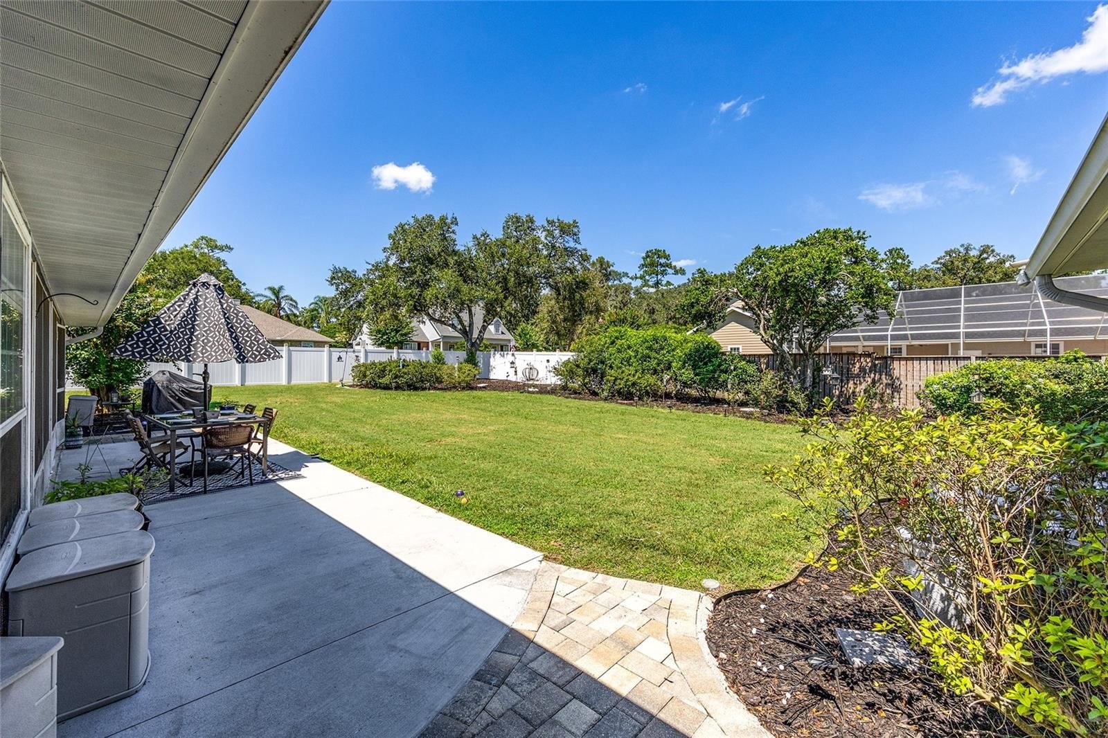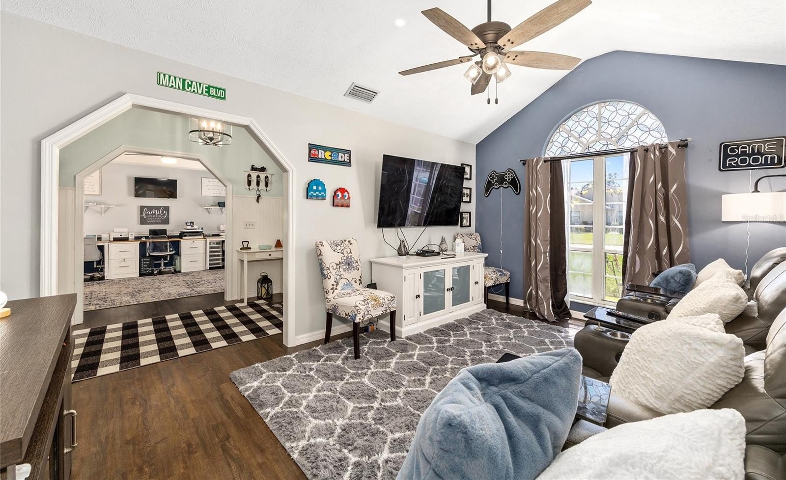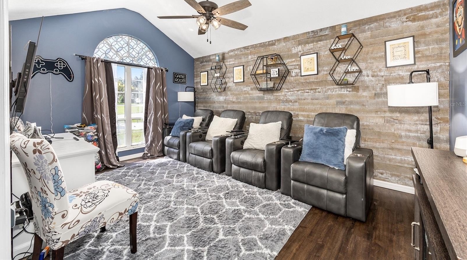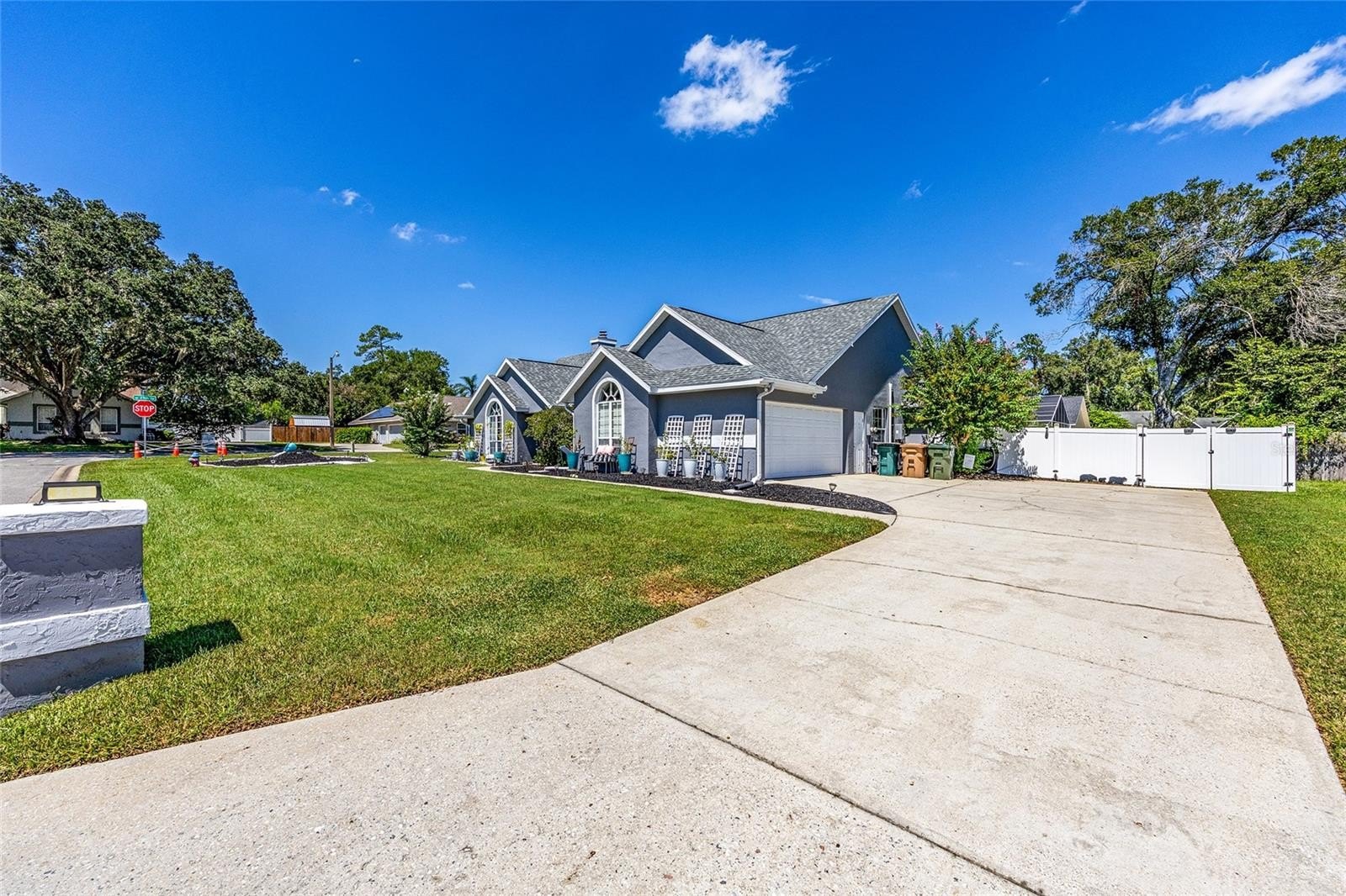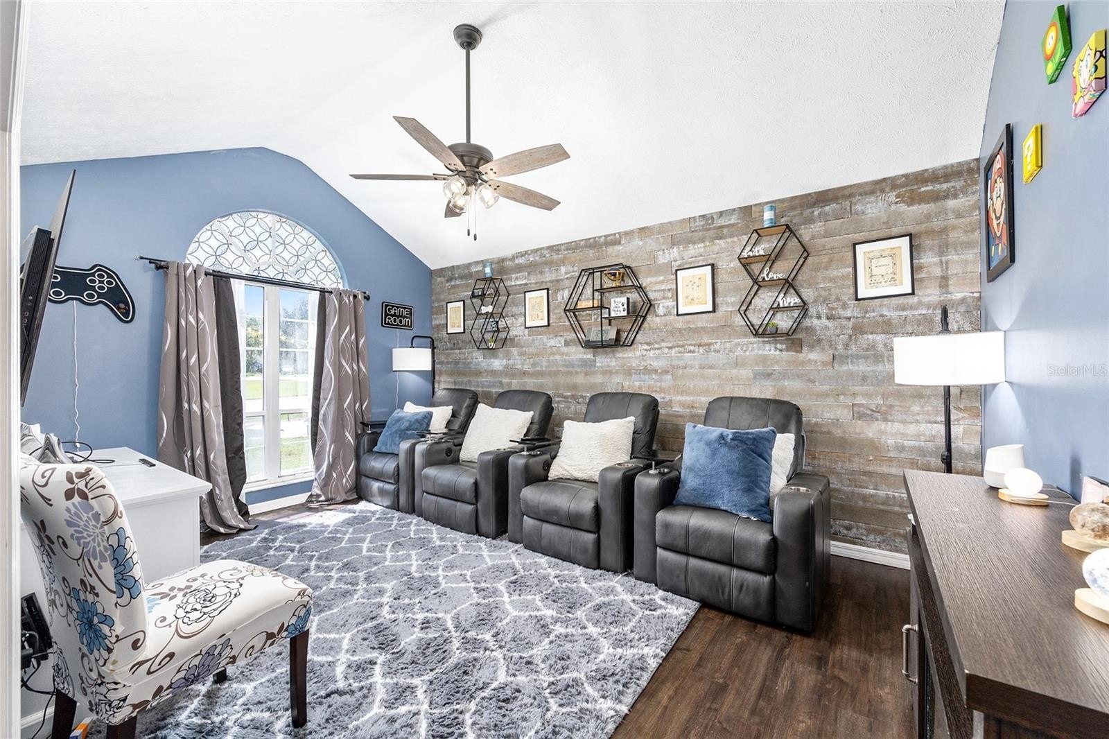 Stylish and spacious 4-bedroom, 3-bath home on a landscaped corner lot with vinyl fencing, offering both comfort and function. Inside, enjoy soaring ceilings, a decorative fireplace, and an open-concept design that flows seamlessly from the granite kitchen with double oven into the living and dining areas. A versatile bonus room makes the perfect game room, theater, or flex space, while the large dining room is currently set up as an office. The primary suite features tray ceilings, a walk-in tiled shower, makeup vanity, and a private water closet. Accessibility is thoughtfully designed with wider doors and upgraded toilets. Recent updates include a new roof, HVAC, and water heater (all 2023) plus a UV air filtration system for peace of mind. Relax year-round in the screened lanai overlooking the backyard. Beautifully maintained with hardwood beneath vinyl plank, this home blends modern updates with timeless charm.