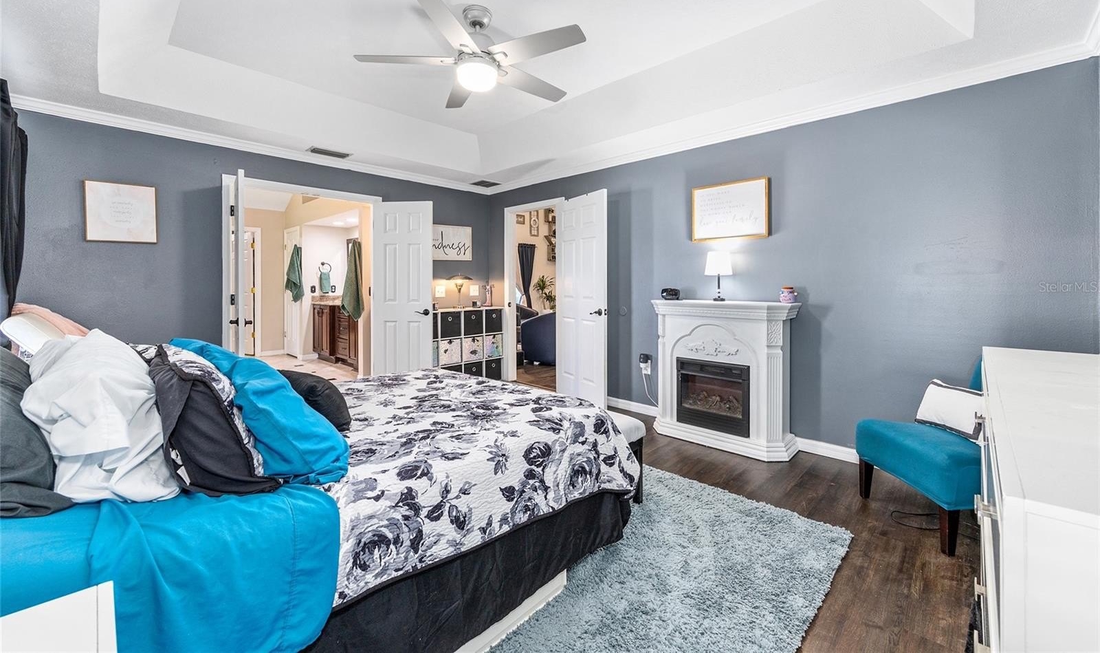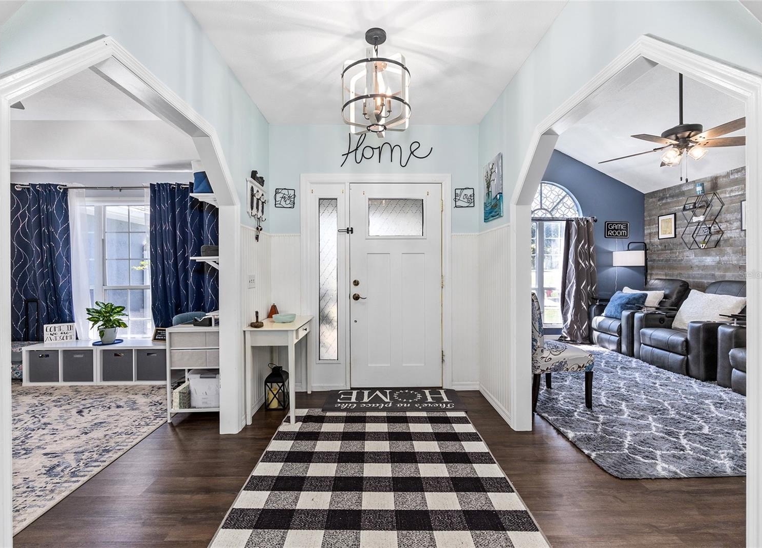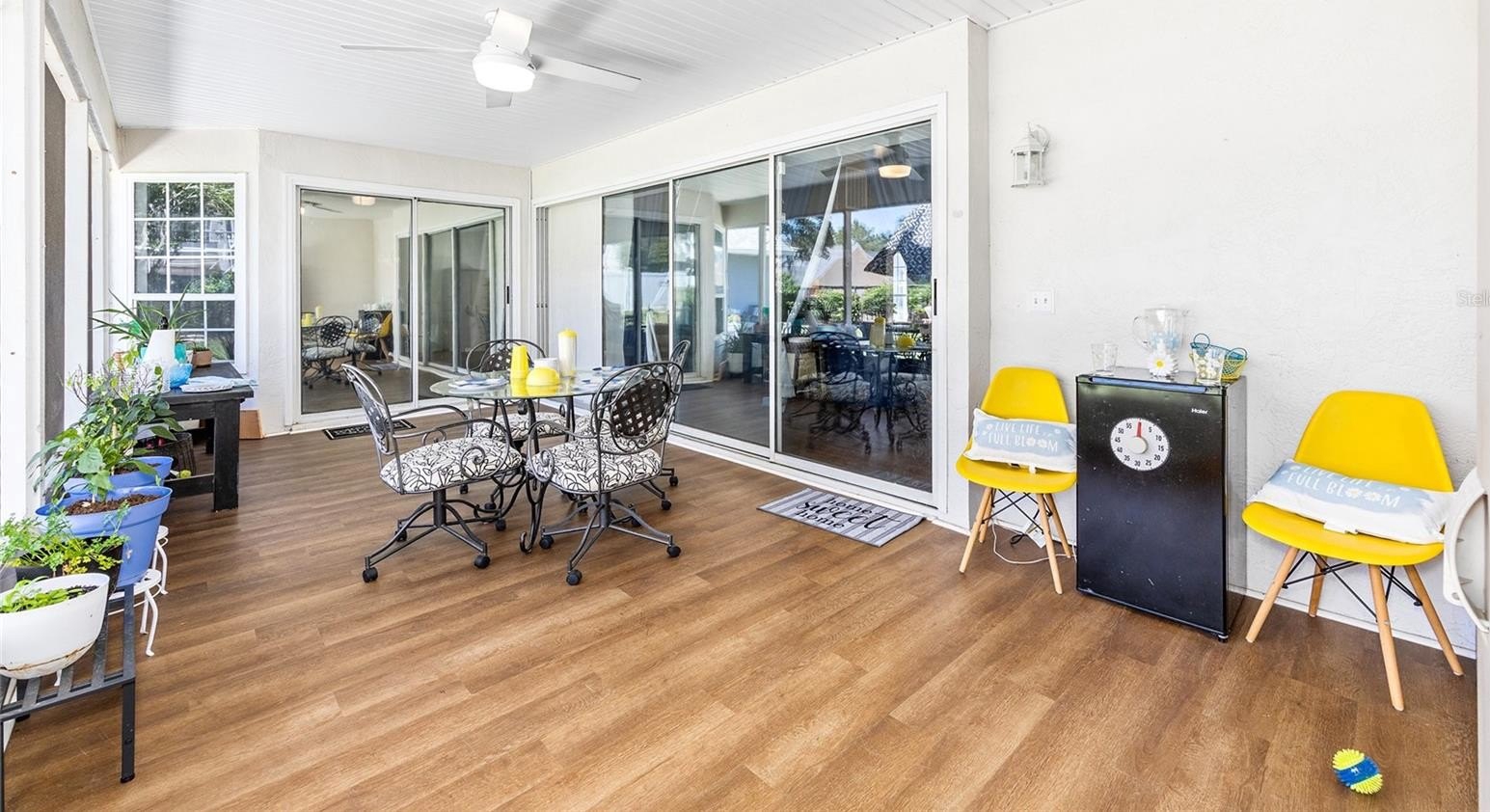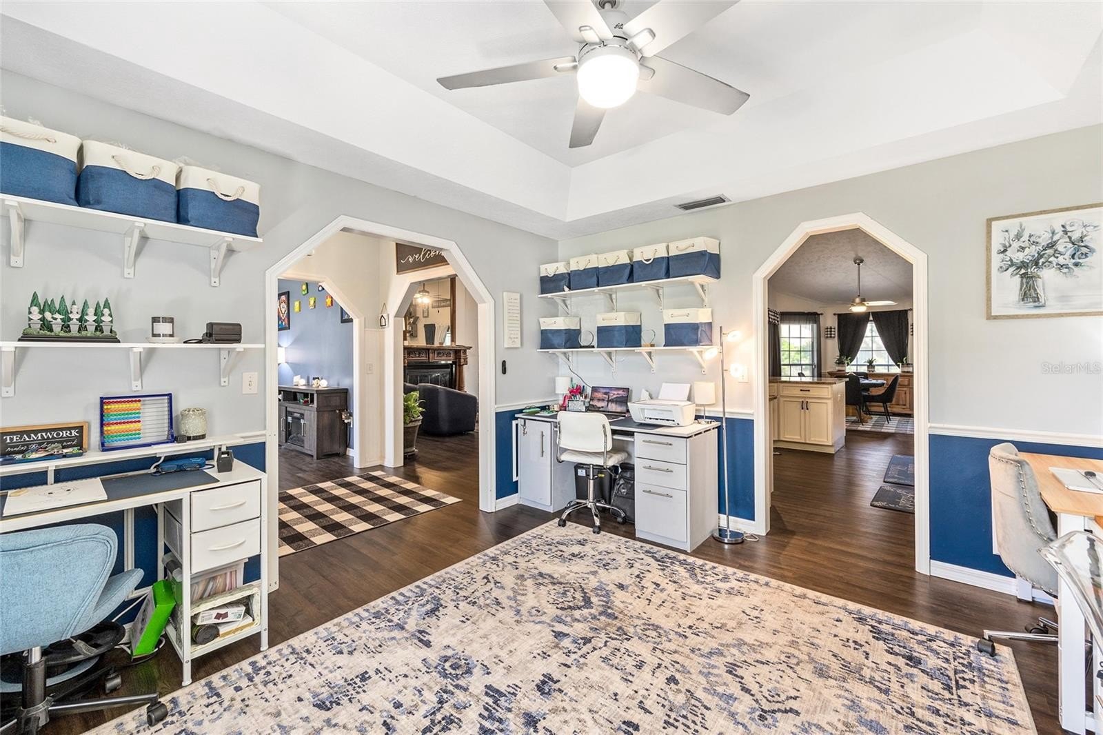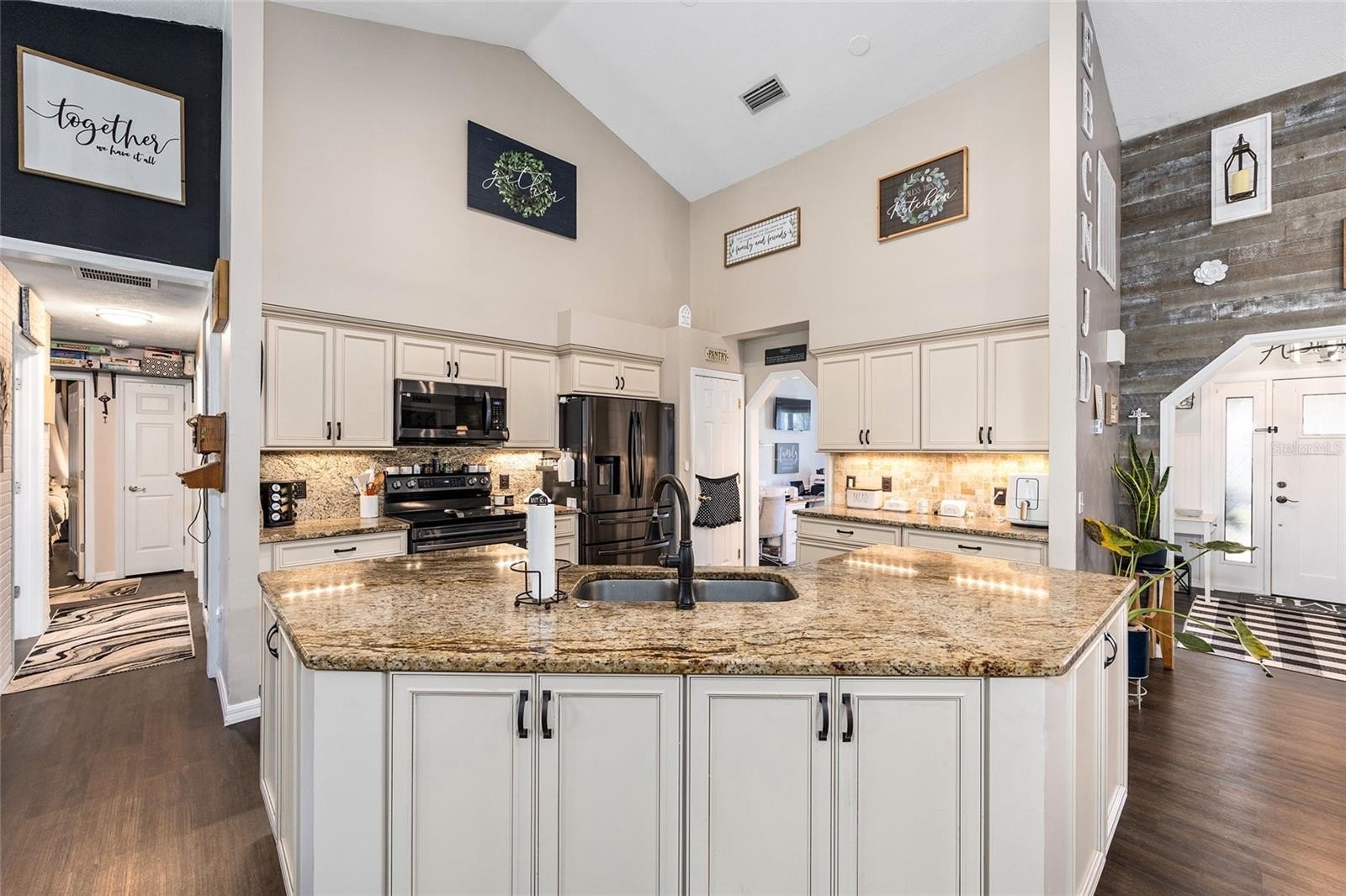 Stylish and spacious 4-bedroom, 3-bath home on a landscaped corner lot with vinyl fencing, offering both comfort and function. Inside, enjoy soaring ceilings, a decorative fireplace, and an open-concept design that flows seamlessly from the granite kitchen with double oven into the living and dining areas. A versatile bonus room makes the perfect game room, theater, or flex space, while the large dining room is currently set up as an office. The primary suite features tray ceilings, a walk-in tiled shower, makeup vanity, and a private water closet. Accessibility is thoughtfully designed with wider doors and upgraded toilets. Recent updates include a new roof, HVAC, and water heater (all 2023) plus a UV air filtration system for peace of mind. Relax year-round in the screened lanai overlooking the backyard. Beautifully maintained with hardwood beneath vinyl plank, this home blends modern updates with timeless charm.