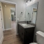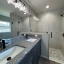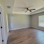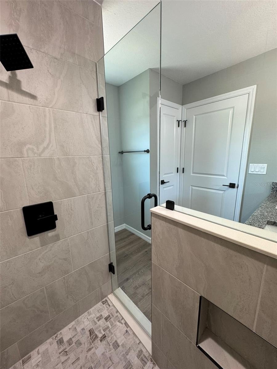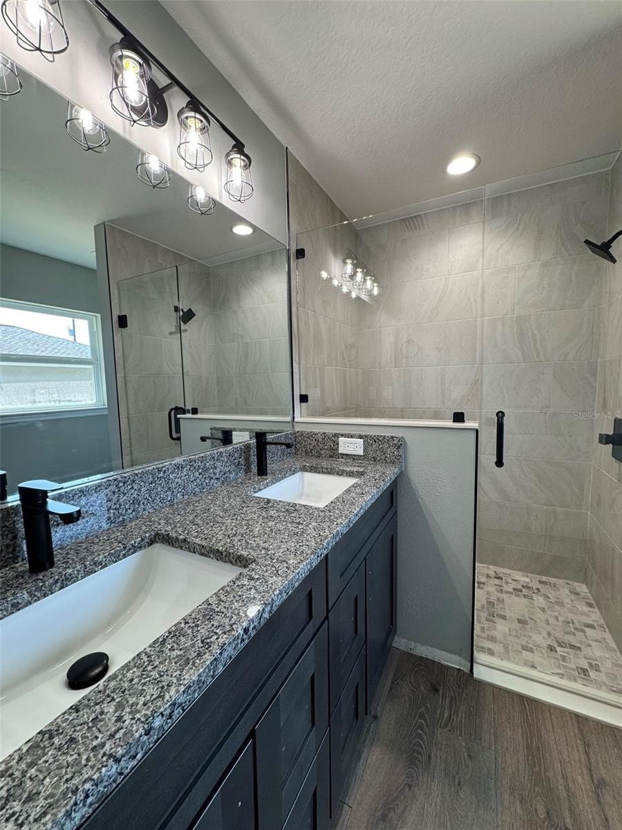 The owner's suite features a tray ceiling, lighted ceiling fan, a generous walk-in closet, and a stylish en-suite. The master bath features a dual sink vanity, and a tiled walk-in shower surrounded by a sleek frameless glass enclosure, and a linen closet. Guest bedrooms and a full bath are situated on the opposite side of the home, ideal for family or visitors. The kitchen is a true centerpiece, featuring a large island perfect for meal prep and casual dining, abundant solid wood cabinetry with soft-close doors, granite countertops, a pantry for added storage and convenience, and completed with top of the line GE appliances. Both the kitchen and bathrooms reflect quality craftsmanship and timeless style.