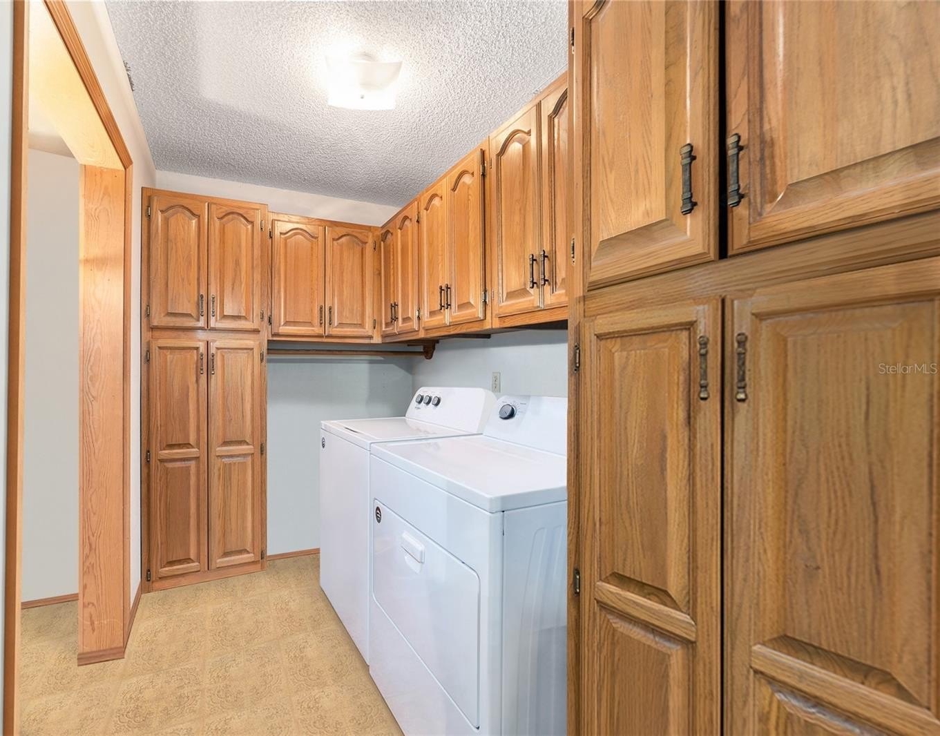 Inside, the home features an open layout with a well-designed kitchen offering abundant cabinetry and an eat-at bar that opens to the dining area—ideal for family meals and entertaining. A dedicated laundry room provides even more storage with built-in cabinets.