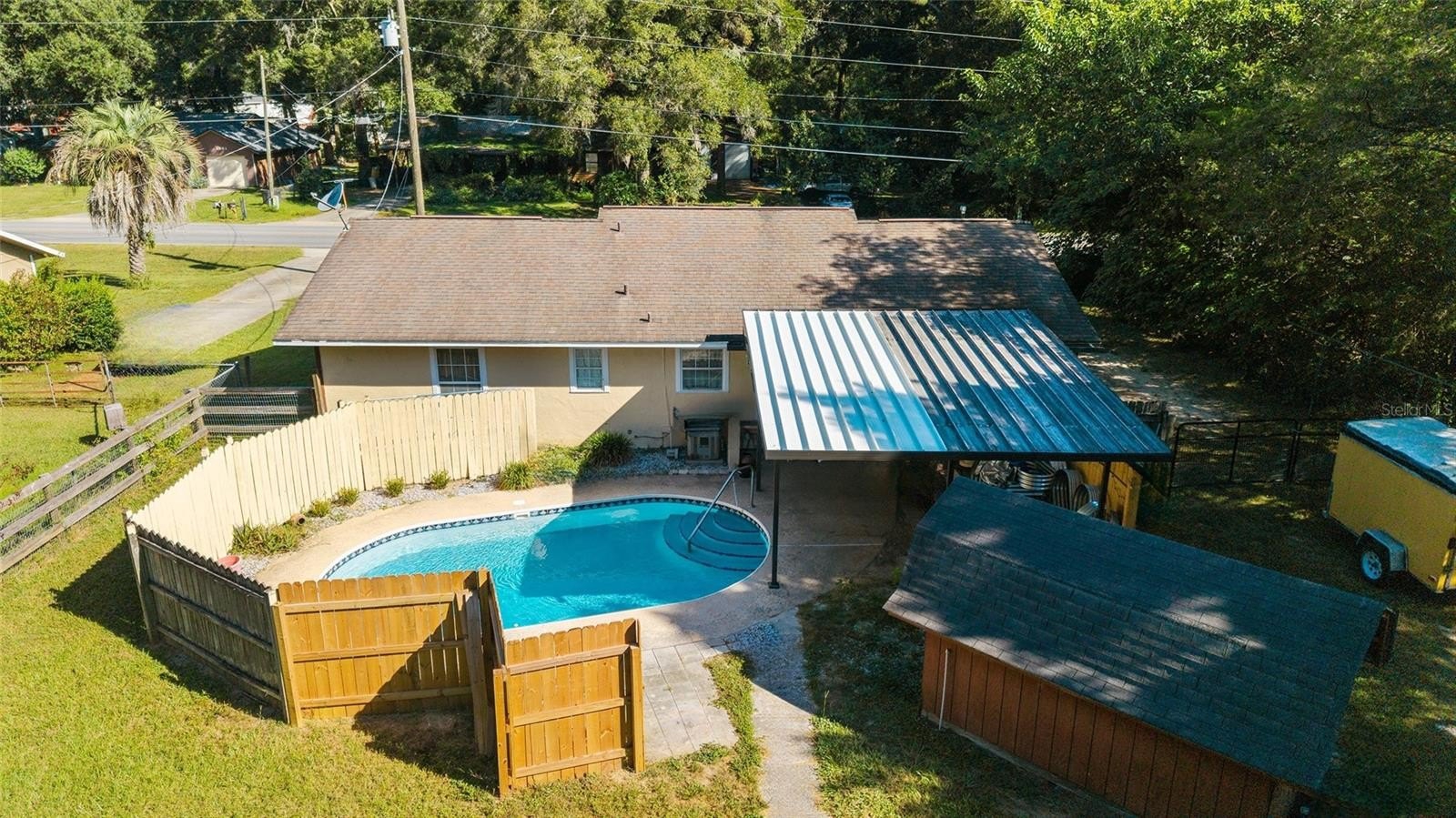 Step out the back door to your private outdoor oasis. The backyard is fully fenced and includes an in-ground pool with its own privacy fencing, creating a quiet, secluded space to relax and unwind. A new covered patio area adds shade and comfort for year-round enjoyment. Additional buildings include a storage shed and a large 24x32 wood building, perfect for a workshop, hobby space, or extra storage.