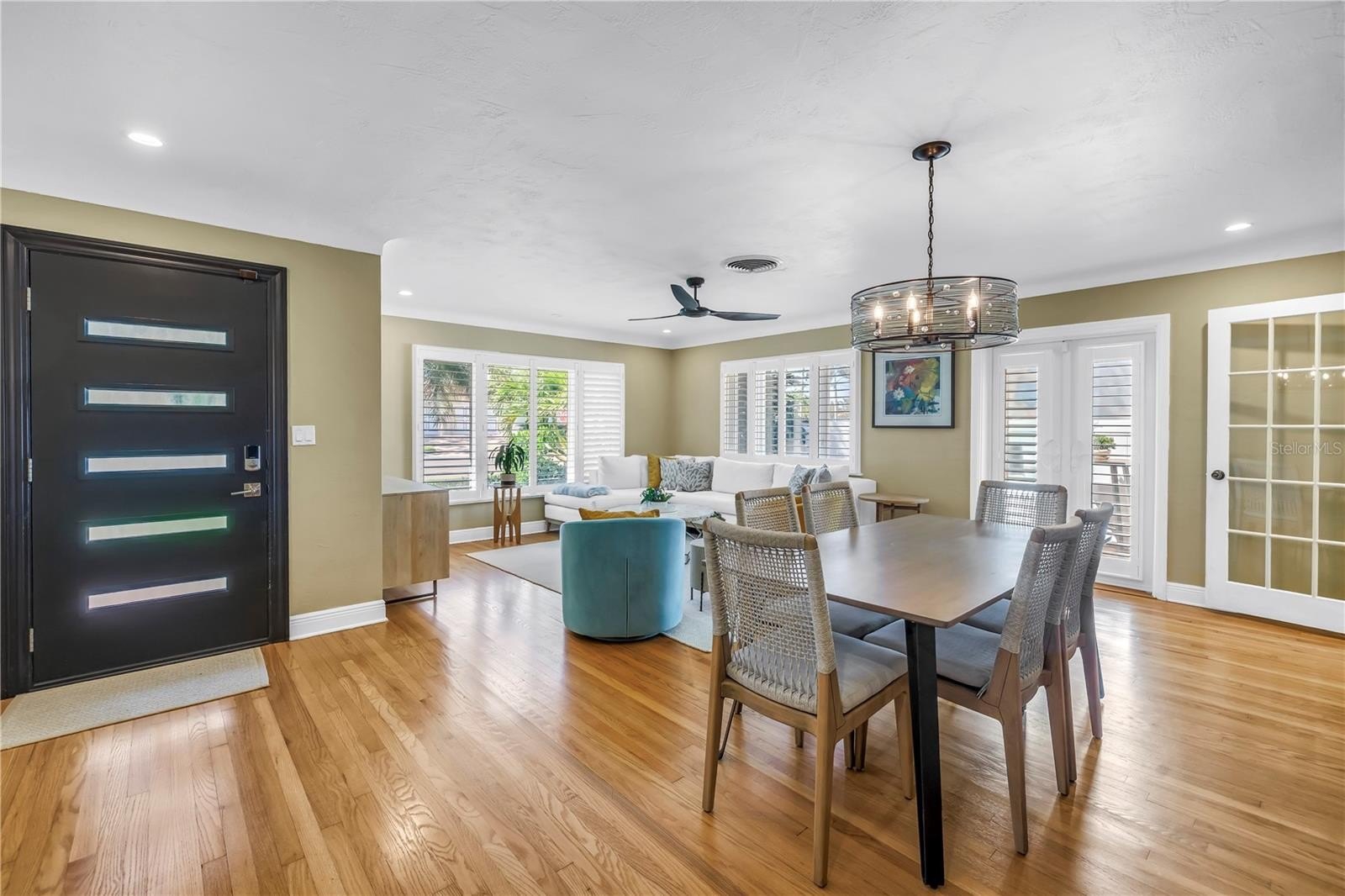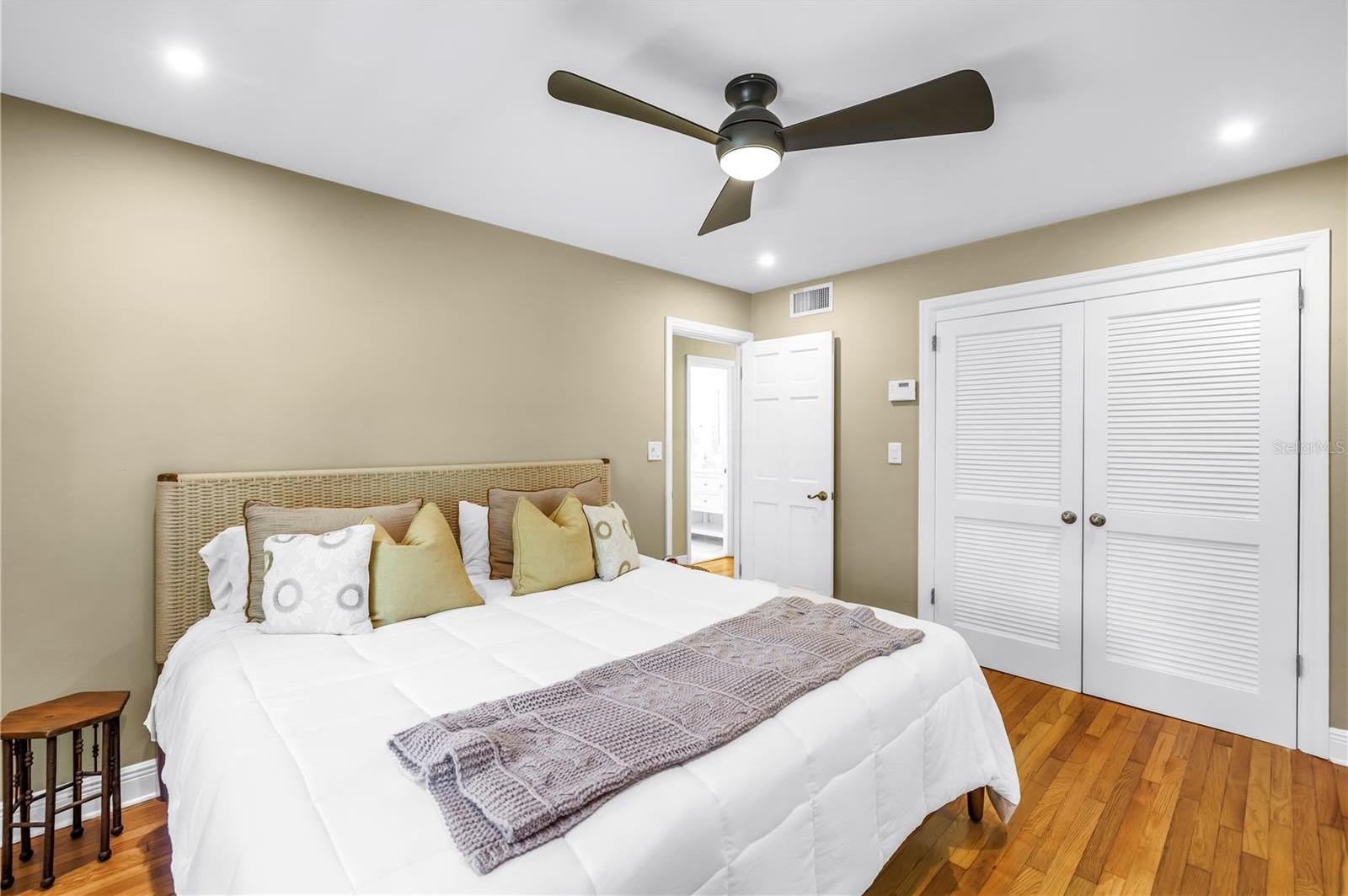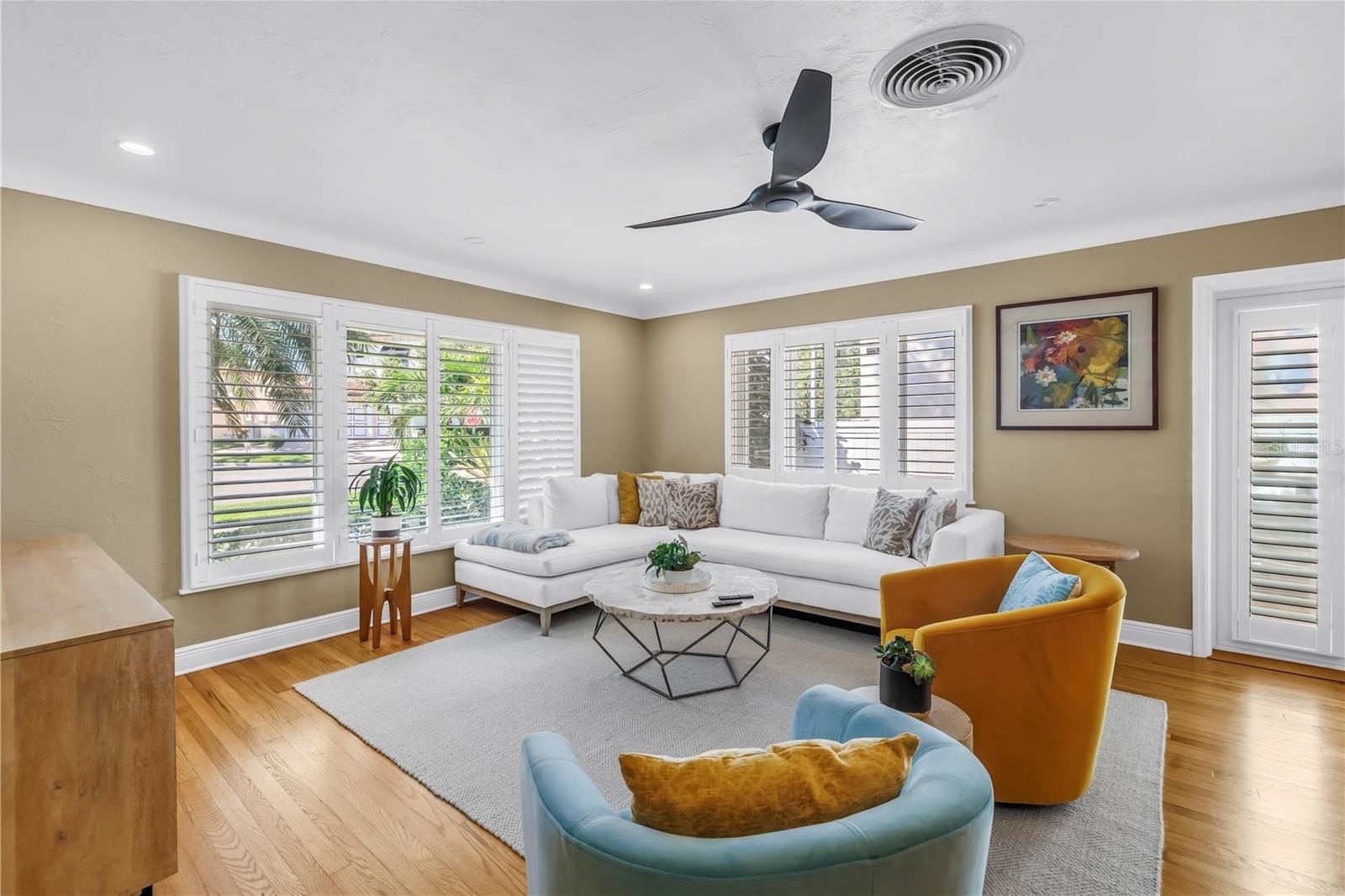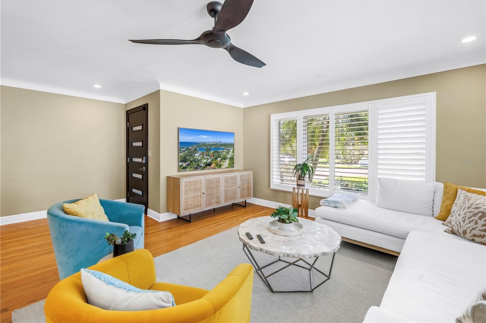 Welcome to this beautifully updated 2-bedroom, 2-bath residence in the heart of highly sought-after Snell Isle, just one block from Coffee Pot Bayou and minutes from vibrant downtown St. Petersburg. Inside, you'll find a light-filled open-concept floor plan with gleaming oak hardwood floors and custom plantation shutters throughout. The spacious living area flows seamlessly into a chef-inspired kitchen fully renovated in 2020, featuring KraftMaid soft-close shaker cabinetry, granite countertops, stainless steel appliances, and recessed lighting, perfect for entertaining or everyday living. Both bedrooms offer generous space and include cedar-lined closets with custom California Closet systems. The primary suite boasts a luxurious en-suite bath with a dual-sink waterfall-edge vanity, an oversized walk-in shower, and an additional custom walk-in closet for ample storage.