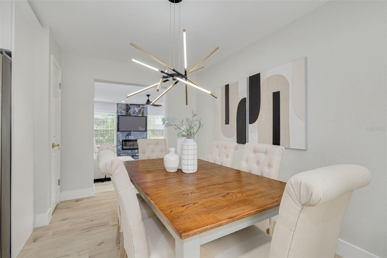 Featuring a modern open-concept design, the spacious living room, family room, dining area, and kitchen flow together beautifully — all finished with new waterproof luxury vinyl plank flooring and anchored by a striking contemporary electric fireplace, the centerpiece of the home.