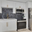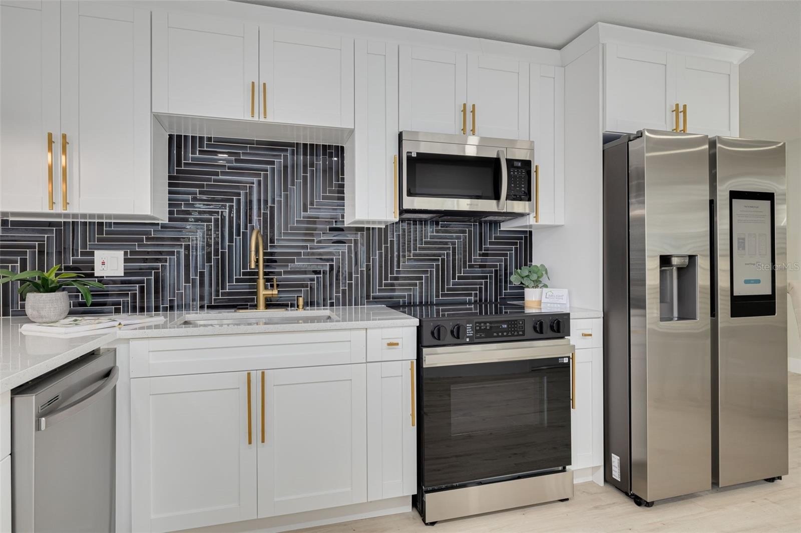 The newly renovated kitchen is absolutely stunning — bright and inviting, with abundant quartz countertops, a glass herringbone tile backsplash, soft-close shaker hardwood cabinets, and brand-new Samsung appliances, including a refrigerator with a built-in Family Smart Hub center.
