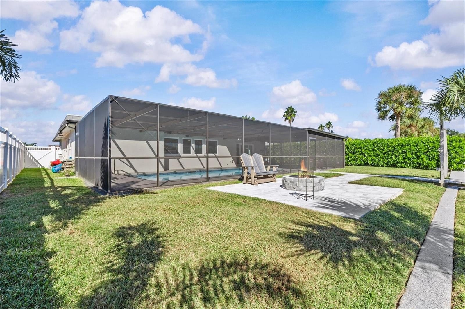Step outside to discover exceptional outdoor living spaces. There's a screened lanai that features all NEW screens and polyspartic coating, while the back patio received a premium $10,000 coating treatment in 2024. A NEW PAVER FIRE PIT with new paver walkways create the perfect gathering area. This yard is completely FENCED in! The RESURFACED Salt Water pool is a great space for entertaining with a spacious covered patio area overlooking the canal to the Gulf of America! The hurricane-rated garage features polyspartic coating and overhead door.
