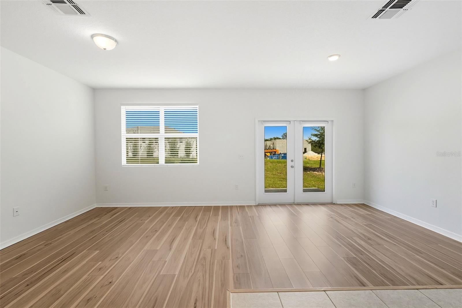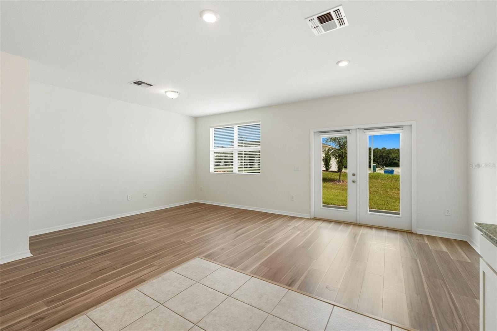 granite countertops and stainless-steel appliances. A large family room opens through double