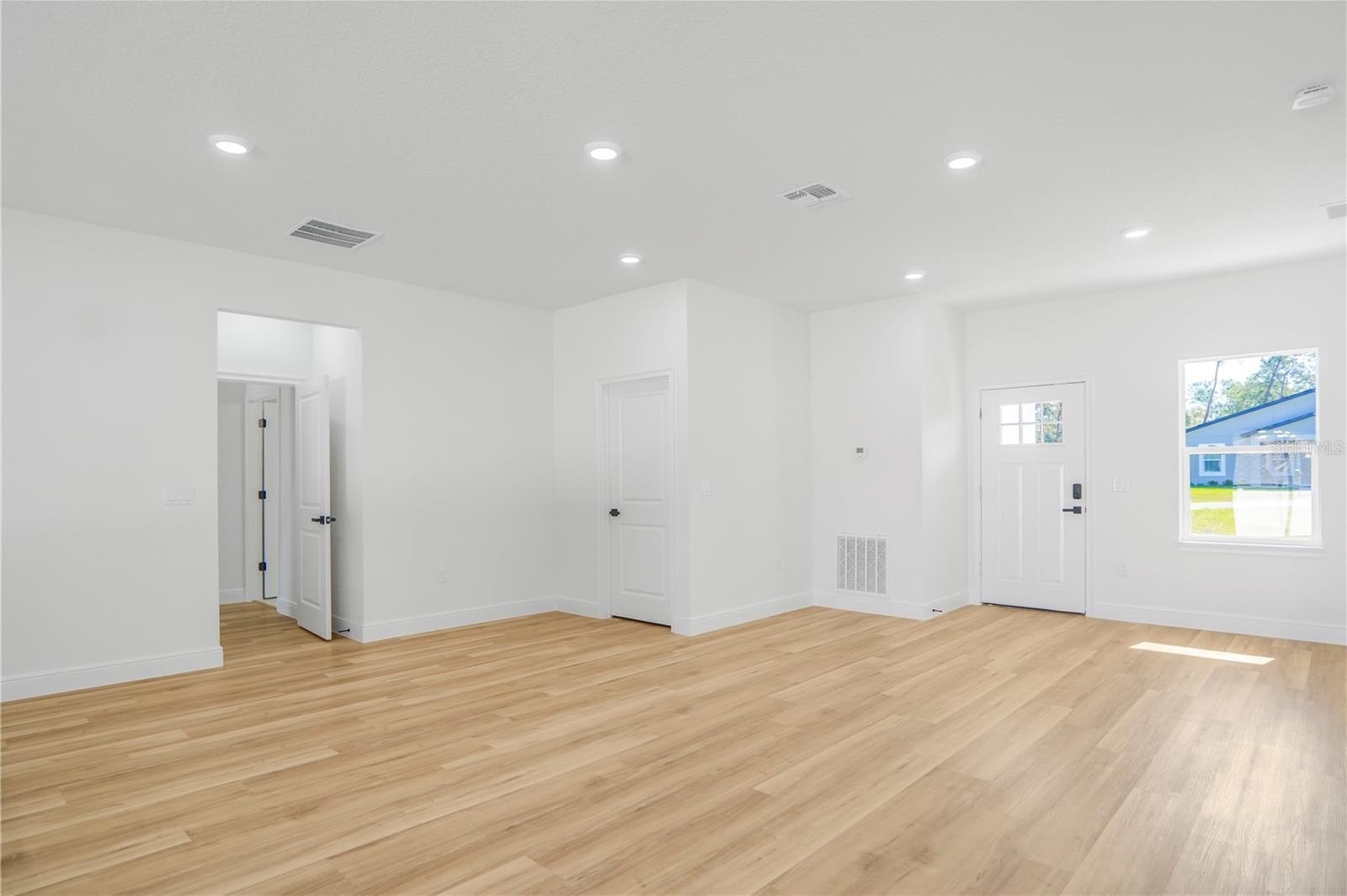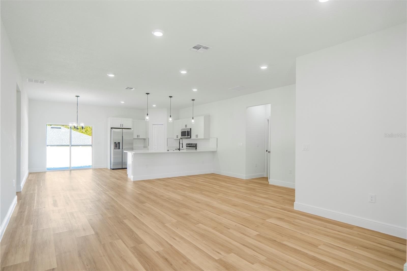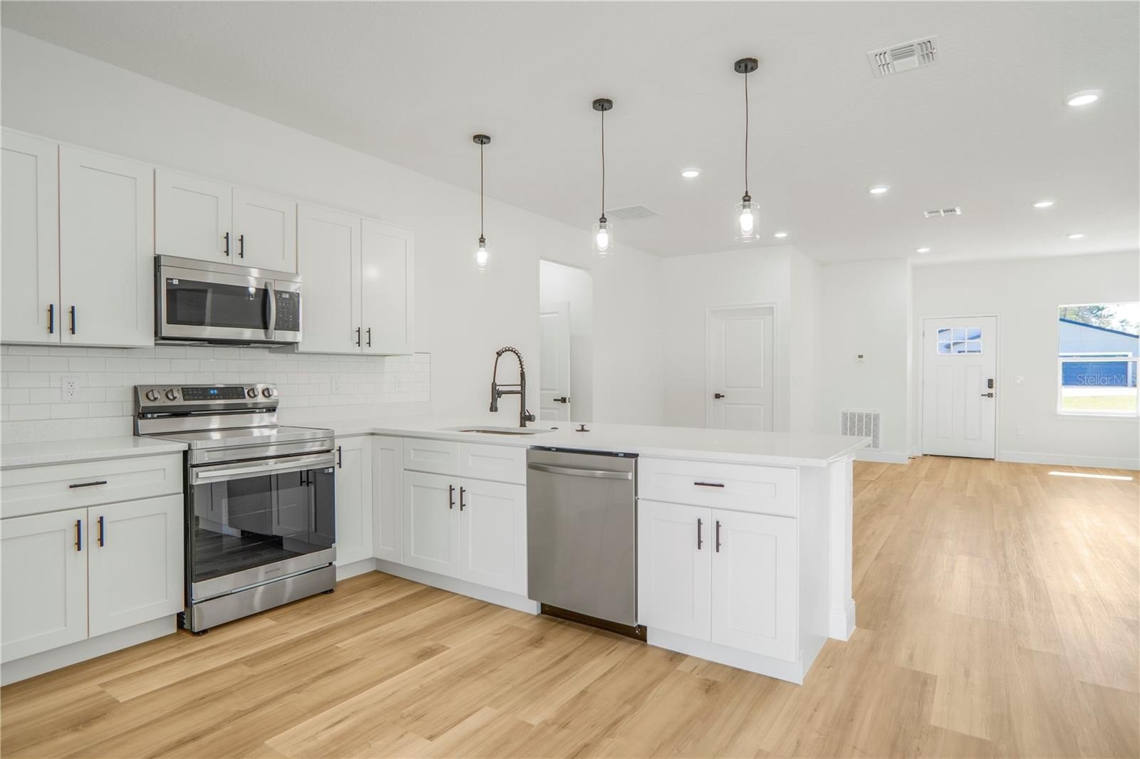 The open floor plan creates a seamless flow throughout the home, enhancing the spacious feel of the living areas. The large living and dining rooms are perfect for gatherings, whether hosting family dinners or enjoying quiet evenings at home. The beautifully designed kitchen is a chef’s dream, complete with solid wood cabinets, stunning stone countertops, and high-quality appliances—all included for your convenience.