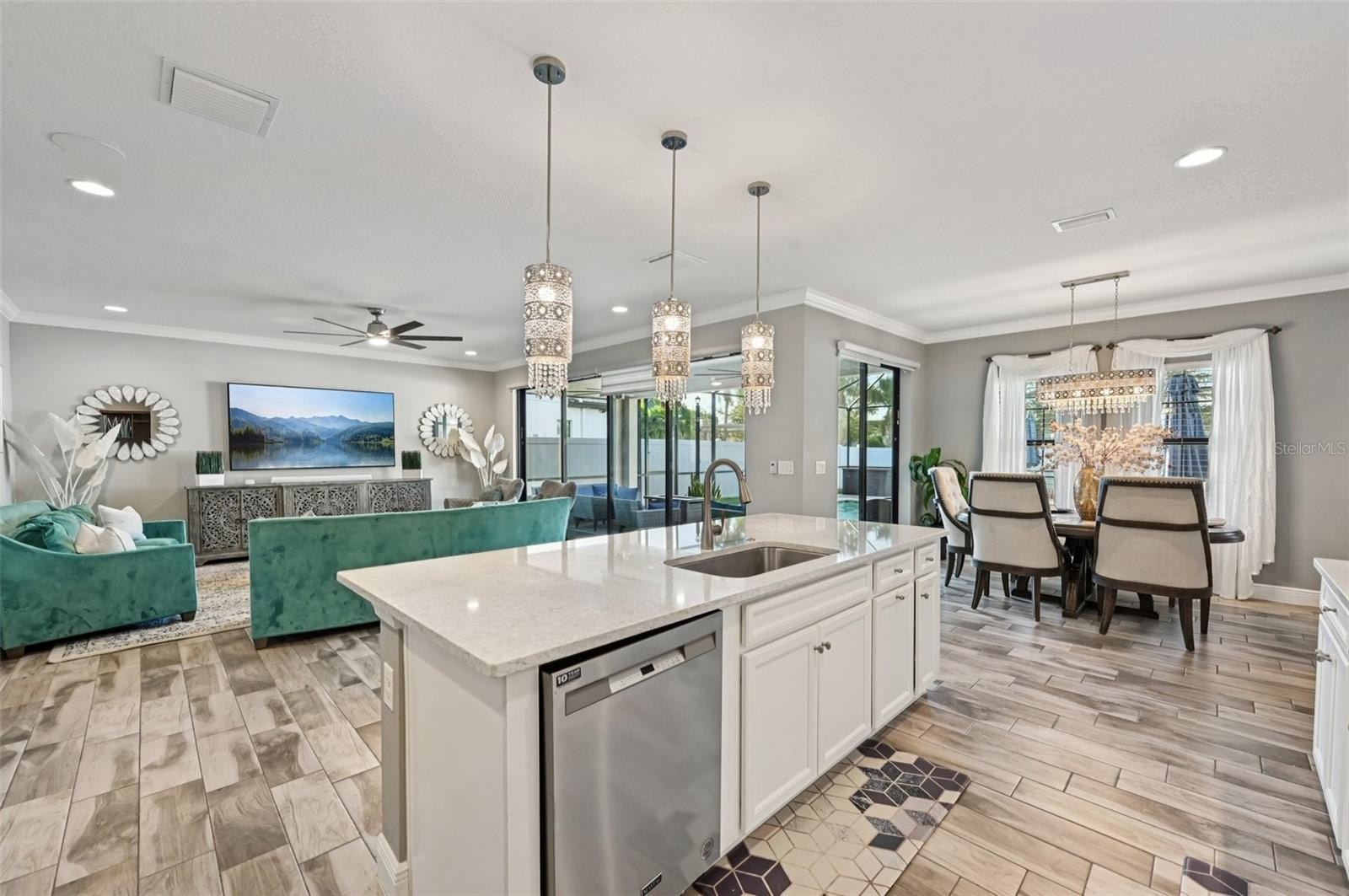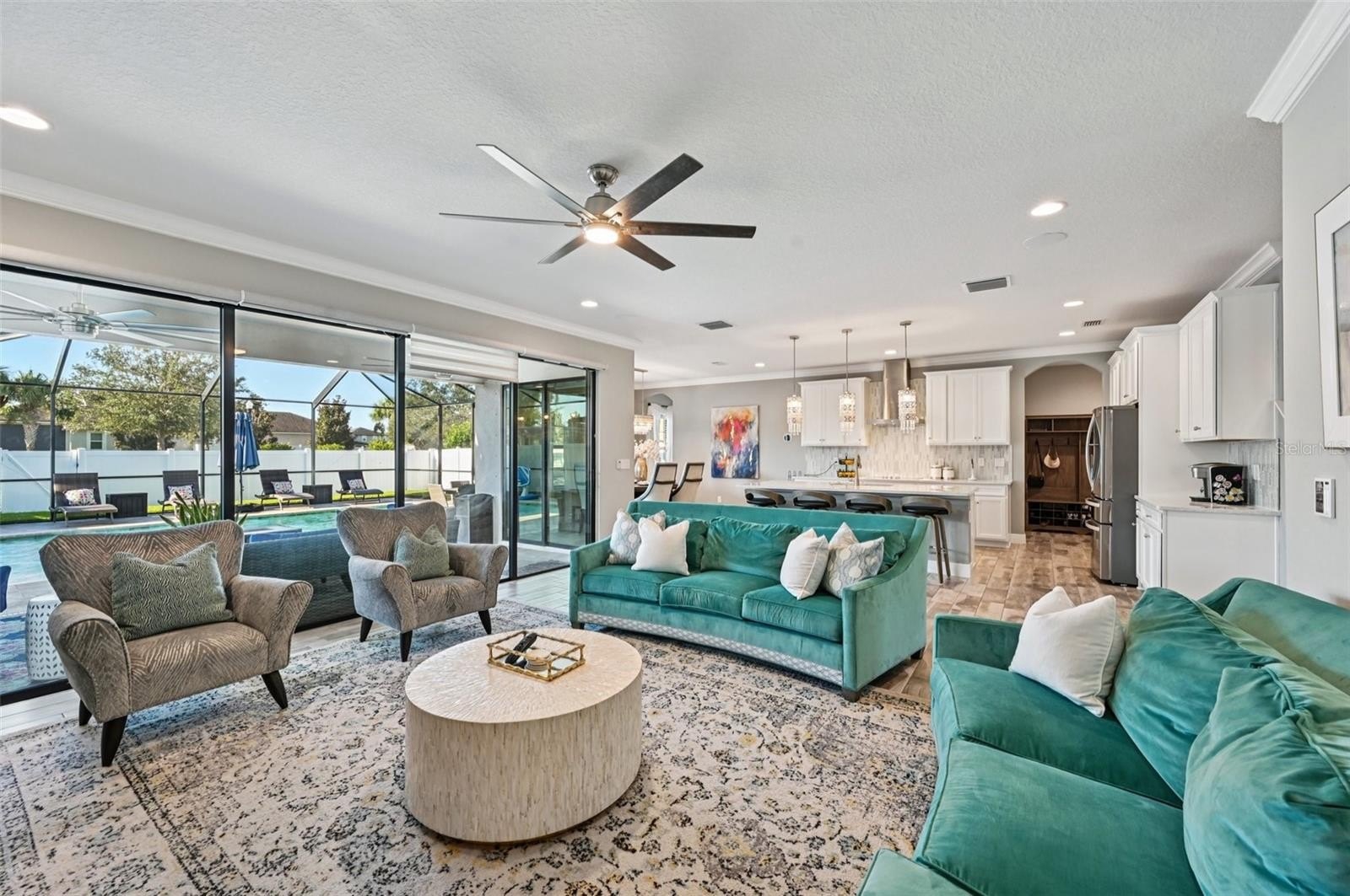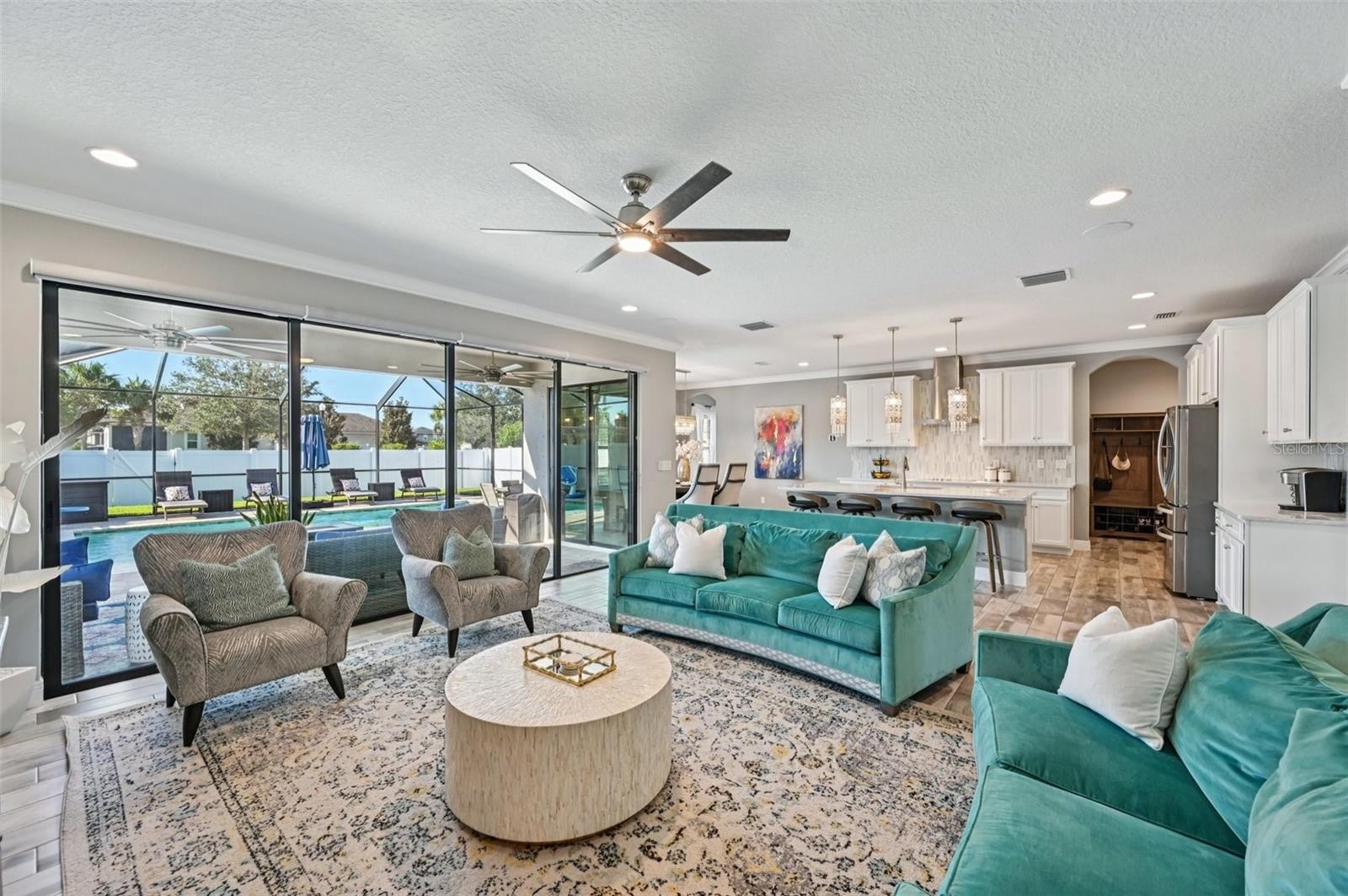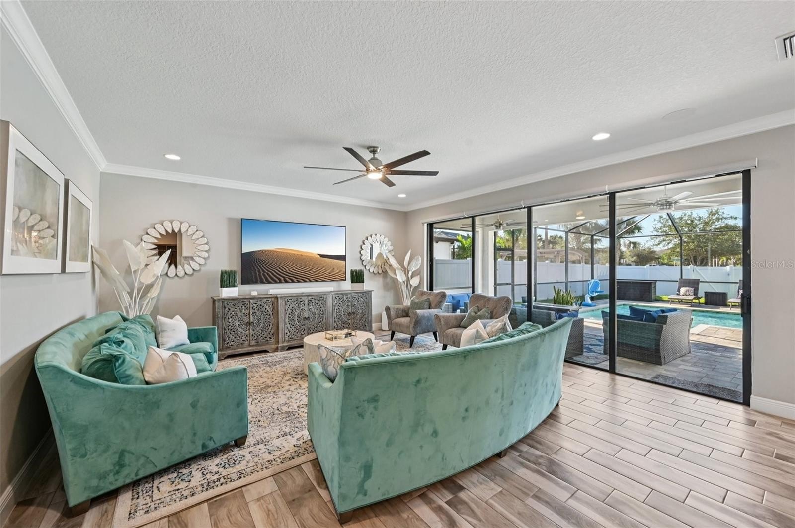 At the heart of the home is a gourmet kitchen with a built-in oven, sleek cooktop, and oversized walk-in pantry. Stylish wood-look tile floors carry through the open living and dining areas, creating a seamless flow with a touch of elegance. Walls of glass—quadruple sliders in the living room and double sliders off the dining room—invite natural light and showcase picturesque views of the saltwater pool and private backyard.