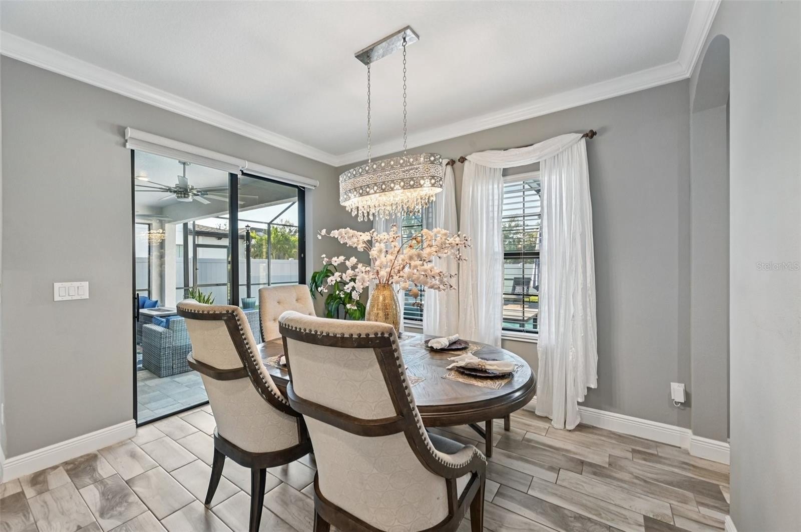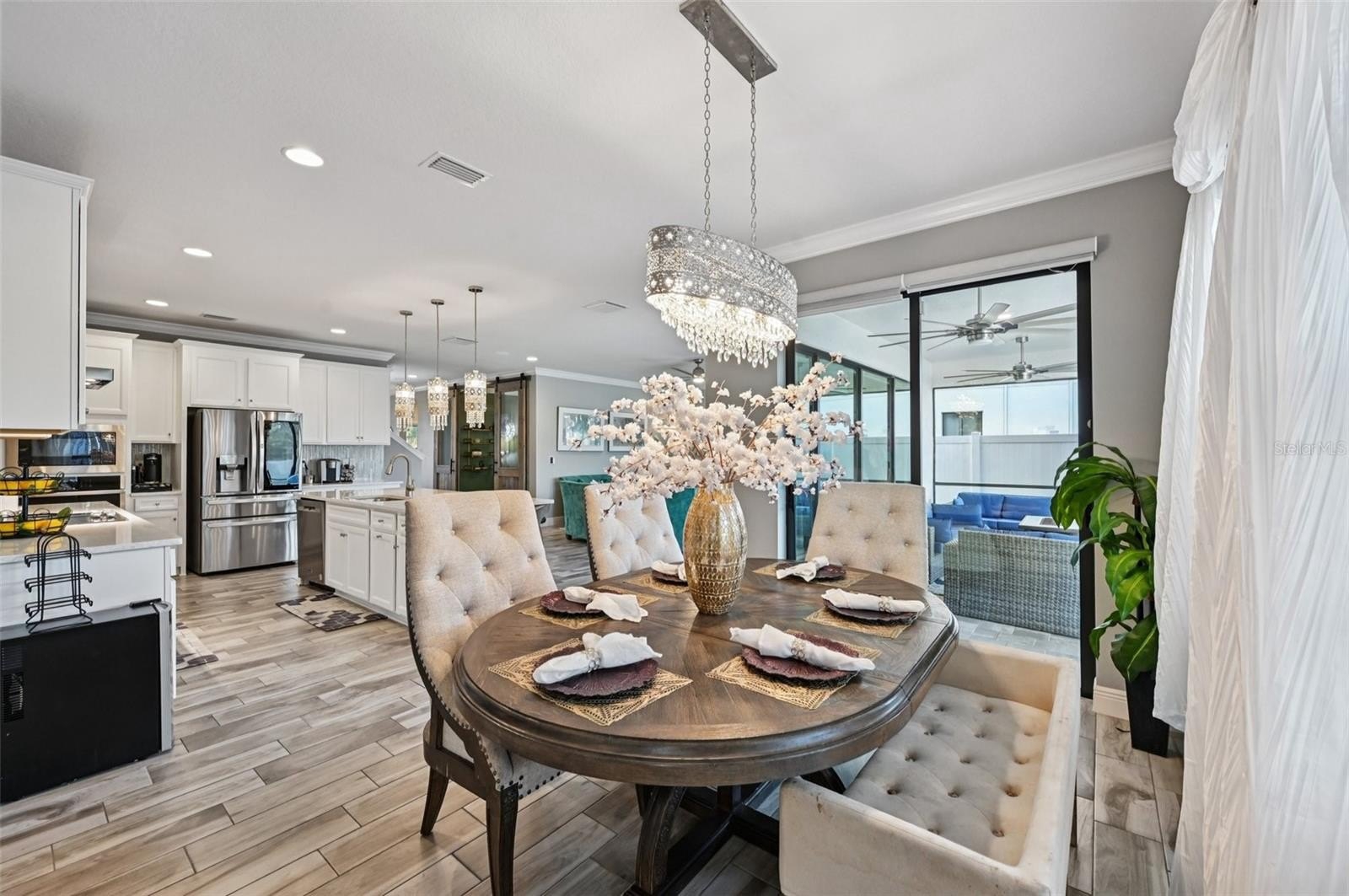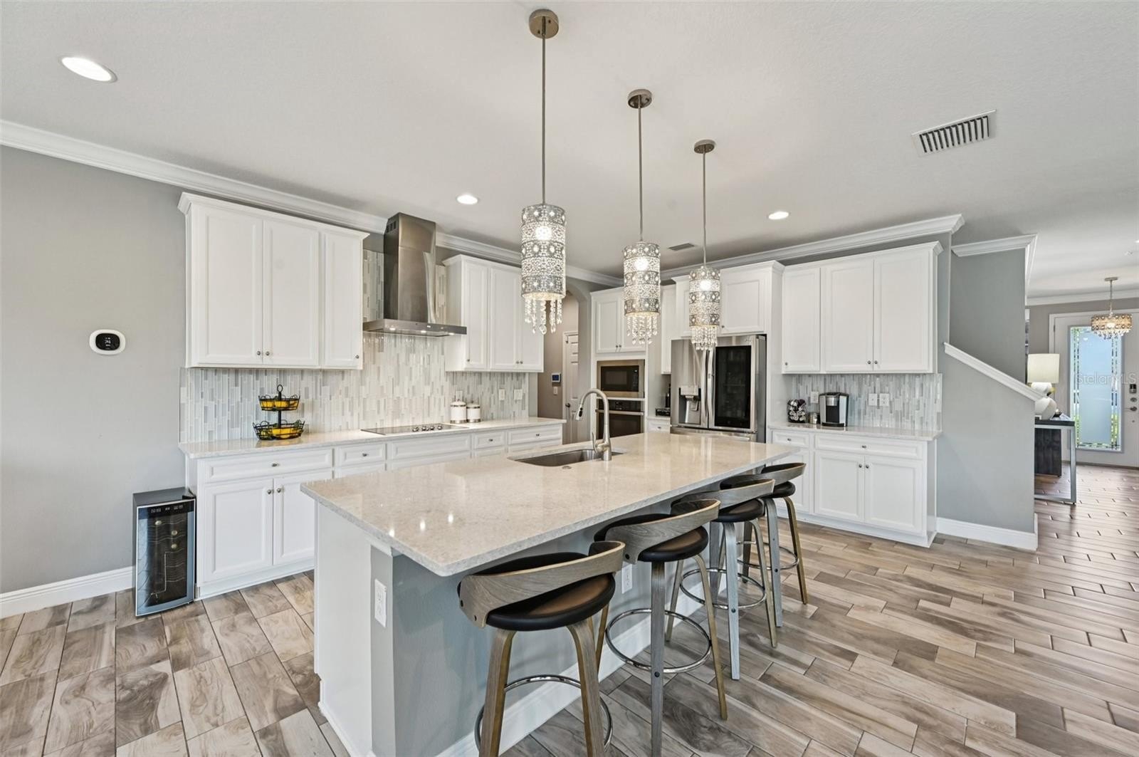 At the heart of the home is a gourmet kitchen with a built-in oven, sleek cooktop, and oversized walk-in pantry. Stylish wood-look tile floors carry through the open living and dining areas, creating a seamless flow with a touch of elegance. Walls of glass—quadruple sliders in the living room and double sliders off the dining room—invite natural light and showcase picturesque views of the saltwater pool and private backyard.