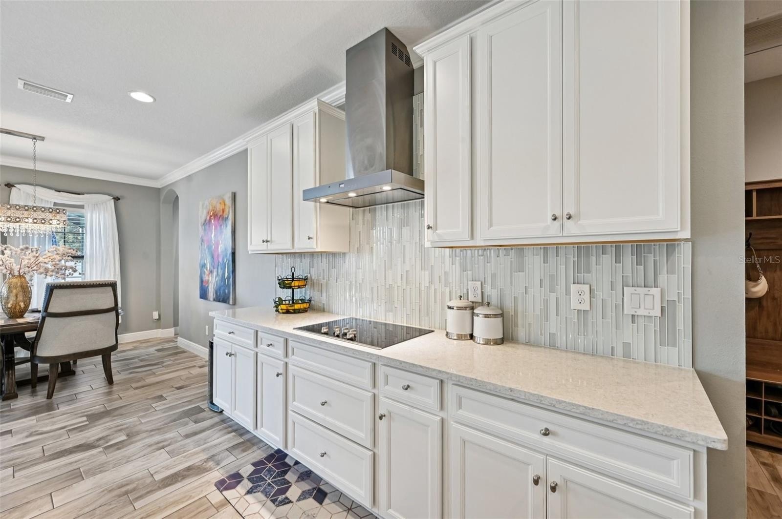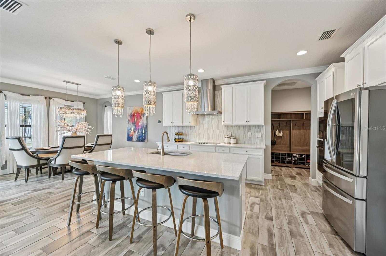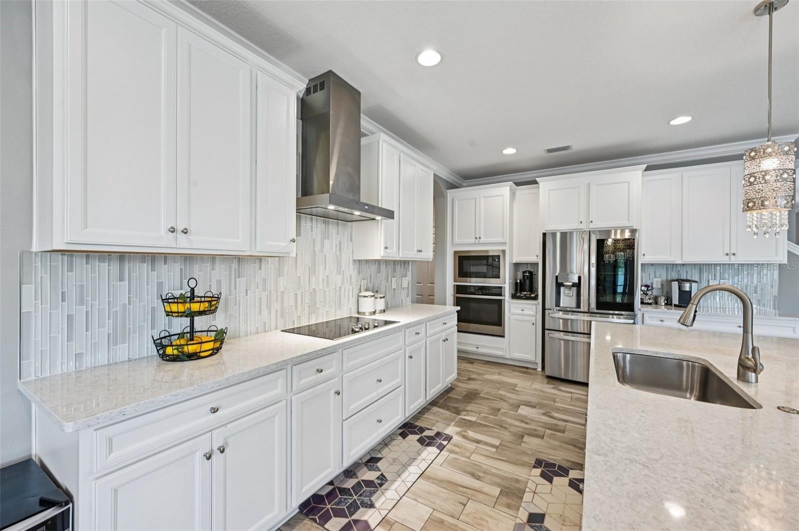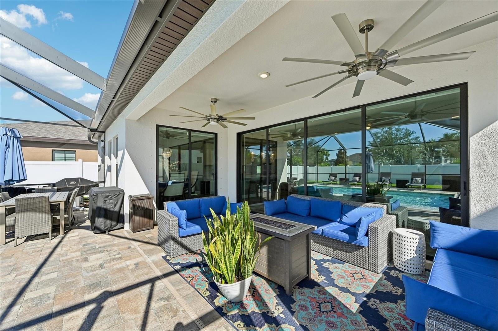 At the heart of the home is a gourmet kitchen with a built-in oven, sleek cooktop, and oversized walk-in pantry. Stylish wood-look tile floors carry through the open living and dining areas, creating a seamless flow with a touch of elegance. Walls of glass—quadruple sliders in the living room and double sliders off the dining room—invite natural light and showcase picturesque views of the saltwater pool and private backyard.