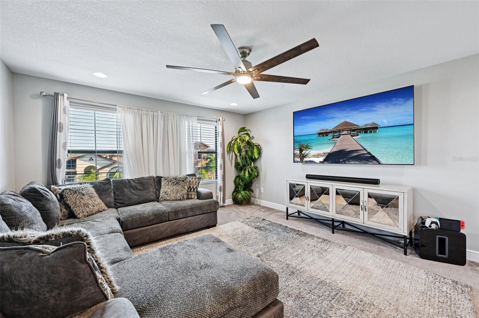 Throughout the home, you’ll find thoughtful upgrades like stylish light fixtures and smart-home features including a media panel with built in ceiling speakers, smart thermostat, custom motorized shades on the sliding doors,etc., all adding to the home’s modern, luxurious feel.
