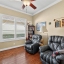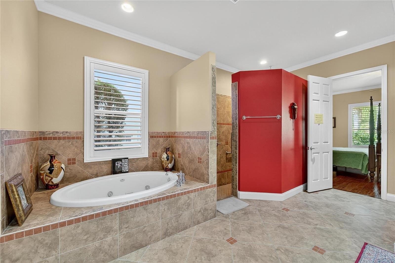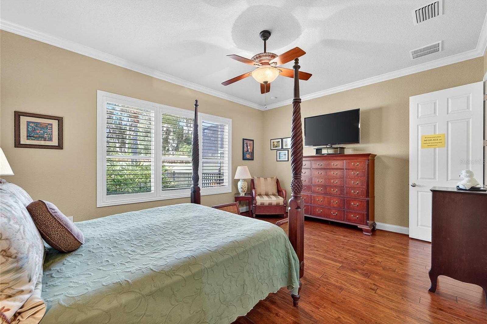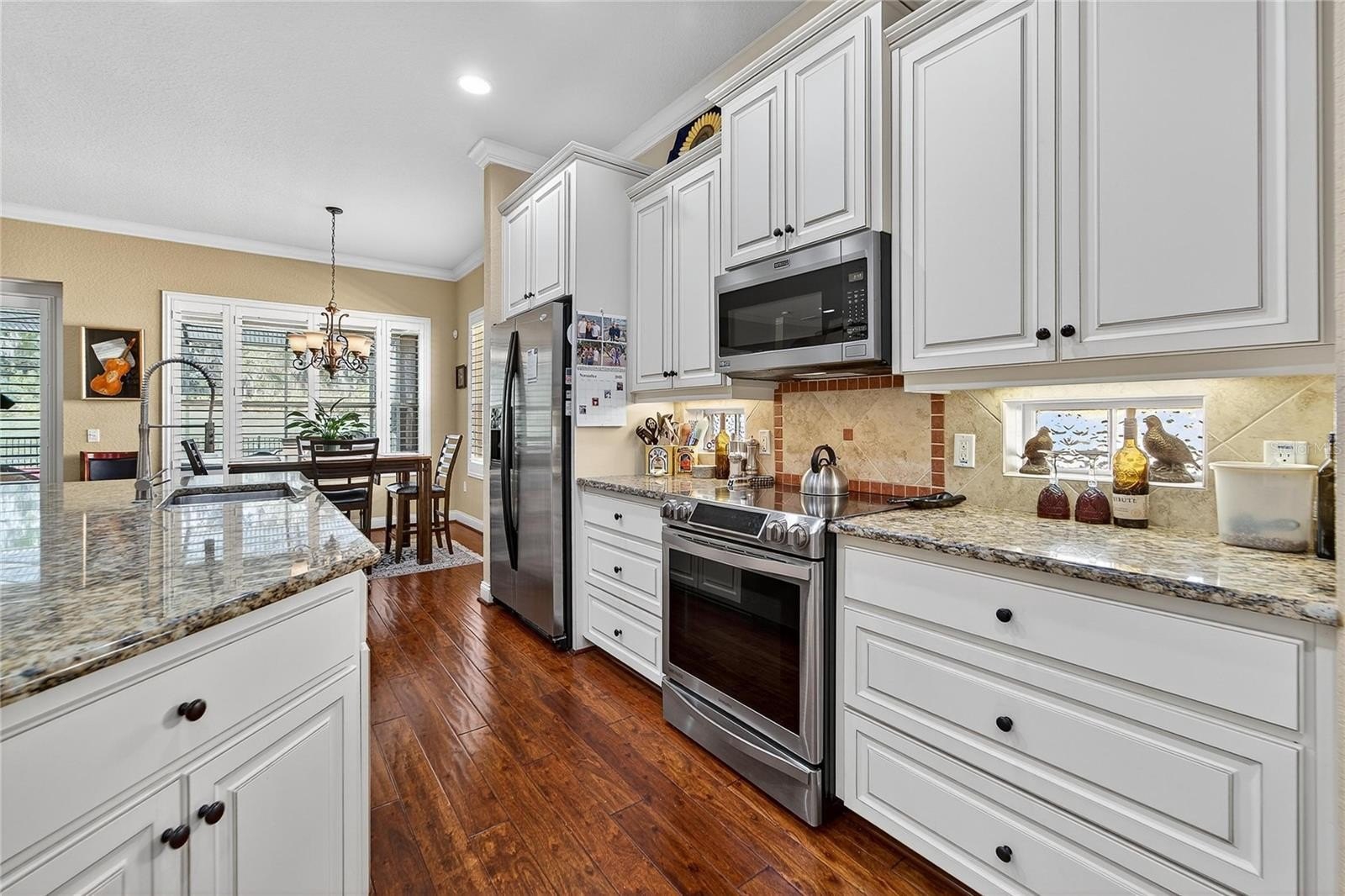 Step inside to discover rich hardwood laminate floors throughout, plantation shutters, high ceilings, crown molding, and an inviting open floor plan designed for effortless entertaining. The gourmet kitchen features stone countertops, custom cabinetry, and a bright breakfast room area that flows seamlessly into the spacious living and kitchen areas. The serene primary suite offers a customized large walk-in closet and a spa-inspired bath with a soaking tub and large walk in shower with seat.