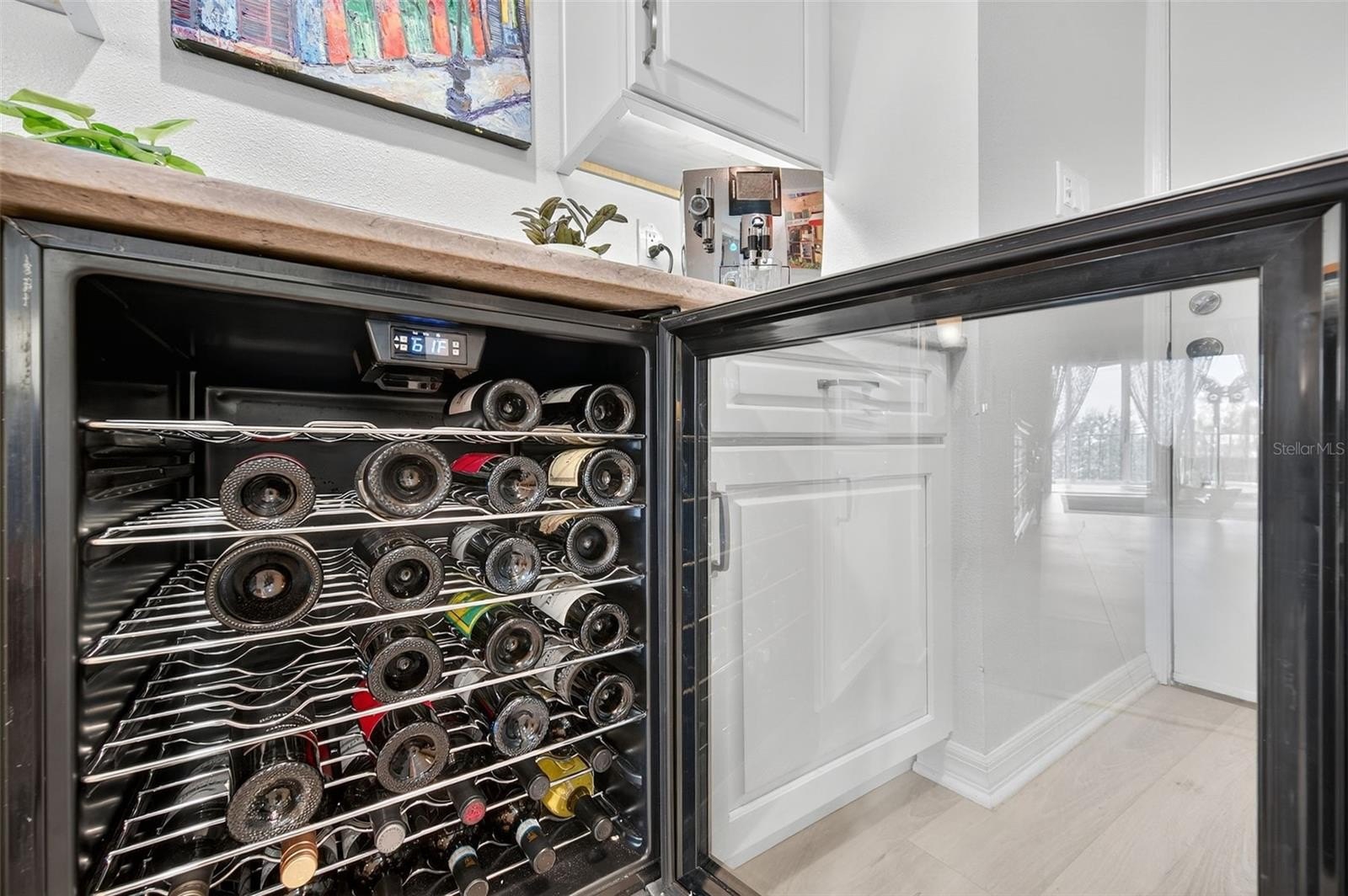 The kitchen is the true centerpiece. Professionally remodeled with over $70,000 in upgrades, it features a deep composite sink with a touchless faucet, slow-close cabinetry, under-cabinet lighting, and clever pull-out drawers that maximize storage, including a custom spice drawer and full-extension corner cabinet. An unused hallway closet was transformed into a stylish wine and coffee bar with its own wine refrigerator, perfect for morning routines or entertaining guests.