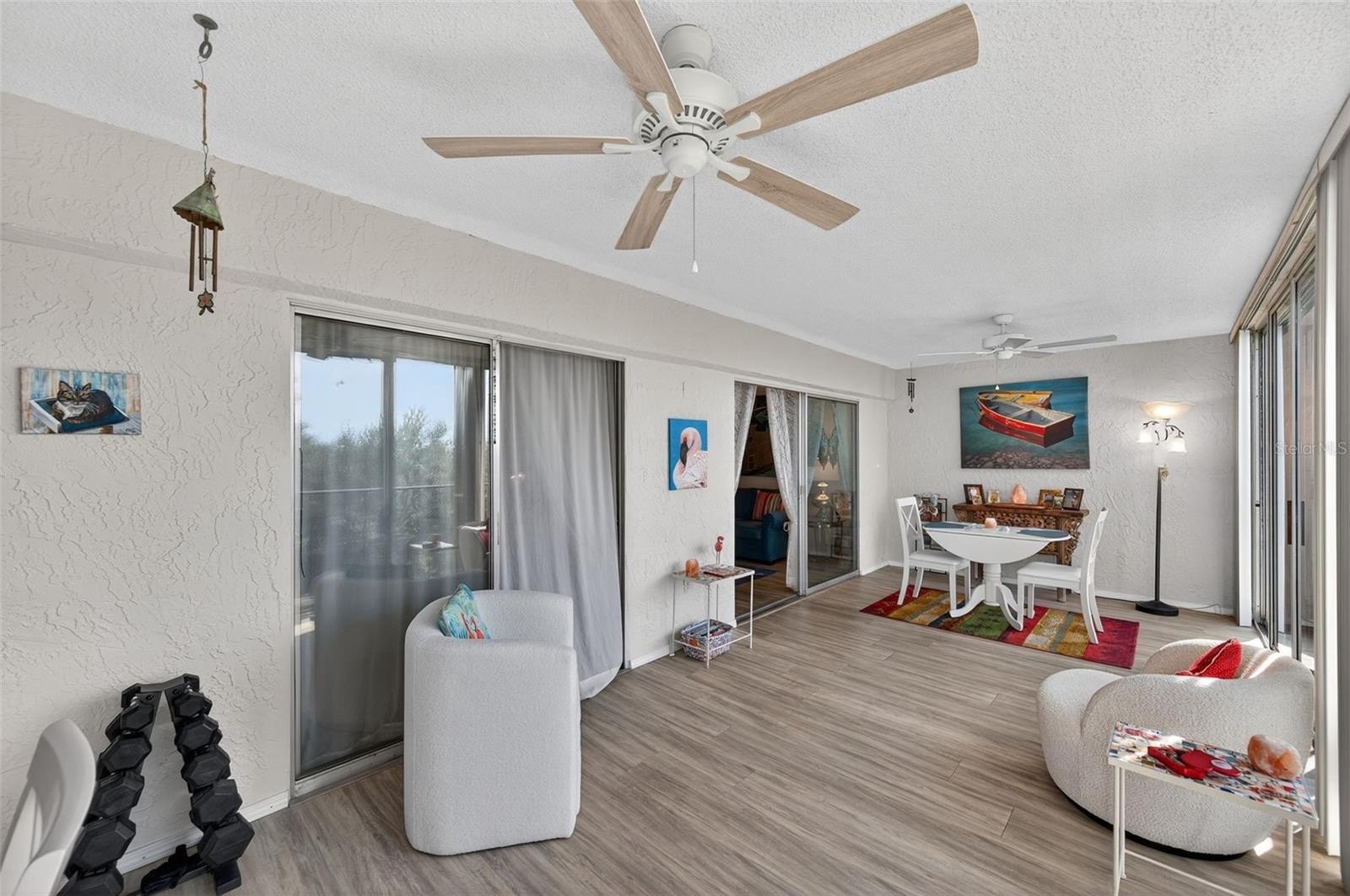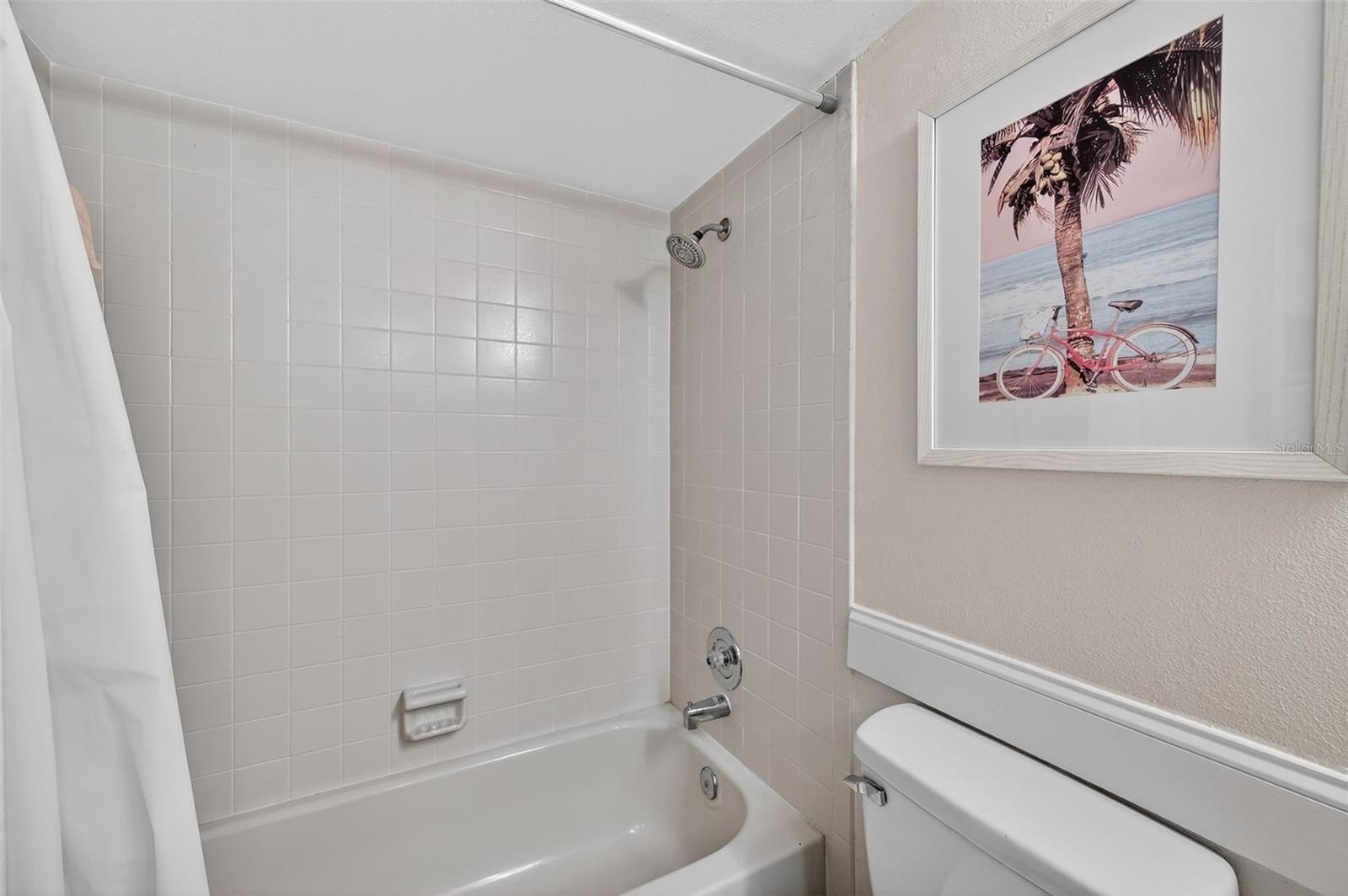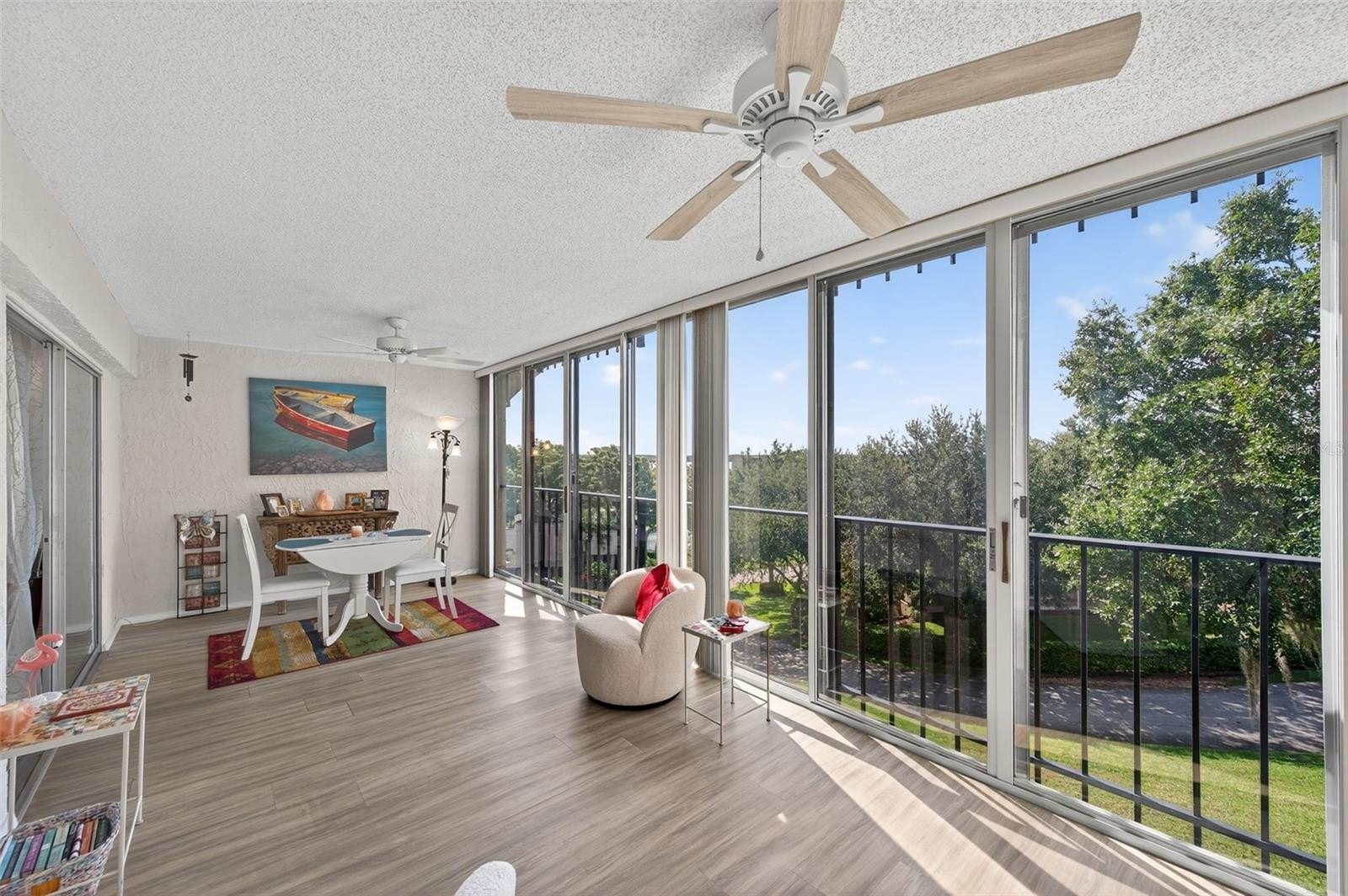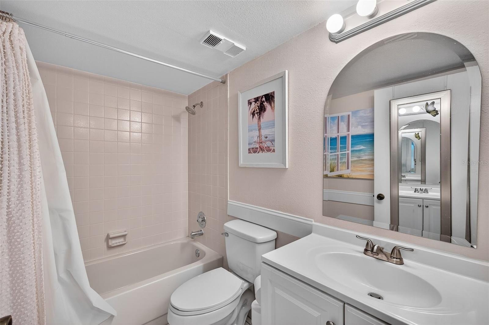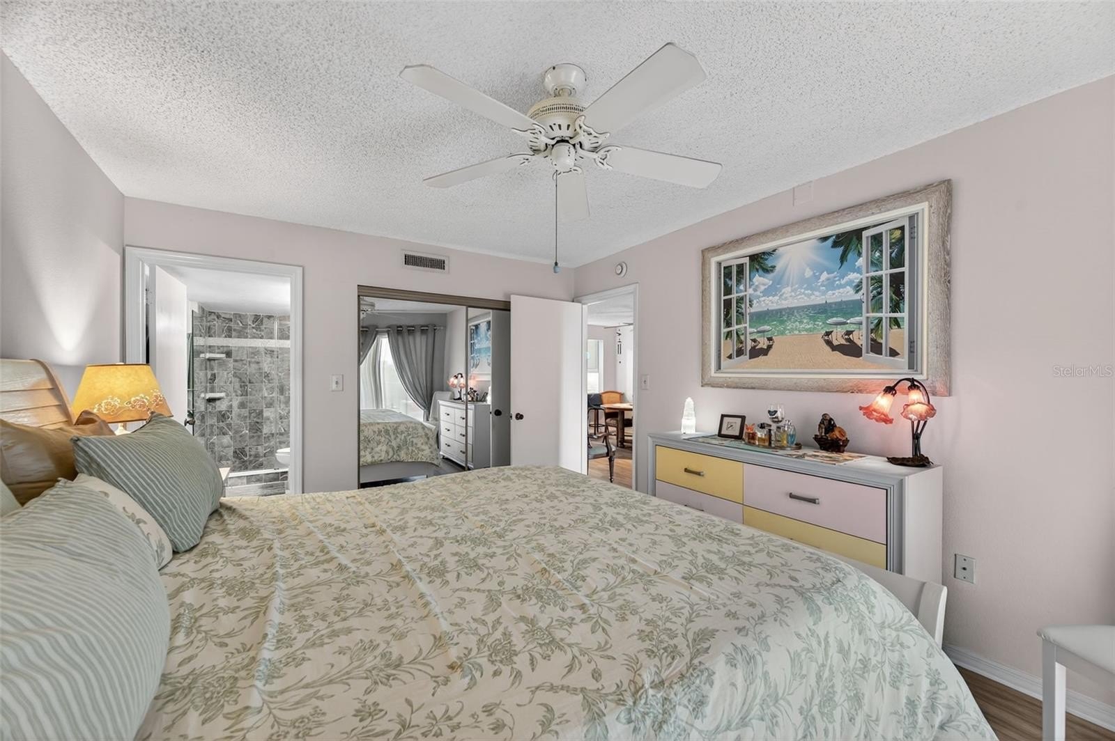 Both bathrooms have been beautifully refreshed, with the primary showcasing a glass walk-in shower and framed mirror. Luxury vinyl plank flooring flows throughout, hurricane-rated windows in the front kitchen, and guestroom bedroom add peace of mind, and newer systems, including HVAC and water heater, ensure modern comfort.