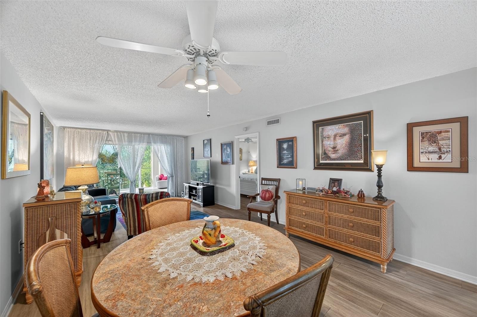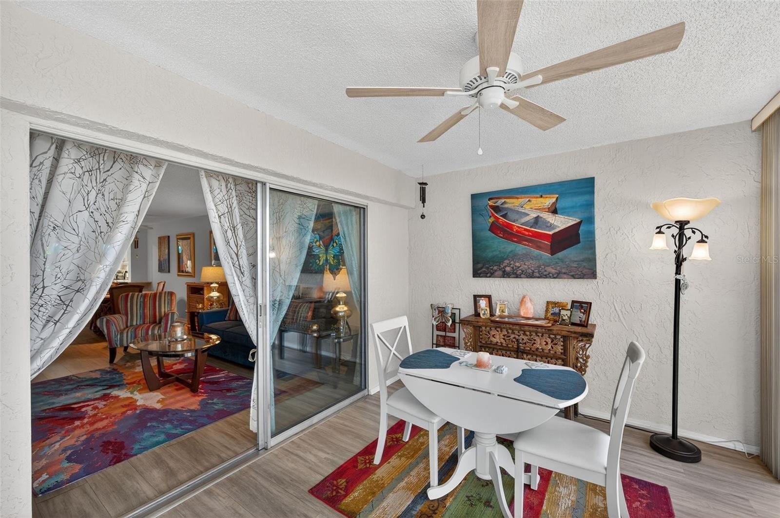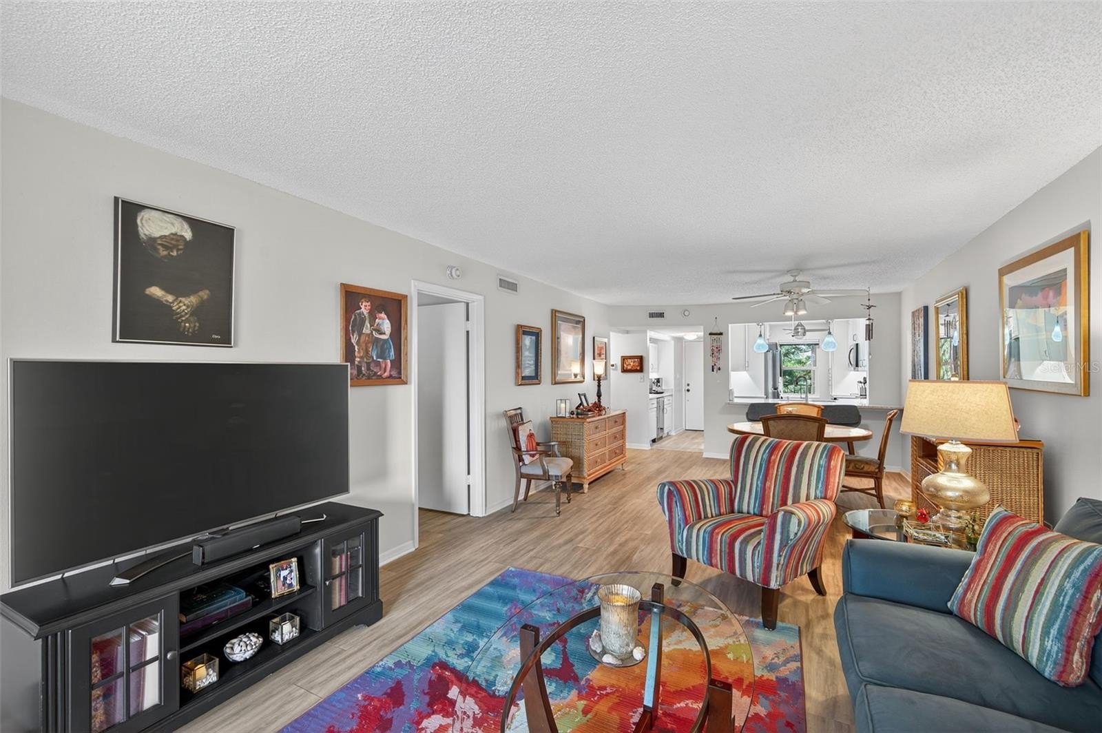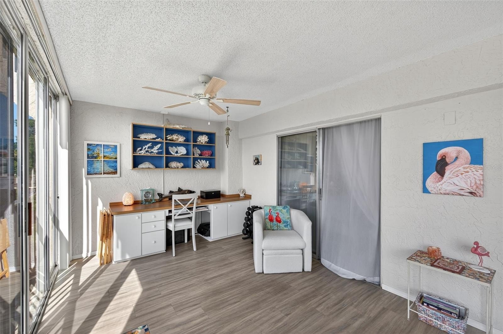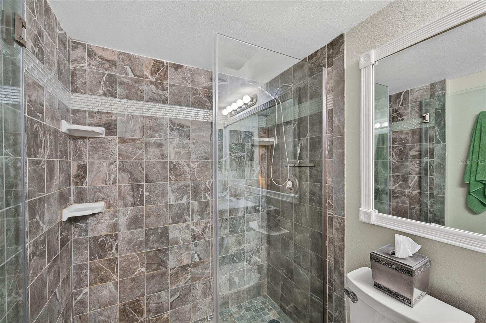 Both bathrooms have been beautifully refreshed, with the primary showcasing a glass walk-in shower and framed mirror. Luxury vinyl plank flooring flows throughout, hurricane-rated windows in the front kitchen, and guestroom bedroom add peace of mind, and newer systems, including HVAC and water heater, ensure modern comfort.