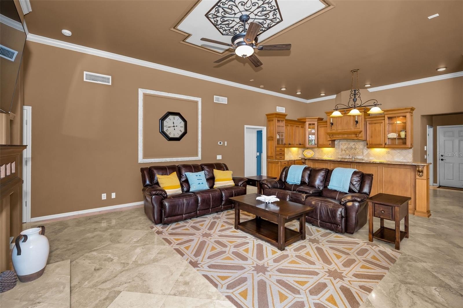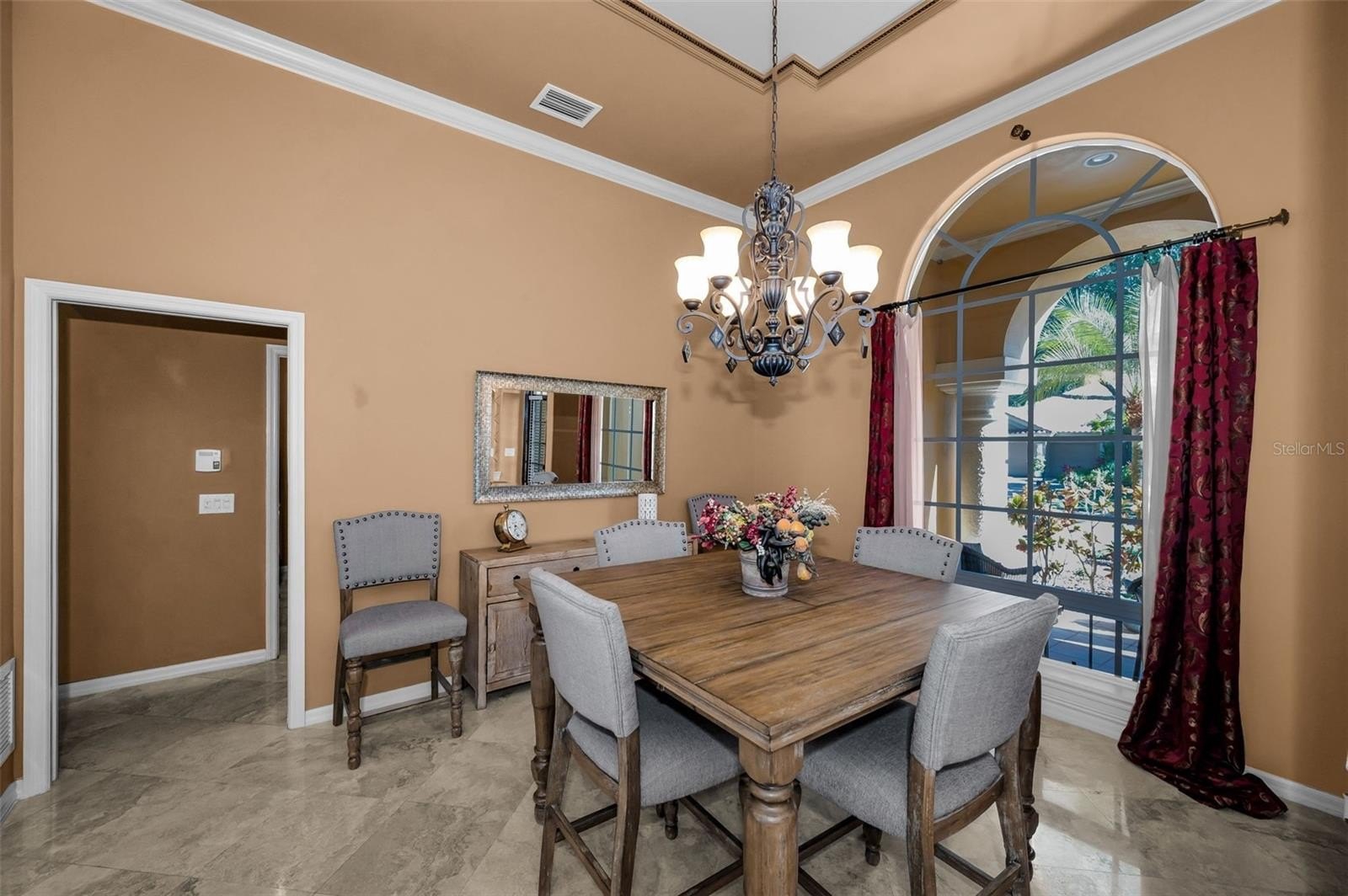 Step inside to find travertine tile flooring throughout entire home, and crown molding gracing most of the home. The formal living and dining rooms have generous space for entertaining and open directly to the pool and lanai, perfect for Florida-style indoor-outdoor living. The gourmet kitchen overlooks the family room with a gas fireplace and built-in shelving and boasts a 6-burner Viking gas self-cleaning range, bar-height breakfast bar, and eat-in nook—ideal for casual meals or gatherings.