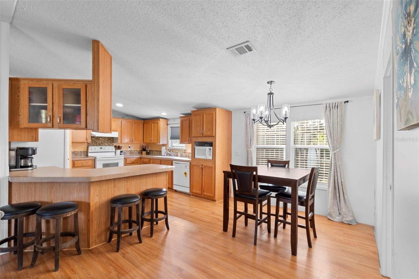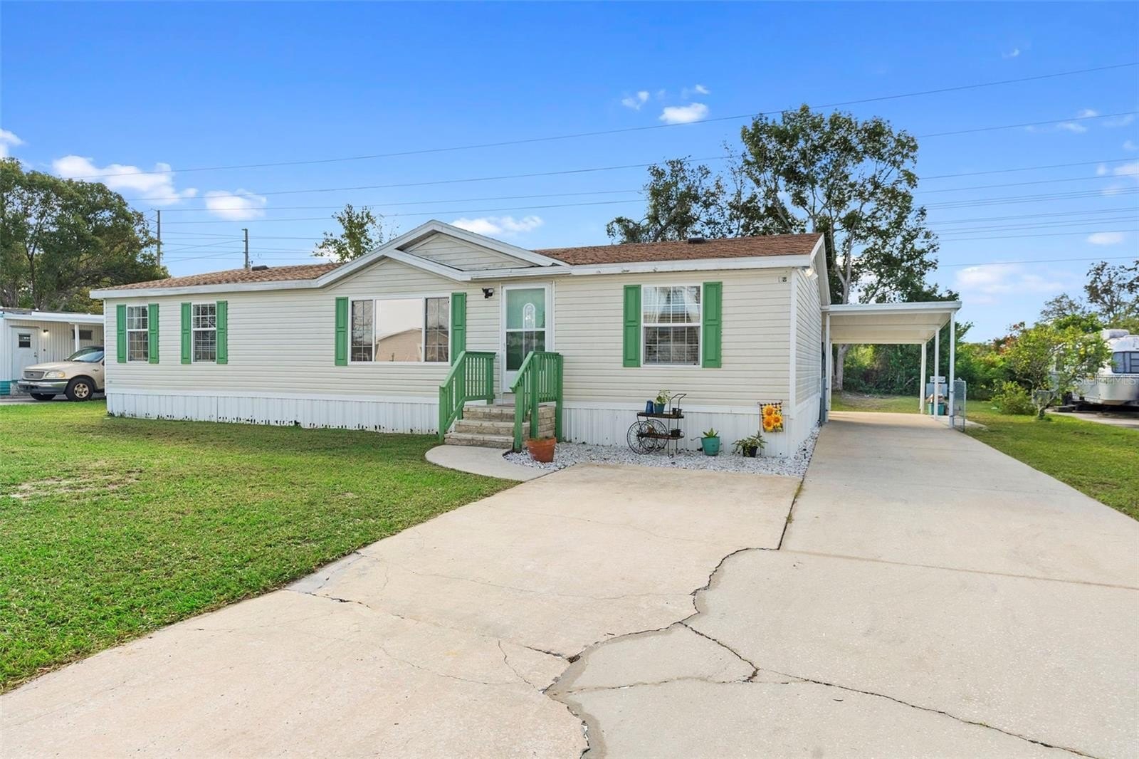 This 3-bedroom 2-bath split floor plan Terra Alta home in Debary with NO mandatory HOA on YOUR OWN LAND is in great condition and is located very close to Orange city, yet Deland and Sanford are right down the street. Inside, the main living area greets you with beautiful wood flooring and cathedral ceilings and flows gently into the kitchen and dining areas. The kitchen includes all matching appliances, a breakfast bar, and features an abundance of countertops and cabinetry for storage, including a reach-in pantry, making it both attractive and functional. The large Primary Bedroom suite features a huge private ensuite bath with dual sinks, soaking tub, and a walk-in shower. This home has plenty of space for additional parking, including covered parking towards the rear of the home. Additional features include a large indoor laundry room, a NEWER ROOF, the exterior electrical panel being recently replaced, and one of the sheds stays with your new home. There is an inexpensive OPTIONAL HOA that includes a swimming pool, clubhouse and shuffleboard. The bus line, shopping, restaurants and I-4 are just a short hop away, making the ride to Orlando and the beaches a breeze! Ask your Realtor® for the unbranded virtual walking tour of this home. All measurements are approximate and should be independently verified.