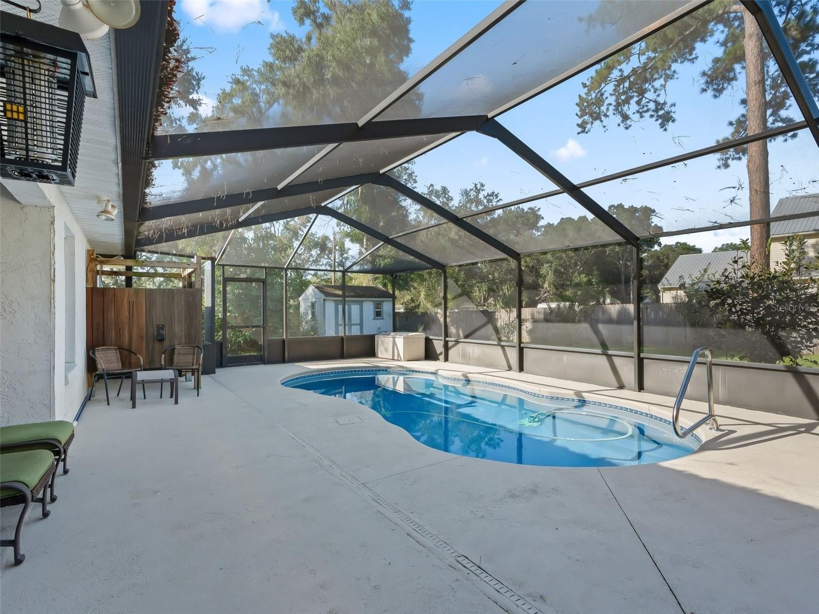 Wonderful Energy Efficient 3BR/2BA Pool Residence in SE Ocala offering solar benefits such as low monthly utility costs. Residence is situated on .30 acre corner lot with privacy fencing, screened salt water, heated pool with outdoor shower. No HOA! Residence offers spacious living room with cathedral ceiling and stone, wood burning fireplace, open kitchen with pantry overlooking breakfast area, dining room and split BR floor plan. Primary suite is spacious with walk-in closet; primary bath offers double vanity, bidet, walk-in shower and soaking tub. Guest bath offers tub shower combo. Home is wired for security. 2 car garage offers abundance of storage space - shelving and additional freezer space. There is a whole house propane 22kW Generac generator. Roof 2013, A/C 2013, Pool 2016, Water Heater newer and Solar 2018, Generator 2019. Property central to shopping, restaurants and schools. Large parcel to the SE offers great views. Private yet close to town; shopping, restaurants and schools. Come join us in the Sunshine State and enjoy the weather year round.