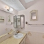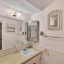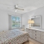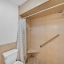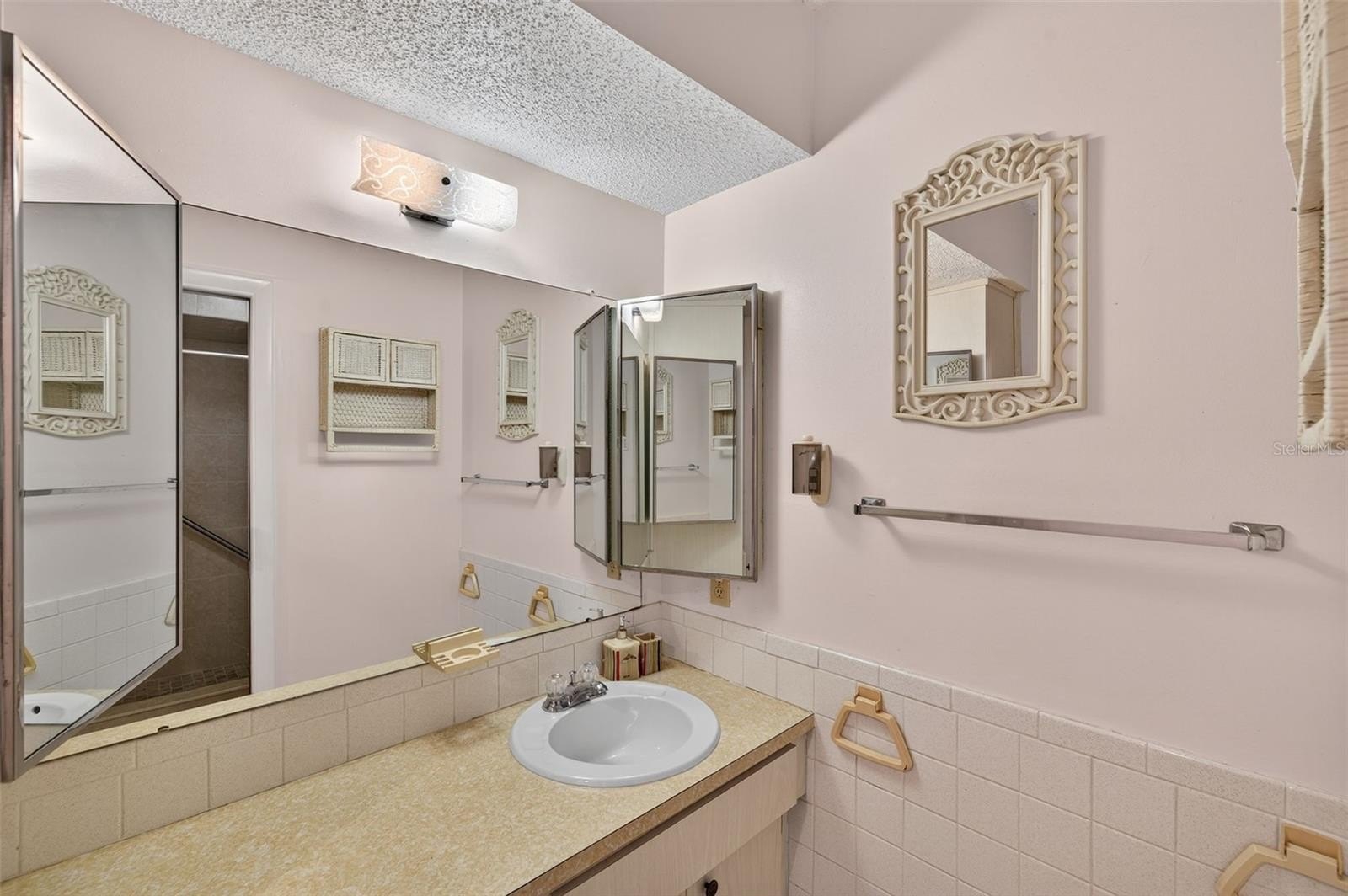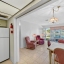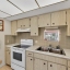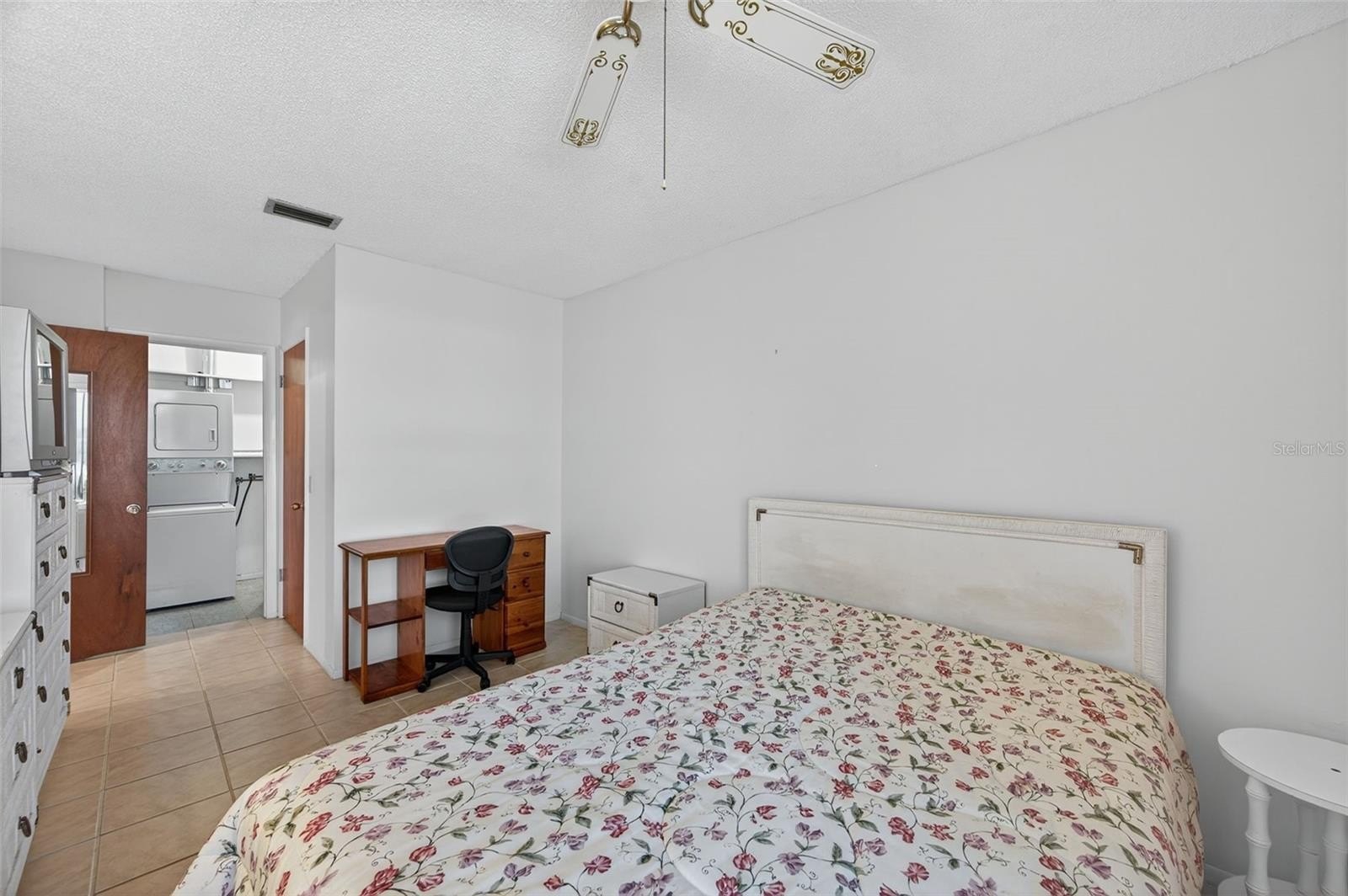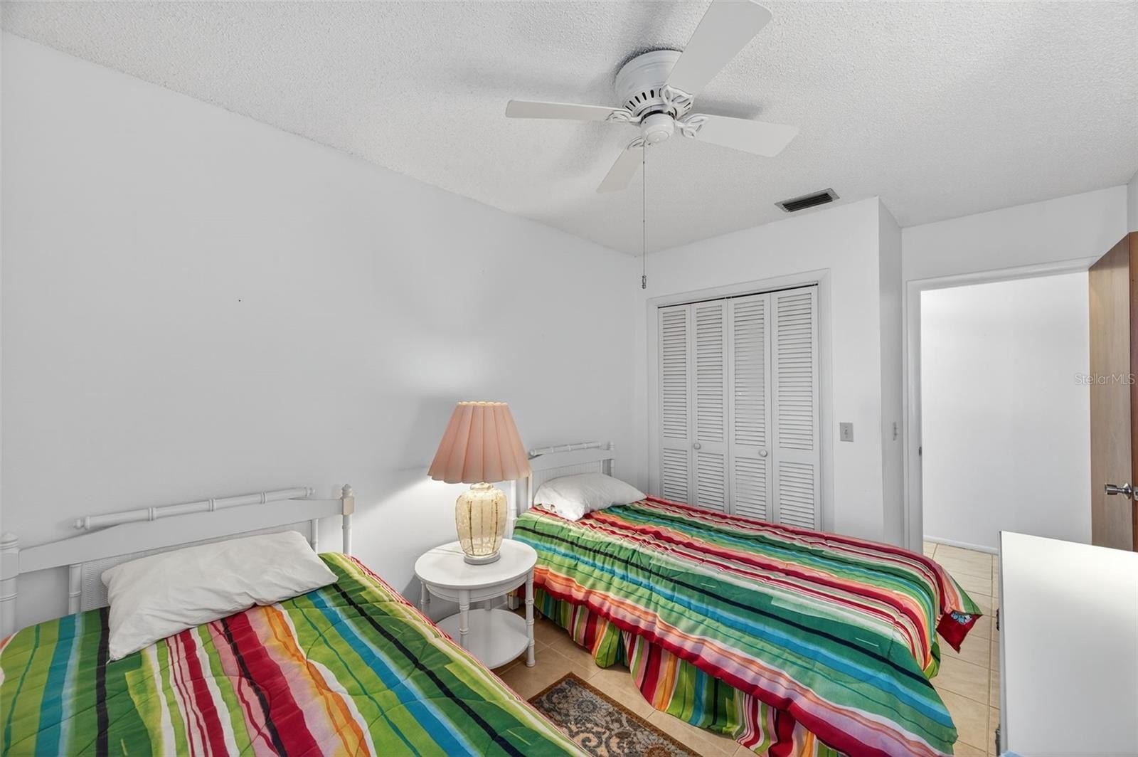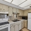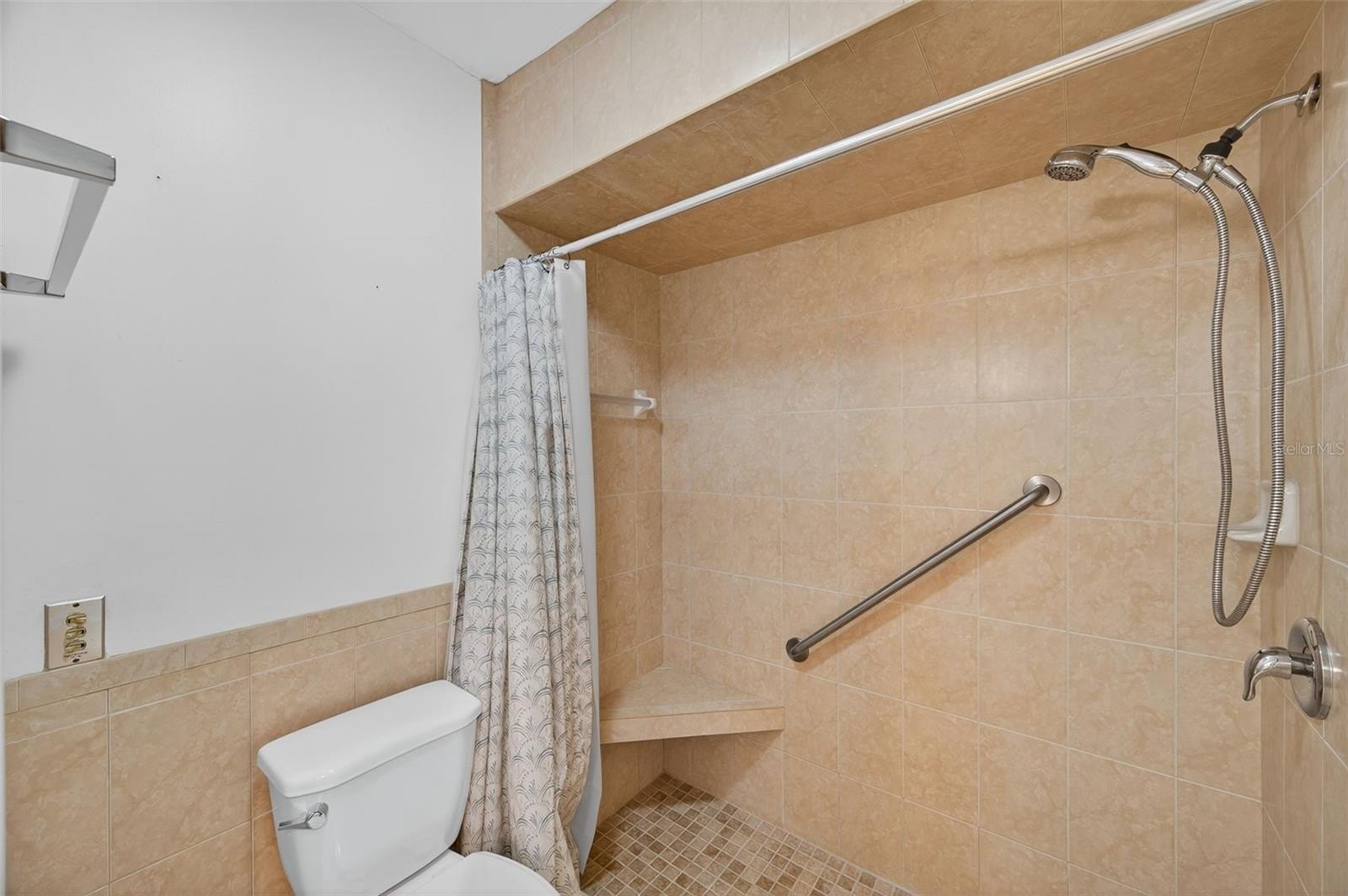 The kitchen is efficient and functional, offering plenty of cabinet space and a classic design that opens toward the main living area. Both bedrooms feature tile flooring for easy maintenance, with the primary suite including a spacious walk-in closet. The bath offers a tiled walk-in shower with a grab bar and handheld fixture for added convenience.