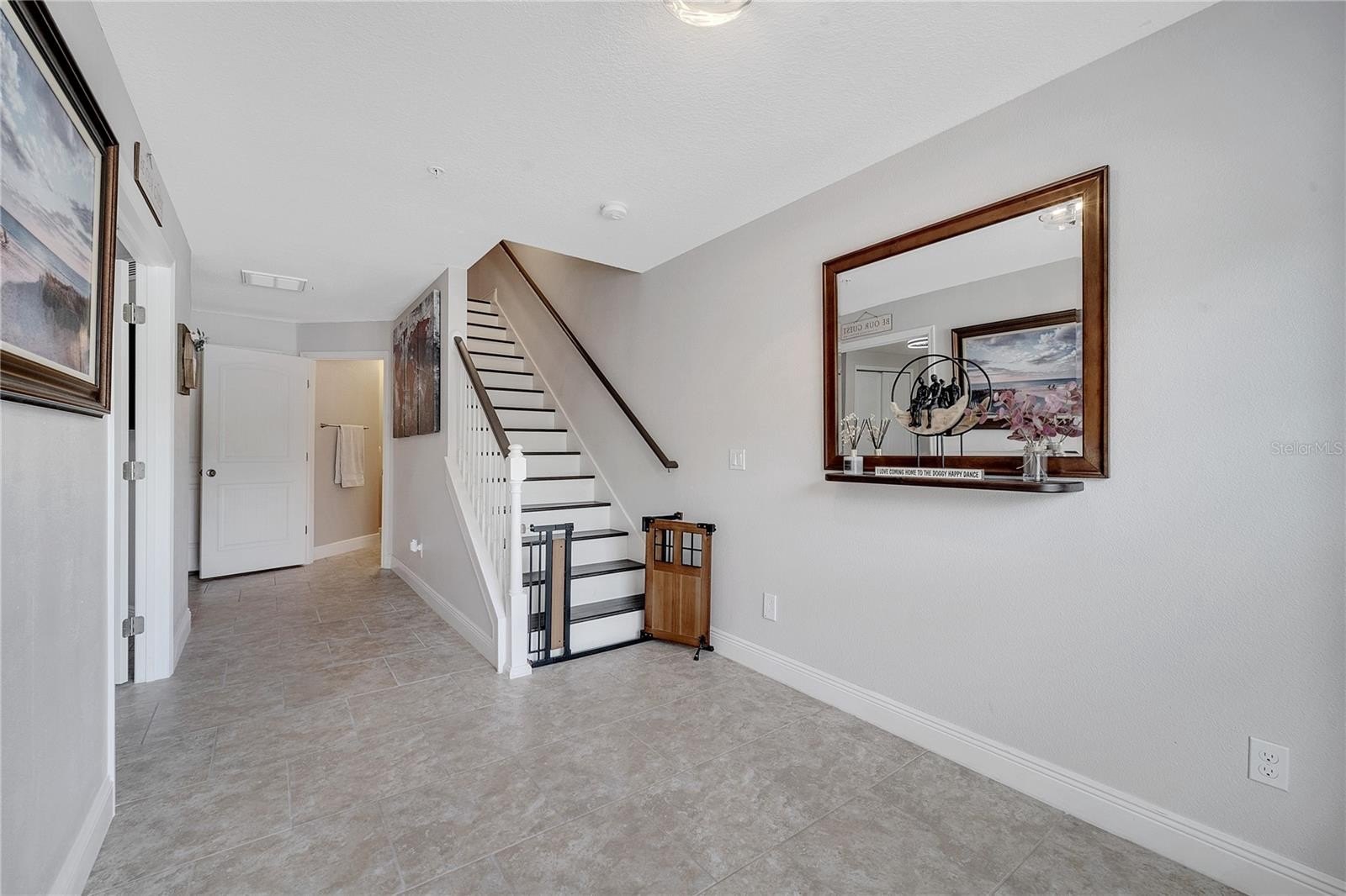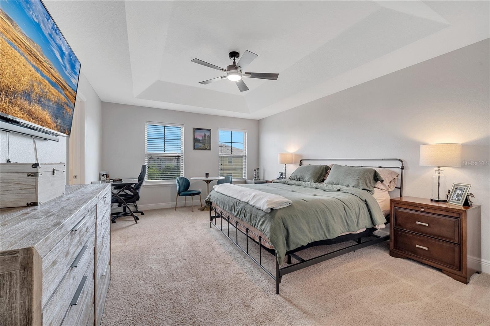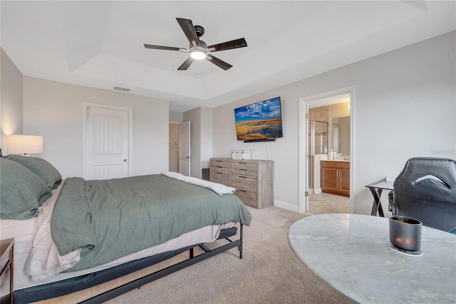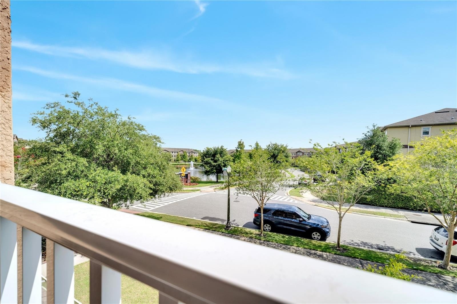 Upstairs, the spacious primary suite offers a tray ceiling, walk-in closet, and tranquil pond views. The en-suite bath includes a soaking tub, dual vanities, walk-in shower, and private water closet. Two additional bedrooms, a full bath, and a conveniently located laundry closet with washer and dryer complete the upper level.