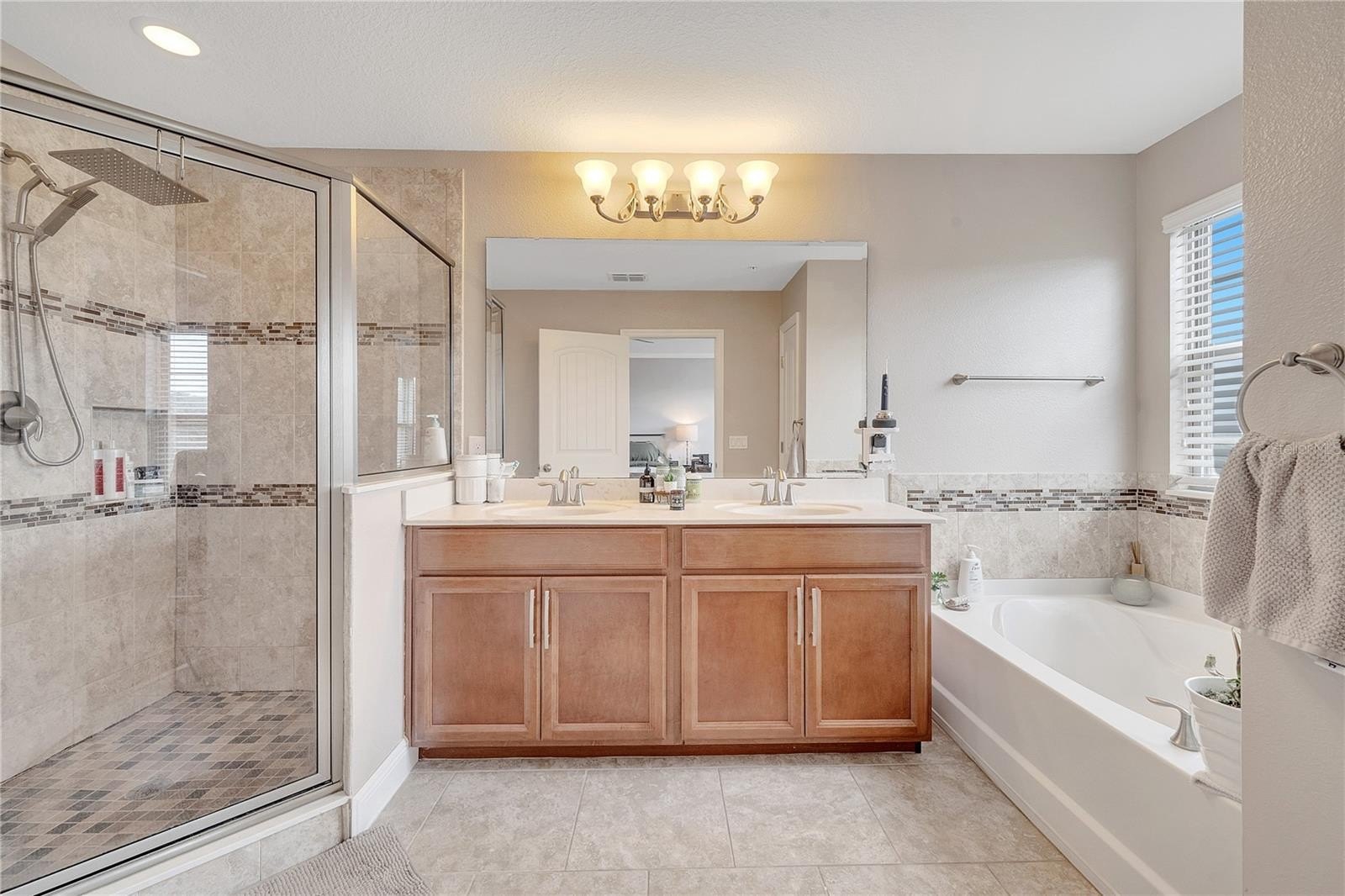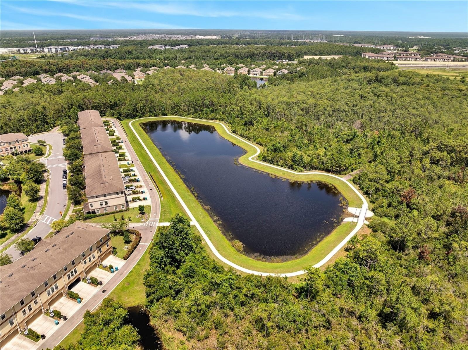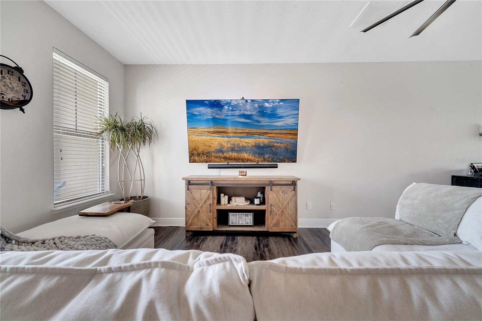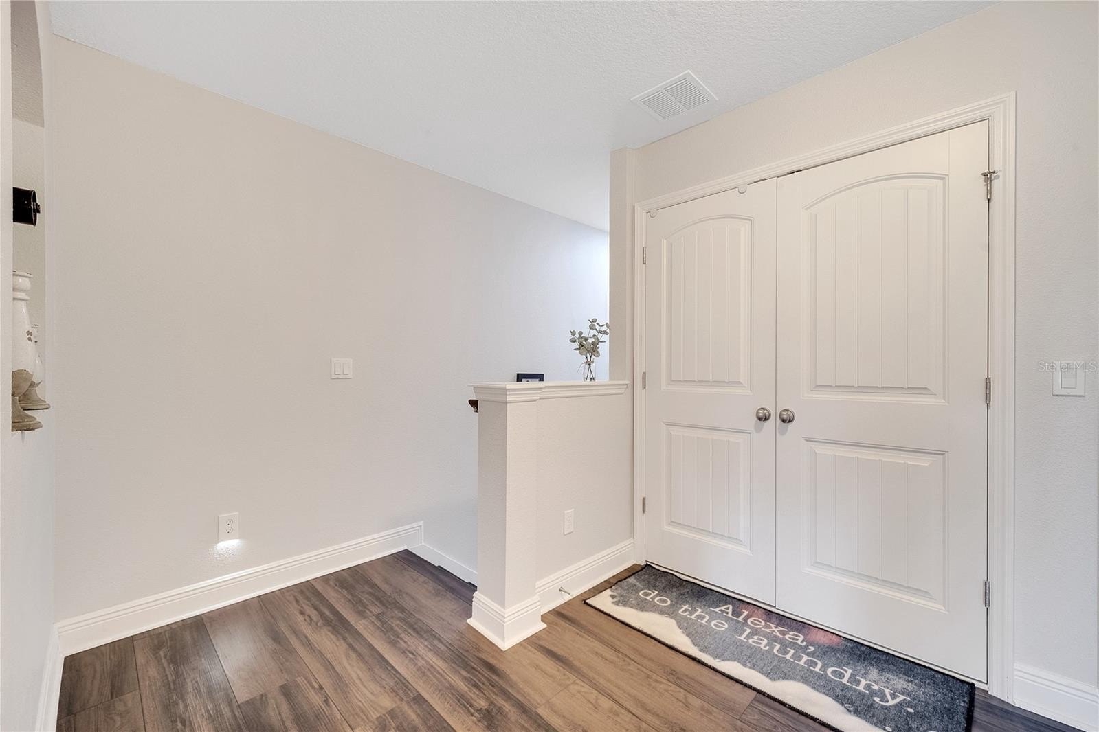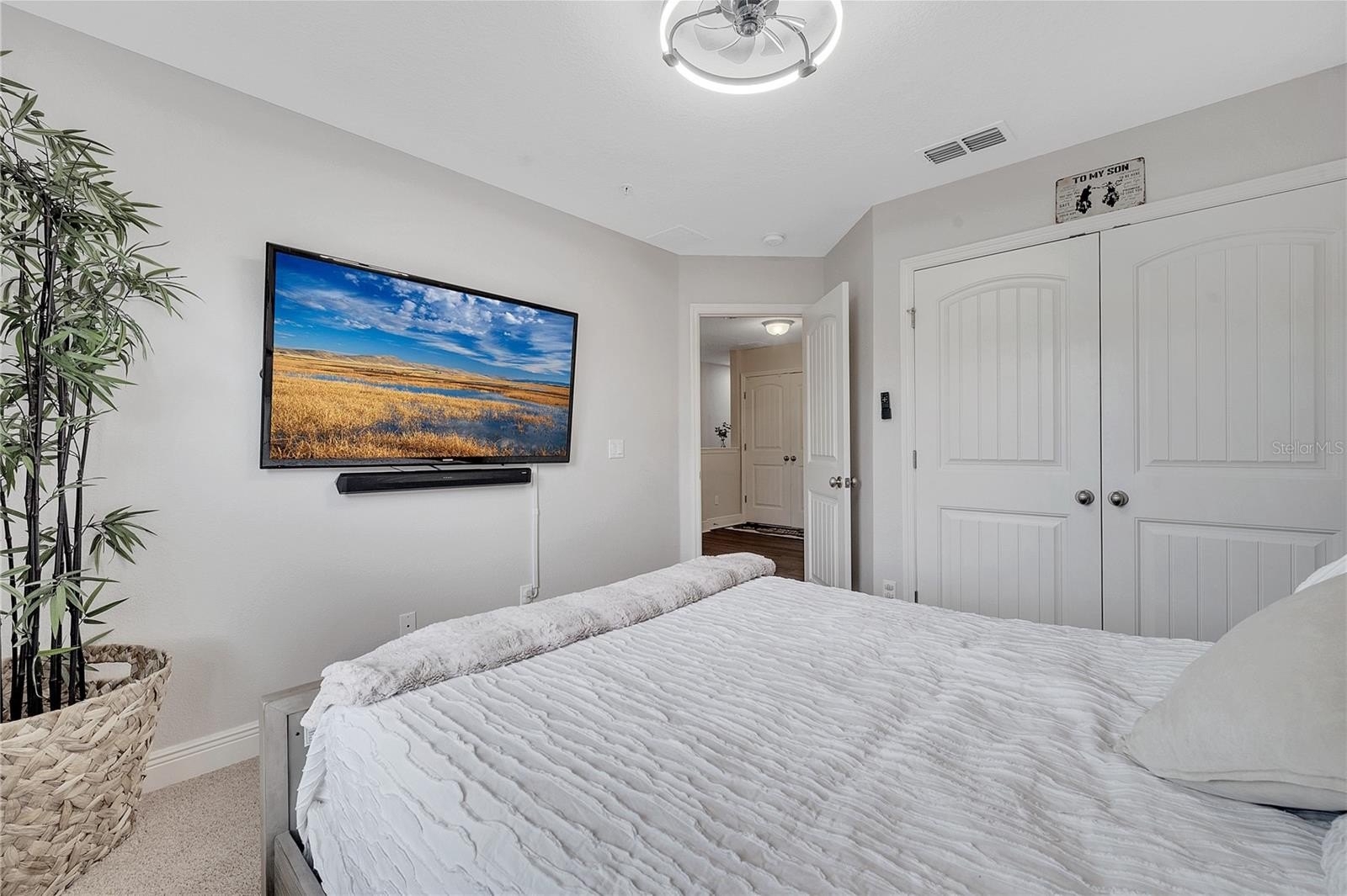 Upstairs, the spacious primary suite offers a tray ceiling, walk-in closet, and tranquil pond views. The en-suite bath includes a soaking tub, dual vanities, walk-in shower, and private water closet. Two additional bedrooms, a full bath, and a conveniently located laundry closet with washer and dryer complete the upper level.