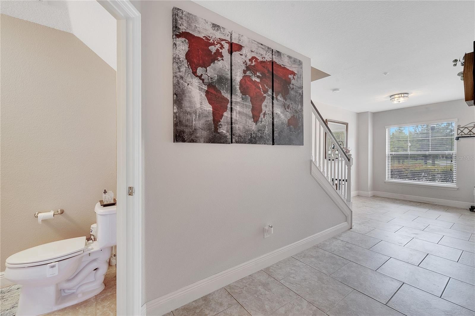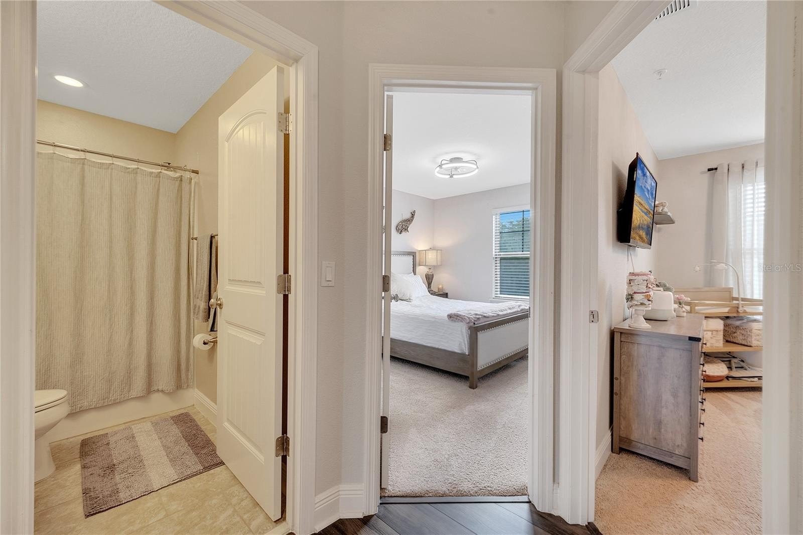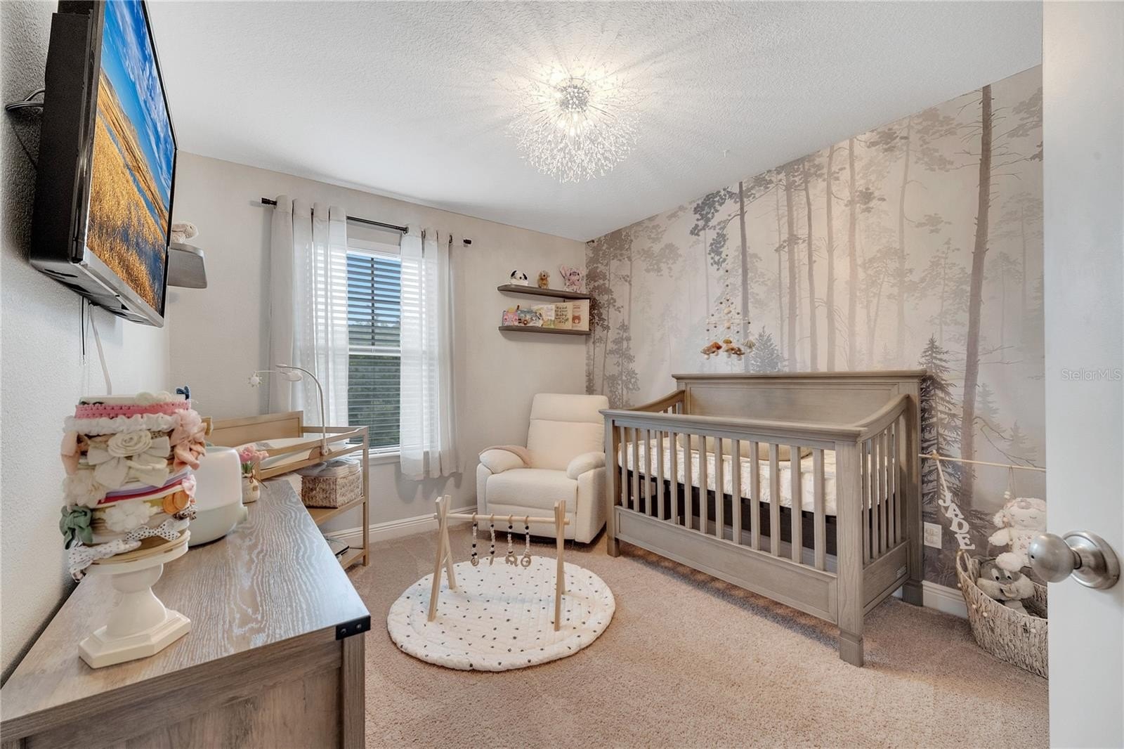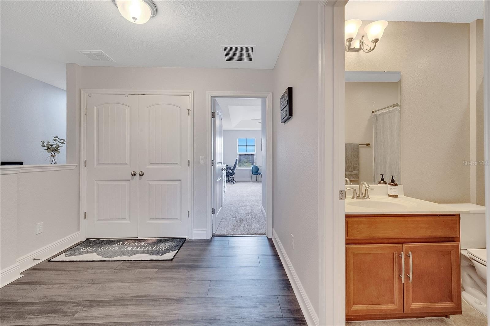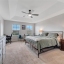 Upstairs, the spacious primary suite offers a tray ceiling, walk-in closet, and tranquil pond views. The en-suite bath includes a soaking tub, dual vanities, walk-in shower, and private water closet. Two additional bedrooms, a full bath, and a conveniently located laundry closet with washer and dryer complete the upper level.