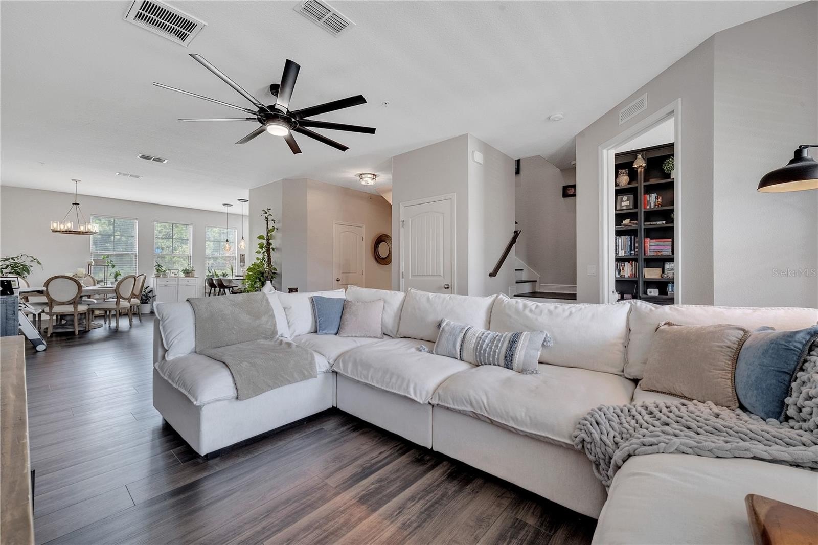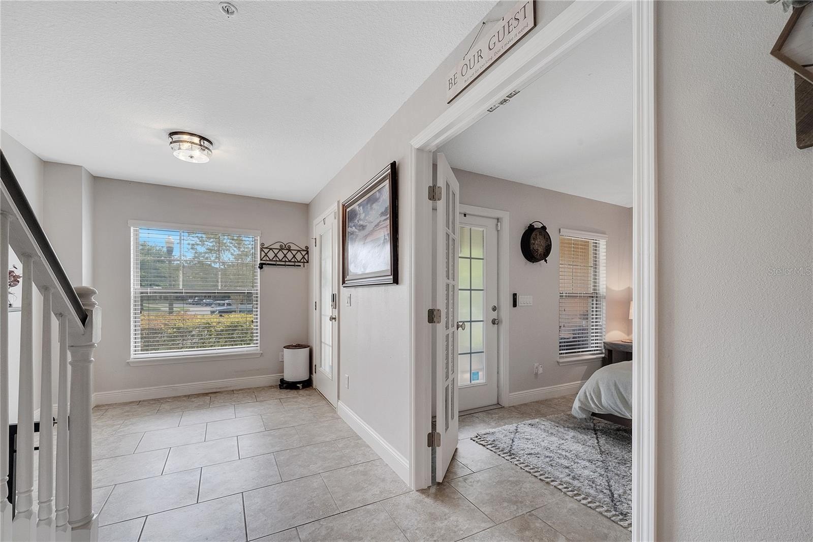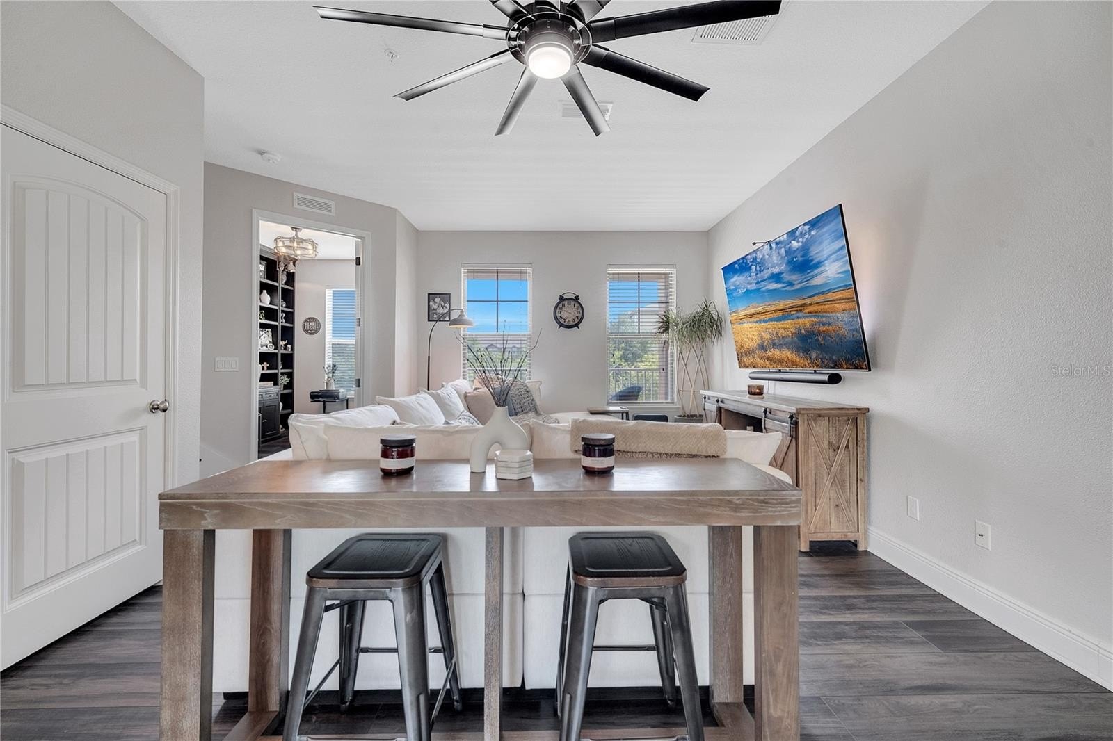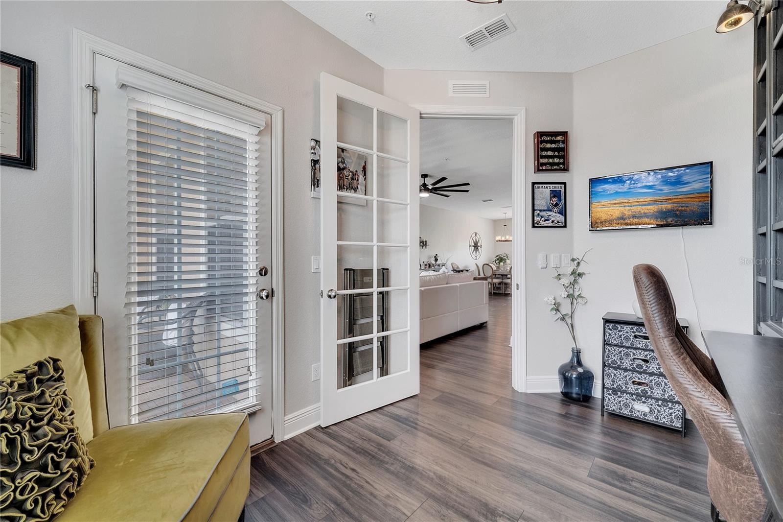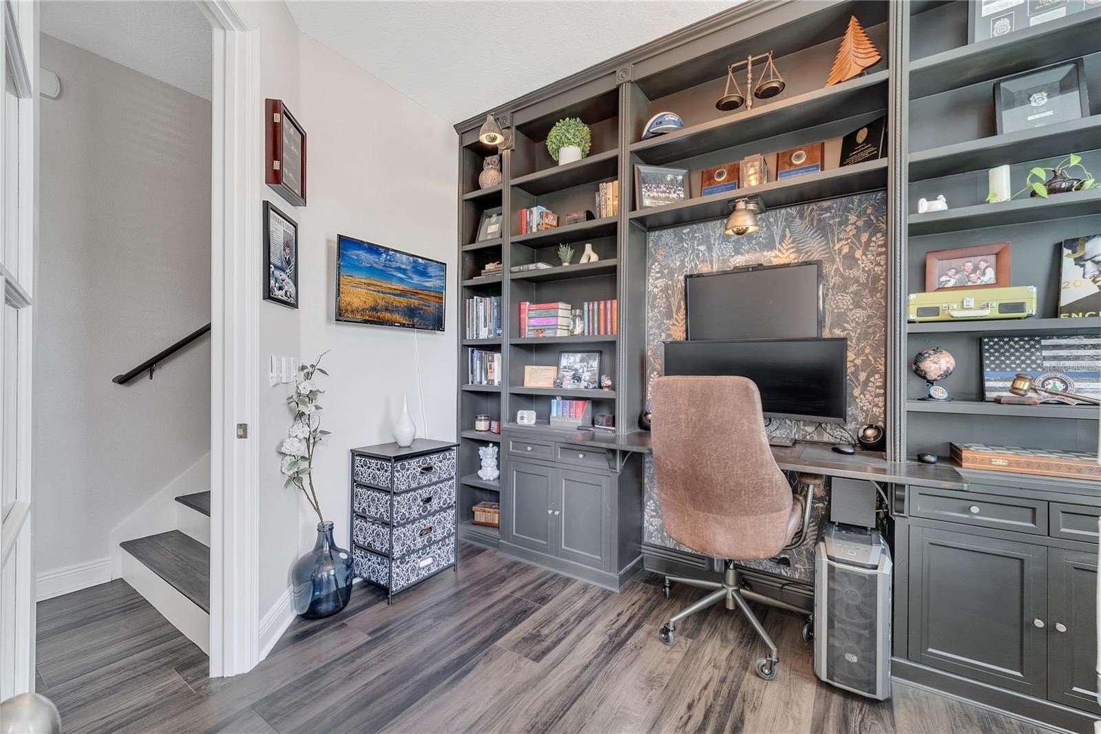 Just off the living room, a dedicated office or den with custom built-in shelving provides the perfect space for a cozy library, creative corner, or work-from-home setup, complete with balcony access overlooking a peaceful pond and fountain.