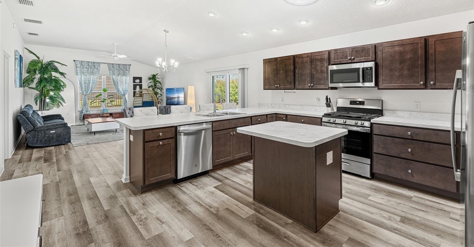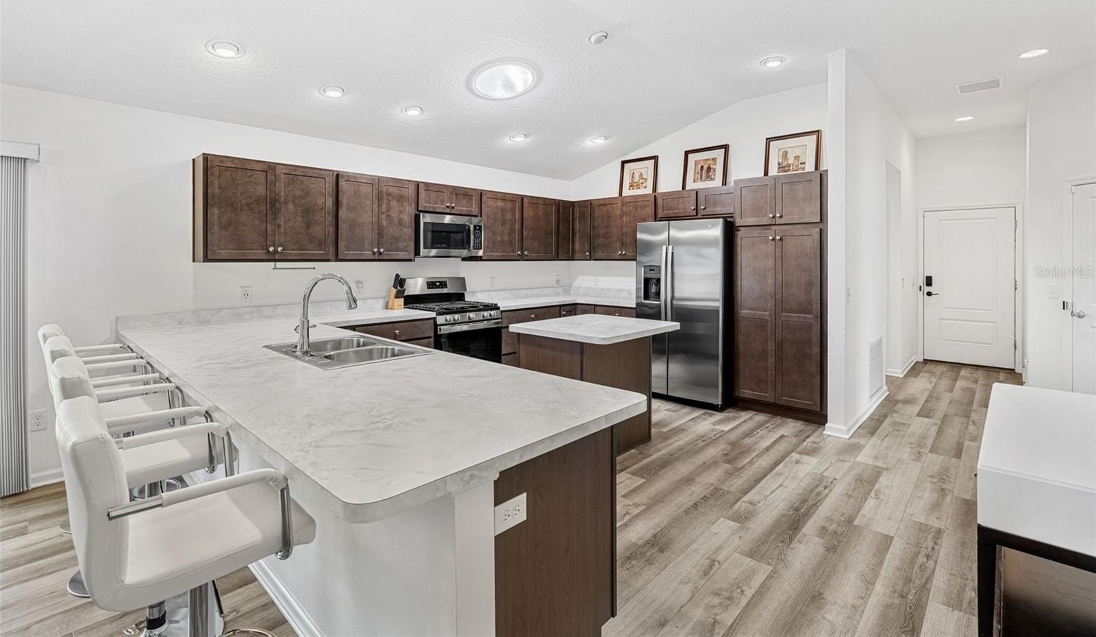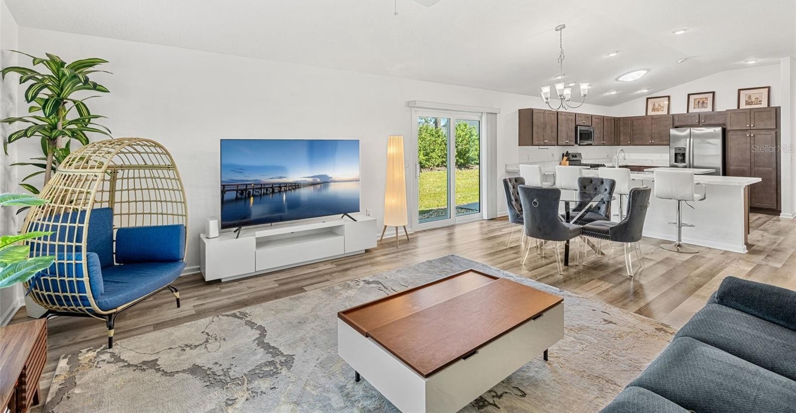 Step inside to discover a bright, open living space where high ceilings and a neutral palette create an inviting sense of calm. The kitchen’s generous island and solar tube lighting make it the perfect spot for morning coffee or casual conversation, while the living and dining areas flow seamlessly to the outdoor patio.