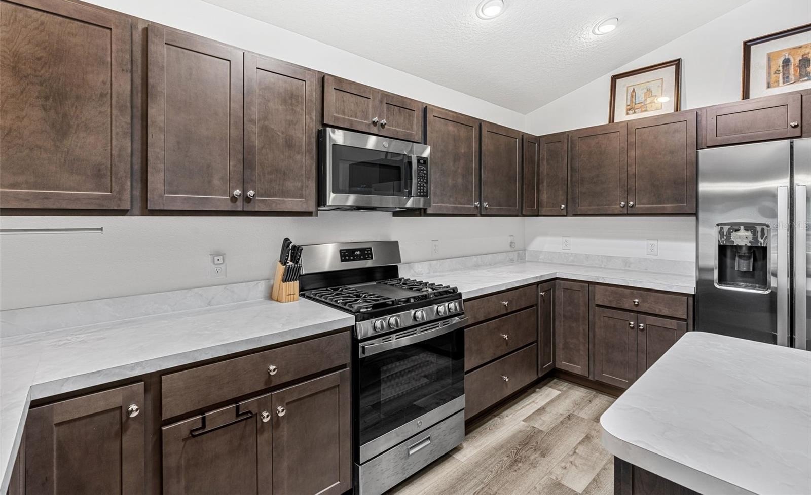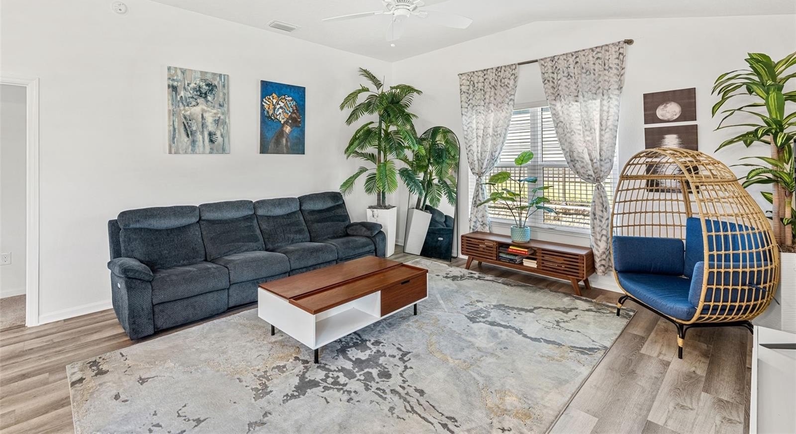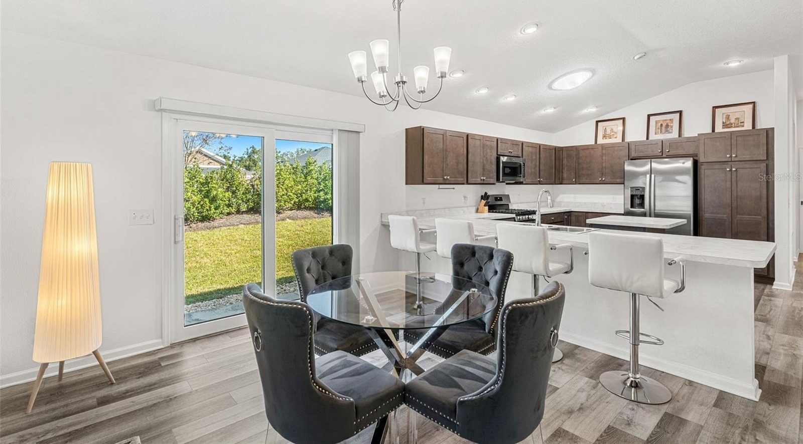 Step inside to discover a bright, open living space where high ceilings and a neutral palette create an inviting sense of calm. The kitchen’s generous island and solar tube lighting make it the perfect spot for morning coffee or casual conversation, while the living and dining areas flow seamlessly to the outdoor patio.