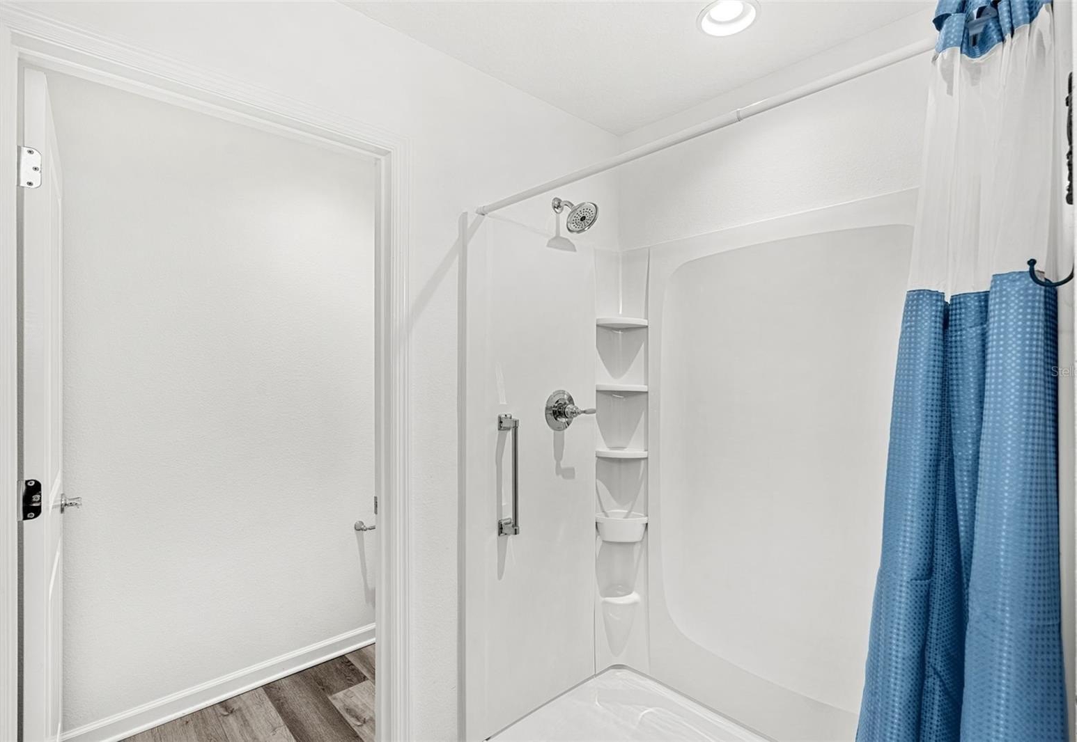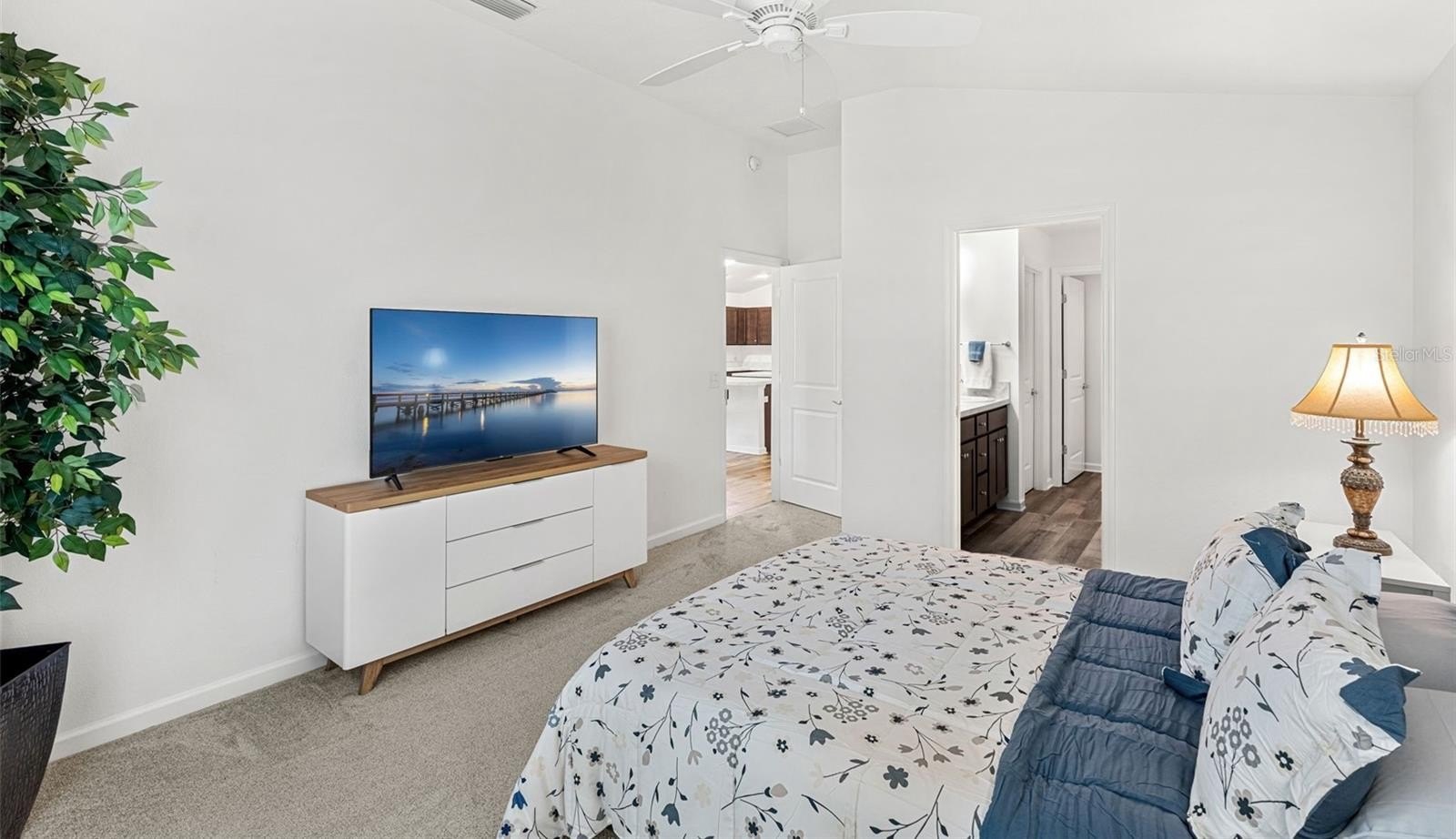 The primary suite is a peaceful retreat with a ceiling fan, high ceilings, a walk-in closet, and an en suite bathroom. A second bedroom and full bath ensure comfort for guests. Additional highlights include luxury vinyl flooring, ceiling fans throughout, and two attached garages, one for a car and another for a dedicated golf cart space.