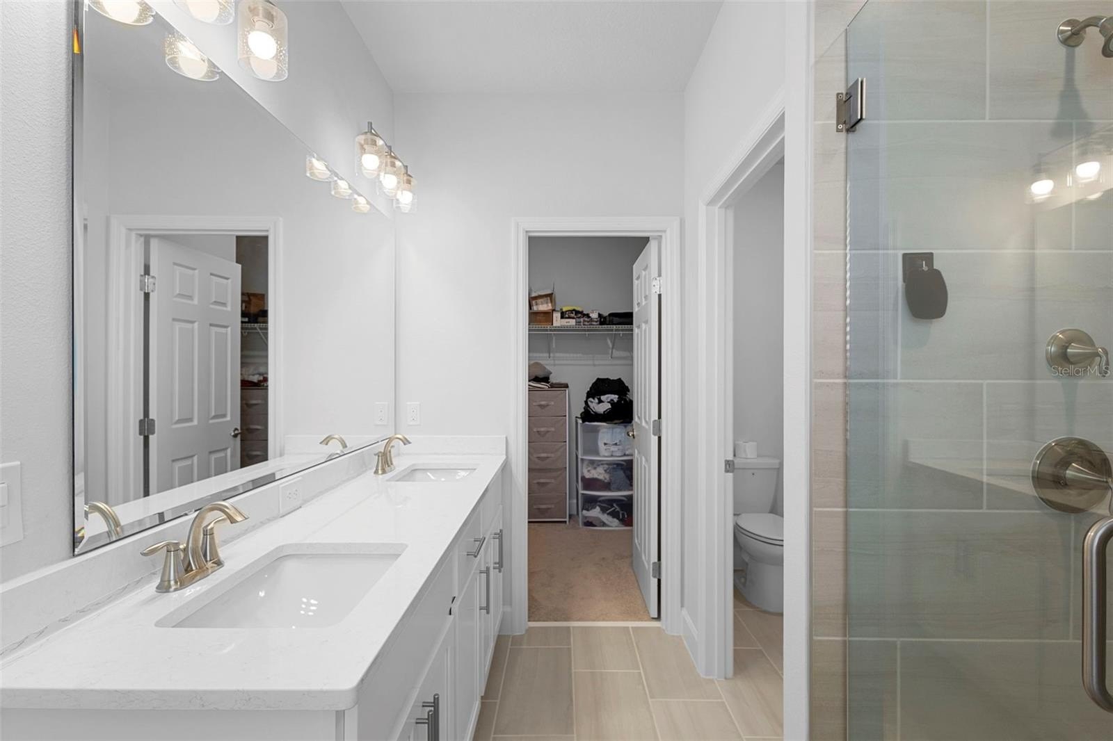 The first floor also offers access to a side porch, a two-car rear-entry garage, and a powder room for guests. Upstairs, enjoy plush carpet throughout the spacious loft and all three bedrooms. The primary suite features a ensuite bathroom complete with dual sinks, a modern walk-in shower, a private water closet, and a generous walk-in closet. Two additional bedrooms share a full bathroom with dual sinks and a shower/tub combo.