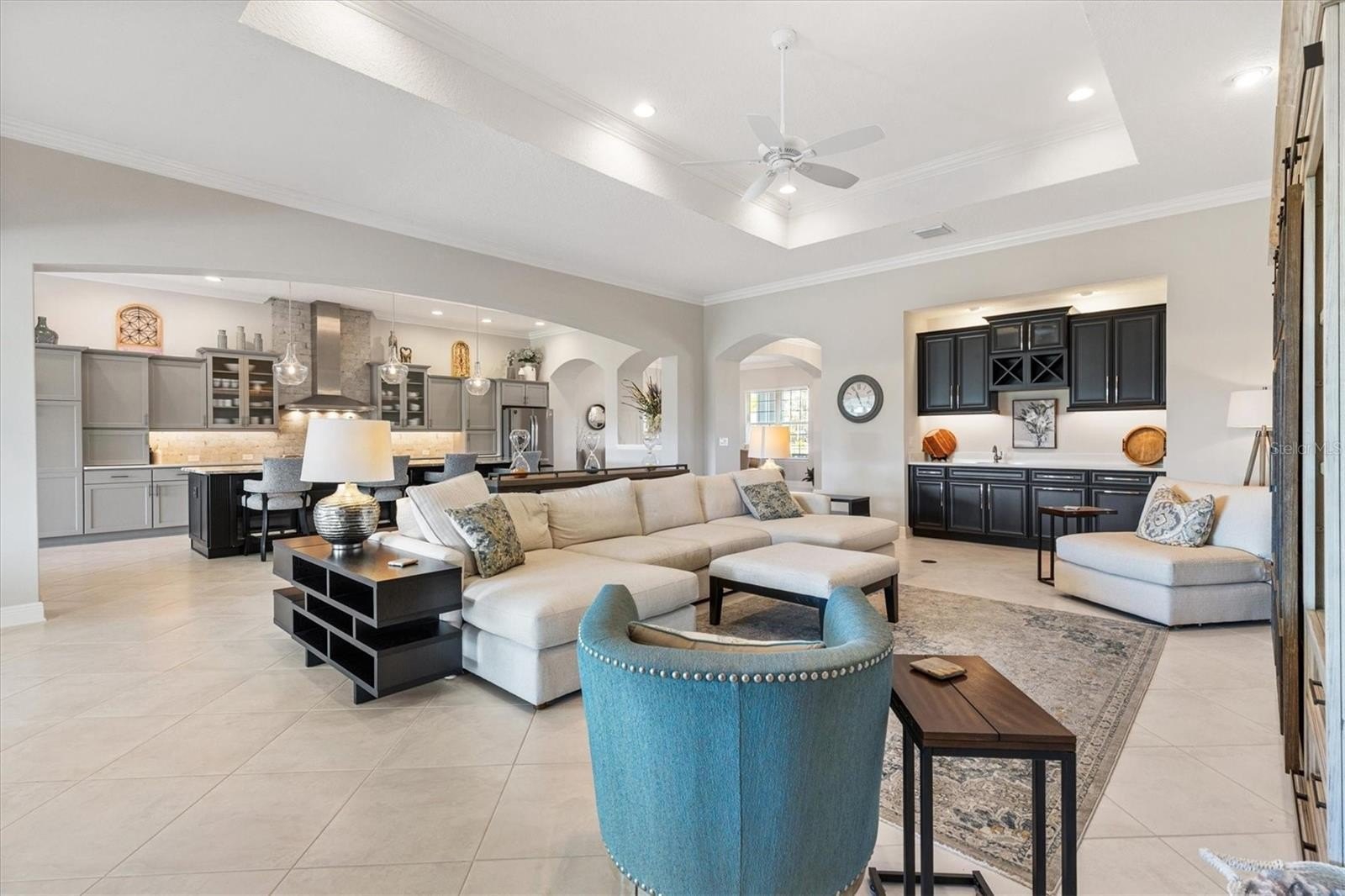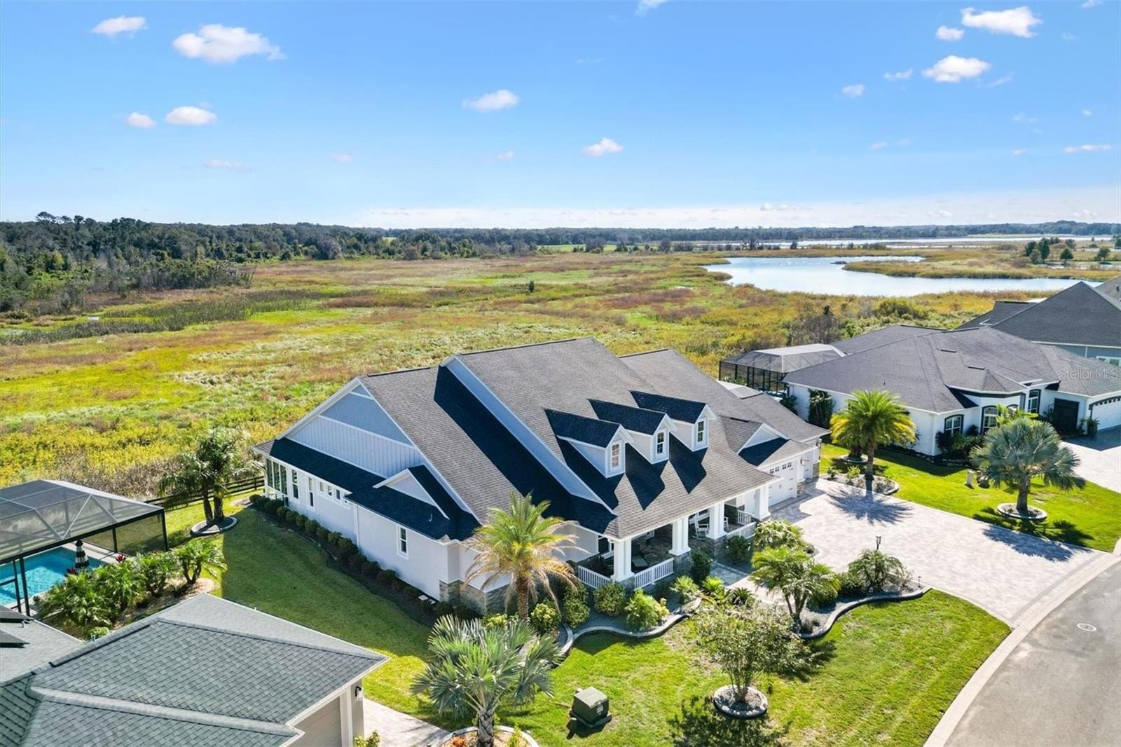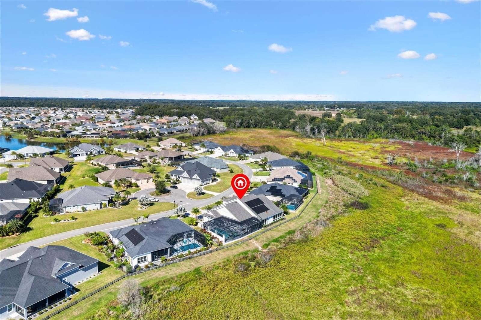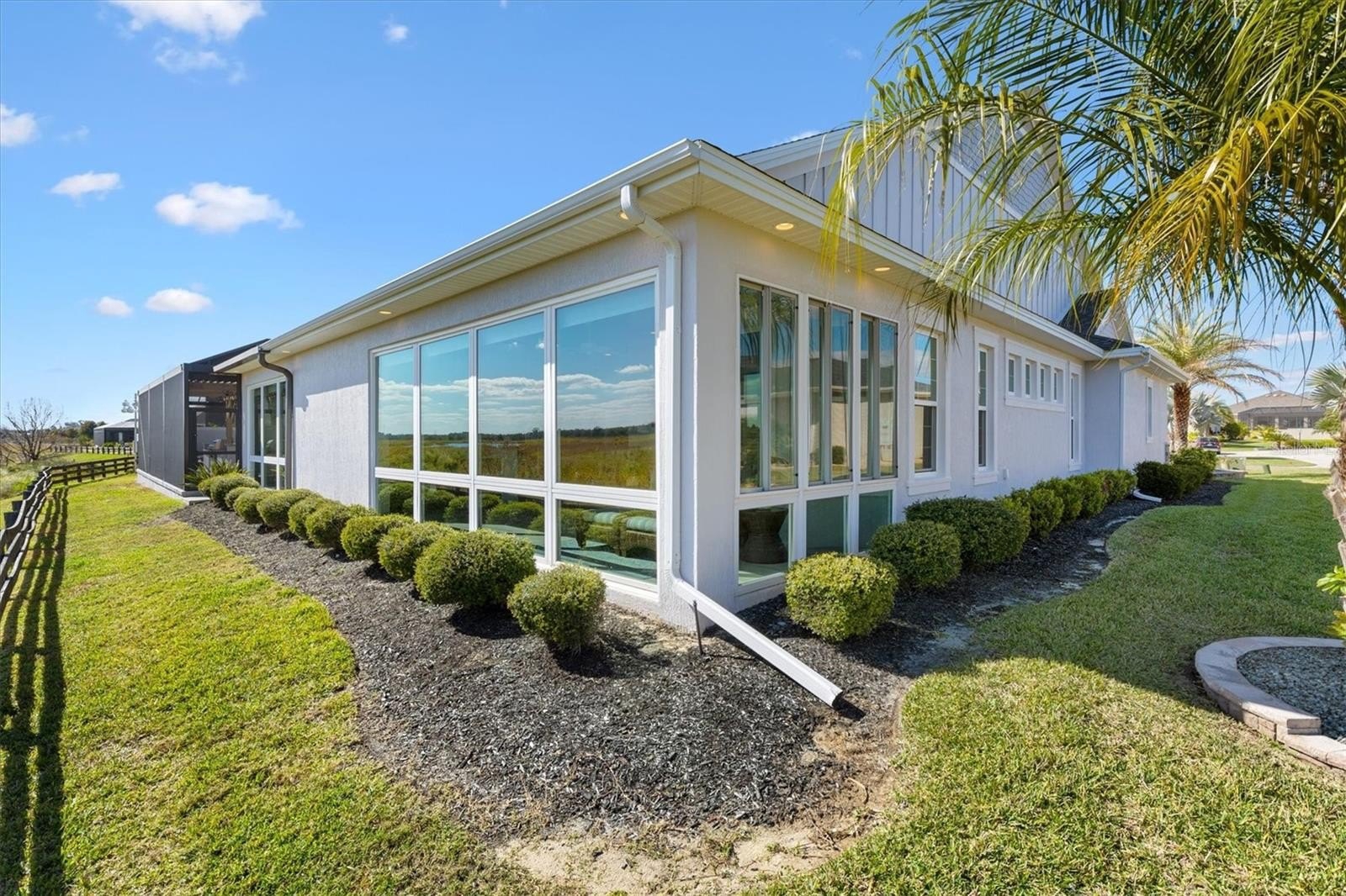 Welcome to a residence where luxury meets lifestyle—nearly 5,000 square feet of exceptional living space crafted for comfort, sophistication, and unforgettable Florida living. This stunning 3-bedroom + den, 3-bath estate sits peacefully along a protected nature preserve, providing the rare combination of total privacy and daily encounters with Florida’s most captivating wildlife. From the moment you walk in, the attention to detail is unmistakable. Diagonal tile flooring throughout, crown molding in every room, and granite surfaces reflect the quality and elegance invested into this remarkable home. The expansive living room opens seamlessly into a gourmet kitchen designed for the true culinary enthusiast. Center stage is a commercial-grade 8-burner gas cooking appliance crowned by a stainless-steel hood and framed by a stunning white brick-style backsplash that rises dramatically to the ceiling. Thoughtful lighting above and below cabinetry creates ambiance, while the oversized island with farmhouse sink and built-in microwave invites gatherings of every kind. Just off the living room is a wet bar with its own sink, ensuring refreshments are always close at hand. One of the most extraordinary features of the home is its glass-enclosed, under-air lanai, adding over 1,000 square feet to the living area. Featuring its own built-in bar with refrigerator, ice maker, and ample storage, this space brings the outdoors in — offering stunning daily views of the expansive preserve where birds and wildlife roam freely. It’s the ideal setting for celebrations with friends or peaceful mornings with a cup of coffee, as nature becomes a breathtaking backdrop to your everyday life. Step through to your private outdoor oasis — a solar-heated, gas-boostered saltwater pool and spa designed to rival high-end resorts. Enjoy the unique swim-up bar with built-in table and seating, perfect for sipping a drink while still in the water. A sun-shelf lounging area lets you relax in just a few inches of water, shaded by an umbrella while keeping cool from the Florida sun. Adjacent is a pergola-covered bar and full summer kitchen, making this space a dream come true for hosts who love entertaining outdoors. The home’s thoughtful layout continues in the private living spaces. A barn door entrance adds charm and privacy to the guest wing, where a beautifully upgraded steam shower enhances relaxation and comfort. The primary suite is truly grand in scale, offering dual walk-in closets, room for a full seating area, and a spa-style en-suite bath complete with a stand-alone soaking tub and an impressive walk-through shower with dual entries — a refined retreat designed for serenity. The oversized 3-car garage with epoxy flooring allows ample storage. Outdoors, meticulously curated landscaping enhances the home’s curb appeal and sets a new standard for beauty in the community. Situated in the heart of The Villages®, this home offers more than luxury — it delivers an extraordinary way of life. Here, championship golf courses, sparkling pools, endless recreation centers, boutique shopping and nightly live entertainment are all part of the everyday experience — effortlessly accessed by golf cart. Whether you’re seeking tranquility, excitement, or a perfect blend of both, this community offers a lifestyle unlike anywhere else. This premier home is a statement of elegance, a rare sanctuary to experience the pinnacle of comfort, sophistication, and The Villages® lifestyle.