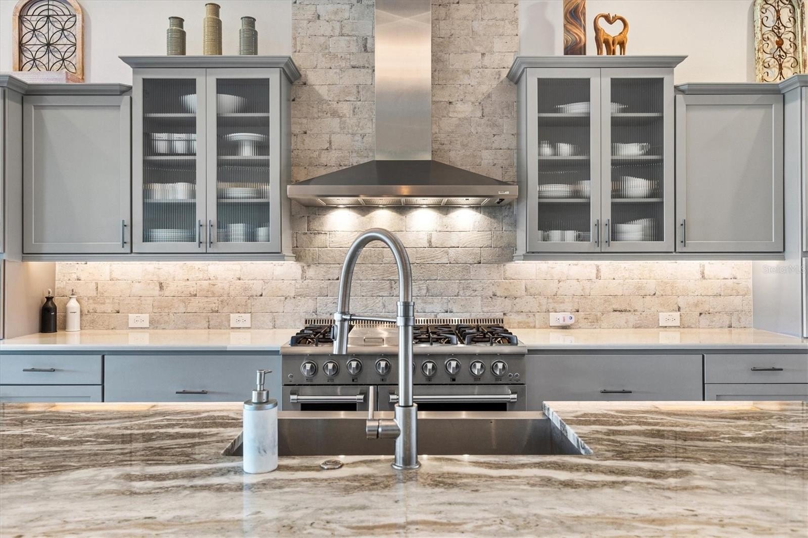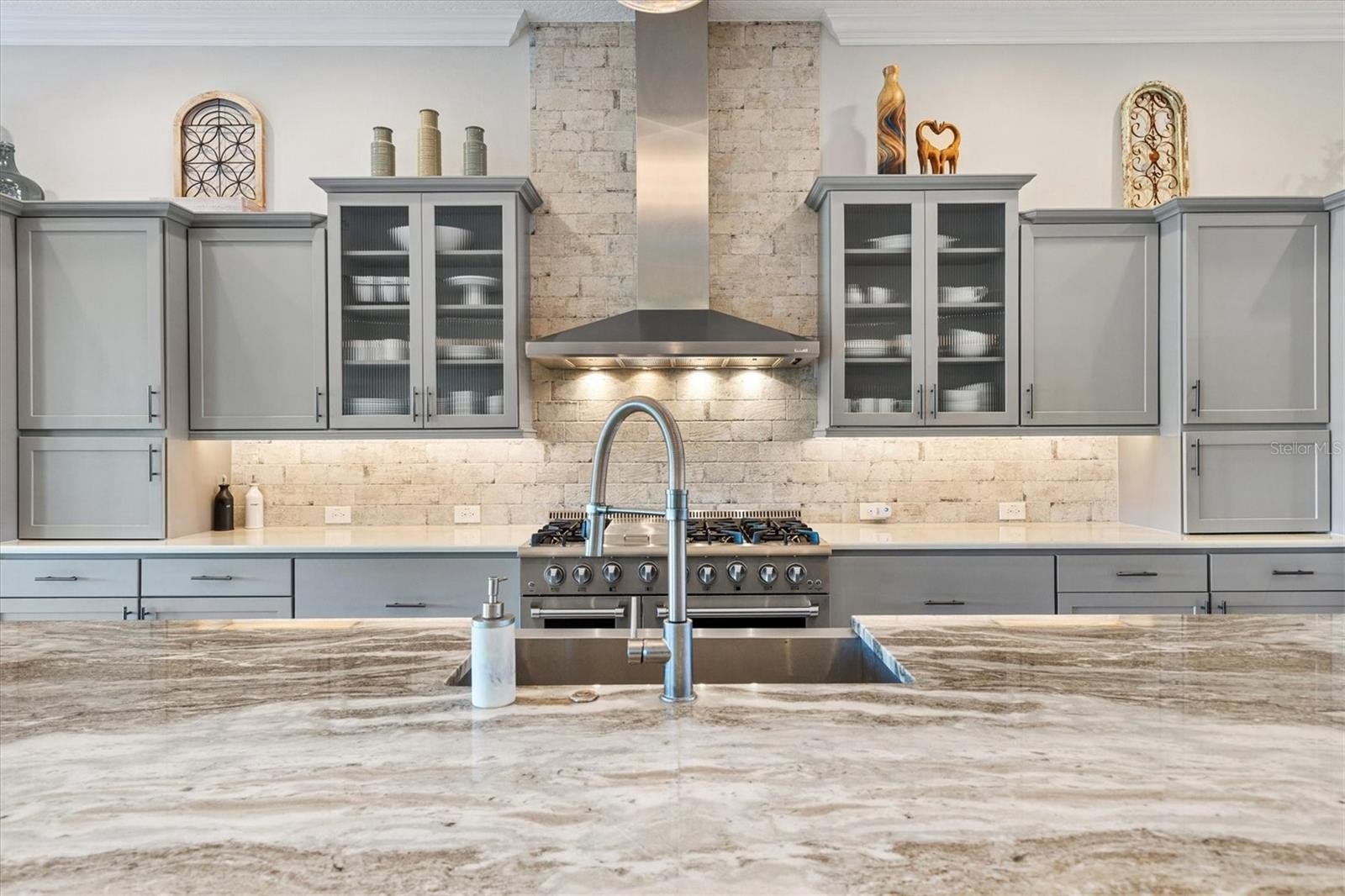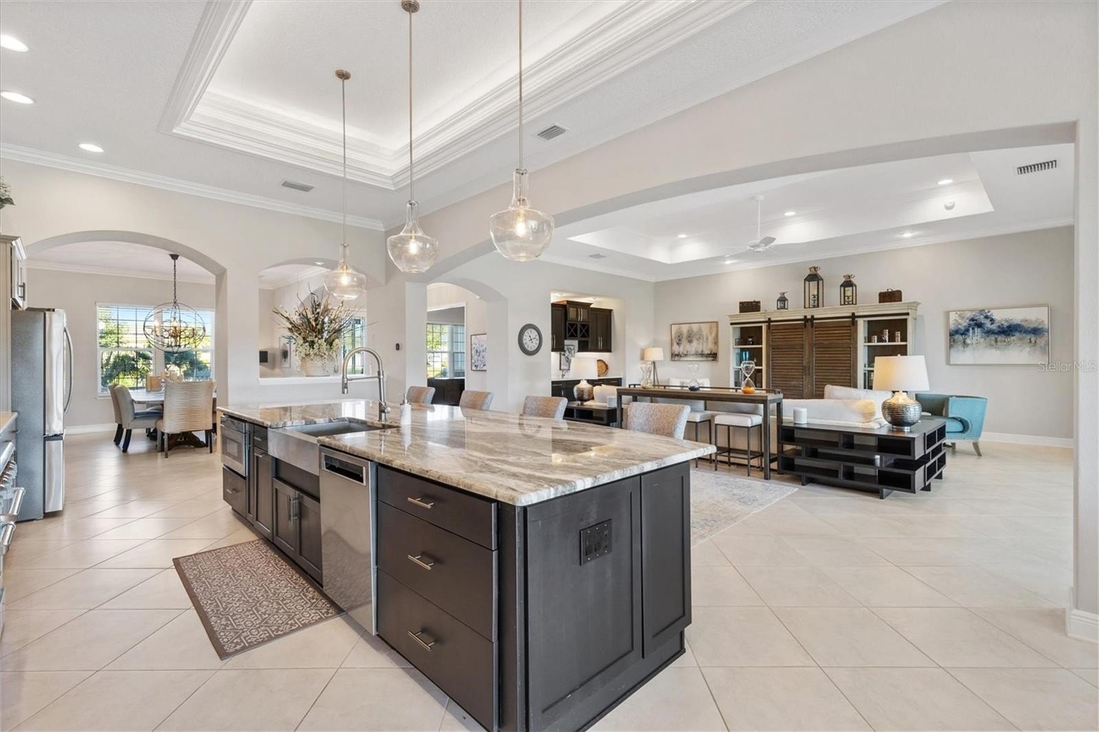 Welcome to a residence where luxury meets lifestyle—nearly 5,000 square feet of exceptional living space crafted for comfort, sophistication, and unforgettable Florida living. This stunning 3-bedroom + den, 3-bath estate sits peacefully along a protected nature preserve, providing the rare combination of total privacy and daily encounters with Florida’s most captivating wildlife. From the moment you walk in, the attention to detail is unmistakable. Diagonal tile flooring throughout, crown molding in every room, and granite surfaces reflect the quality and elegance invested into this remarkable home. The expansive living room opens seamlessly into a gourmet kitchen designed for the true culinary enthusiast. Center stage is a commercial-grade 8-burner gas cooking appliance crowned by a stainless-steel hood and framed by a stunning white brick-style backsplash that rises dramatically to the ceiling. Thoughtful lighting above and below cabinetry creates ambiance, while the oversized island with farmhouse sink and built-in microwave invites gatherings of every kind. Just off the living room is a wet bar with its own sink, ensuring refreshments are always close at hand. One of the most extraordinary features of the home is its glass-enclosed, under-air lanai, adding over 1,000 square feet to the living area. Featuring its own built-in bar with refrigerator, ice maker, and ample storage, this space brings the outdoors in — offering stunning daily views of the expansive preserve where birds and wildlife roam freely. It’s the ideal setting for celebrations with friends or peaceful mornings with a cup of coffee, as nature becomes a breathtaking backdrop to your everyday life. Step through to your private outdoor oasis — a solar-heated, gas-boostered saltwater pool and spa designed to rival high-end resorts. Enjoy the unique swim-up bar with built-in table and seating, perfect for sipping a drink while still in the water. A sun-shelf lounging area lets you relax in just a few inches of water, shaded by an umbrella while keeping cool from the Florida sun. Adjacent is a pergola-covered bar and full summer kitchen, making this space a dream come true for hosts who love entertaining outdoors. The home’s thoughtful layout continues in the private living spaces. A barn door entrance adds charm and privacy to the guest wing, where a beautifully upgraded steam shower enhances relaxation and comfort. The primary suite is truly grand in scale, offering dual walk-in closets, room for a full seating area, and a spa-style en-suite bath complete with a stand-alone soaking tub and an impressive walk-through shower with dual entries — a refined retreat designed for serenity. The oversized 3-car garage with epoxy flooring allows ample storage. Outdoors, meticulously curated landscaping enhances the home’s curb appeal and sets a new standard for beauty in the community. Situated in the heart of The Villages®, this home offers more than luxury — it delivers an extraordinary way of life. Here, championship golf courses, sparkling pools, endless recreation centers, boutique shopping and nightly live entertainment are all part of the everyday experience — effortlessly accessed by golf cart. Whether you’re seeking tranquility, excitement, or a perfect blend of both, this community offers a lifestyle unlike anywhere else. This premier home is a statement of elegance, a rare sanctuary to experience the pinnacle of comfort, sophistication, and The Villages® lifestyle.