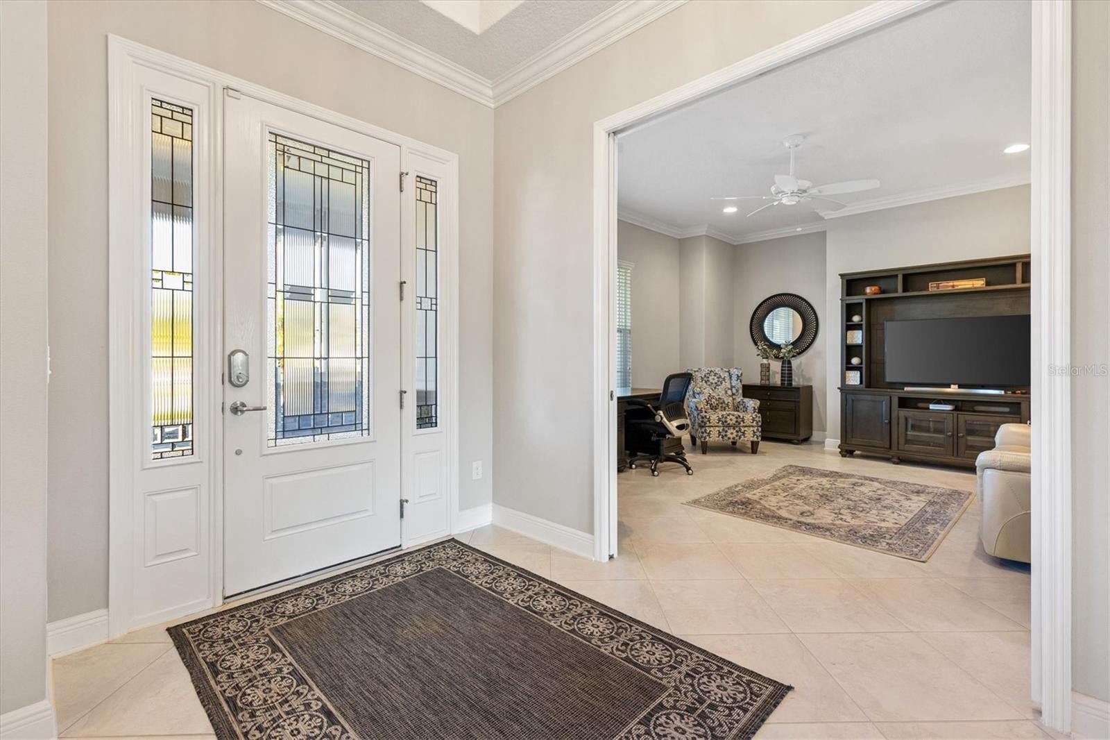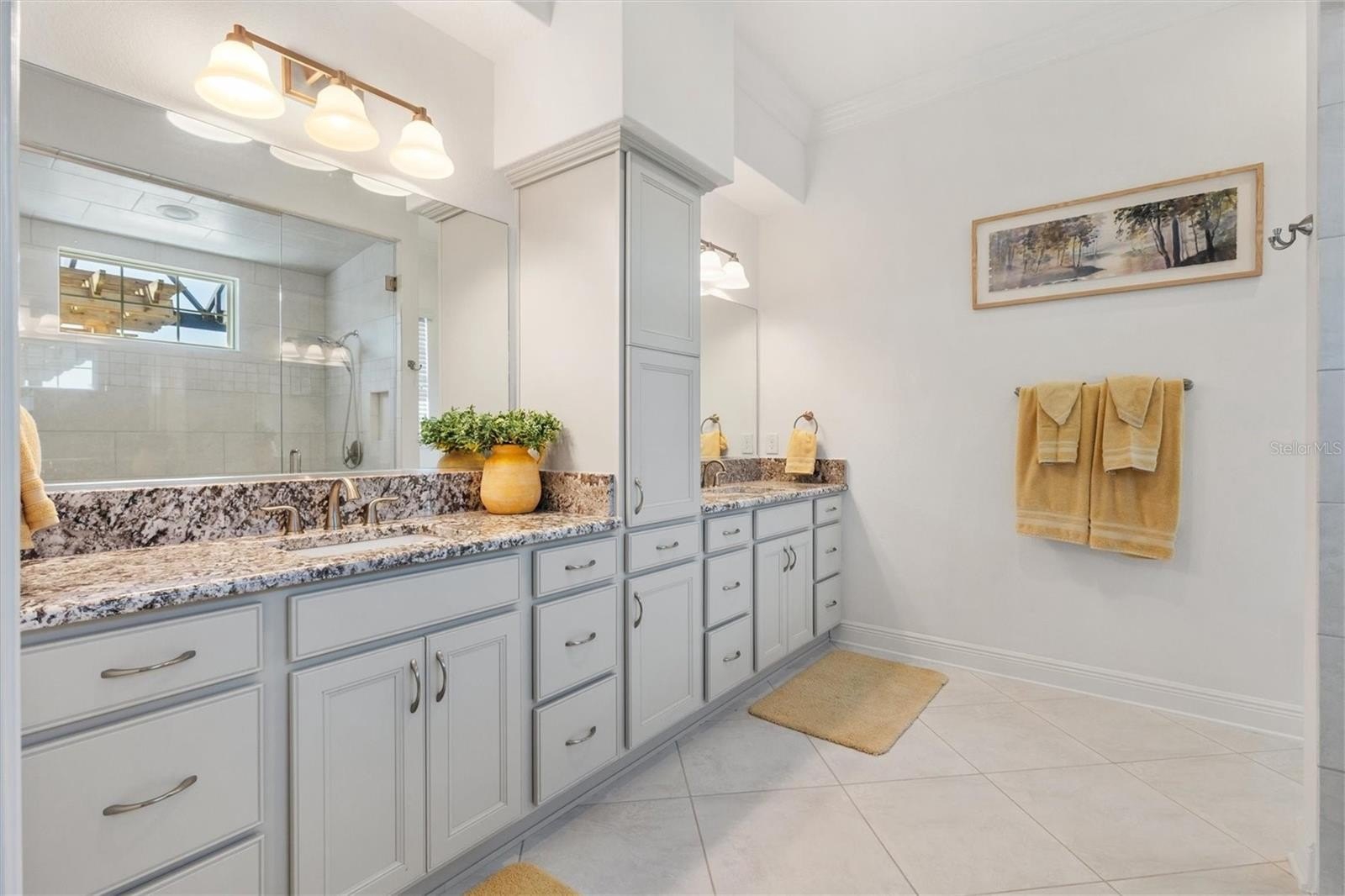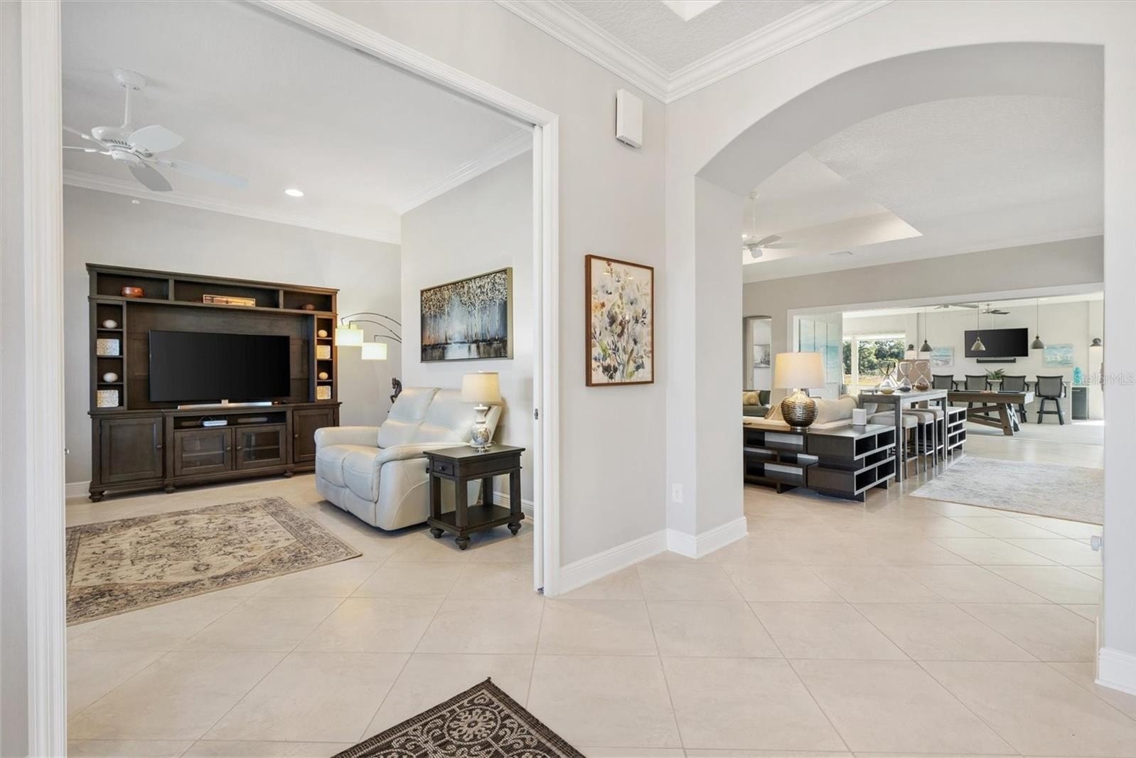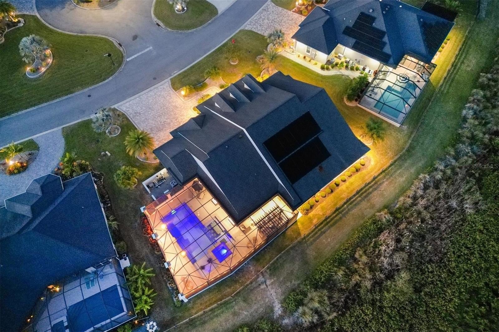 Welcome to a residence where luxury meets lifestyle—nearly 5,000 square feet of exceptional living space crafted for comfort, sophistication, and unforgettable Florida living. This stunning 3-bedroom + den, 3-bath estate sits peacefully along a protected nature preserve, providing the rare combination of total privacy and daily encounters with Florida’s most captivating wildlife. From the moment you walk in, the attention to detail is unmistakable. Diagonal tile flooring throughout, crown molding in every room, and granite surfaces reflect the quality and elegance invested into this remarkable home. The expansive living room opens seamlessly into a gourmet kitchen designed for the true culinary enthusiast. Center stage is a commercial-grade 8-burner gas cooking appliance crowned by a stainless-steel hood and framed by a stunning white brick-style backsplash that rises dramatically to the ceiling. Thoughtful lighting above and below cabinetry creates ambiance, while the oversized island with farmhouse sink and built-in microwave invites gatherings of every kind. Just off the living room is a wet bar with its own sink, ensuring refreshments are always close at hand. One of the most extraordinary features of the home is its glass-enclosed, under-air lanai, adding over 1,000 square feet to the living area. Featuring its own built-in bar with refrigerator, ice maker, and ample storage, this space brings the outdoors in — offering stunning daily views of the expansive preserve where birds and wildlife roam freely. It’s the ideal setting for celebrations with friends or peaceful mornings with a cup of coffee, as nature becomes a breathtaking backdrop to your everyday life. Step through to your private outdoor oasis — a solar-heated, gas-boostered saltwater pool and spa designed to rival high-end resorts. Enjoy the unique swim-up bar with built-in table and seating, perfect for sipping a drink while still in the water. A sun-shelf lounging area lets you relax in just a few inches of water, shaded by an umbrella while keeping cool from the Florida sun. Adjacent is a pergola-covered bar and full summer kitchen, making this space a dream come true for hosts who love entertaining outdoors. The home’s thoughtful layout continues in the private living spaces. A barn door entrance adds charm and privacy to the guest wing, where a beautifully upgraded steam shower enhances relaxation and comfort. The primary suite is truly grand in scale, offering dual walk-in closets, room for a full seating area, and a spa-style en-suite bath complete with a stand-alone soaking tub and an impressive walk-through shower with dual entries — a refined retreat designed for serenity. The oversized 3-car garage with epoxy flooring allows ample storage. Outdoors, meticulously curated landscaping enhances the home’s curb appeal and sets a new standard for beauty in the community. Situated in the heart of The Villages®, this home offers more than luxury — it delivers an extraordinary way of life. Here, championship golf courses, sparkling pools, endless recreation centers, boutique shopping and nightly live entertainment are all part of the everyday experience — effortlessly accessed by golf cart. Whether you’re seeking tranquility, excitement, or a perfect blend of both, this community offers a lifestyle unlike anywhere else. This premier home is a statement of elegance, a rare sanctuary to experience the pinnacle of comfort, sophistication, and The Villages® lifestyle.