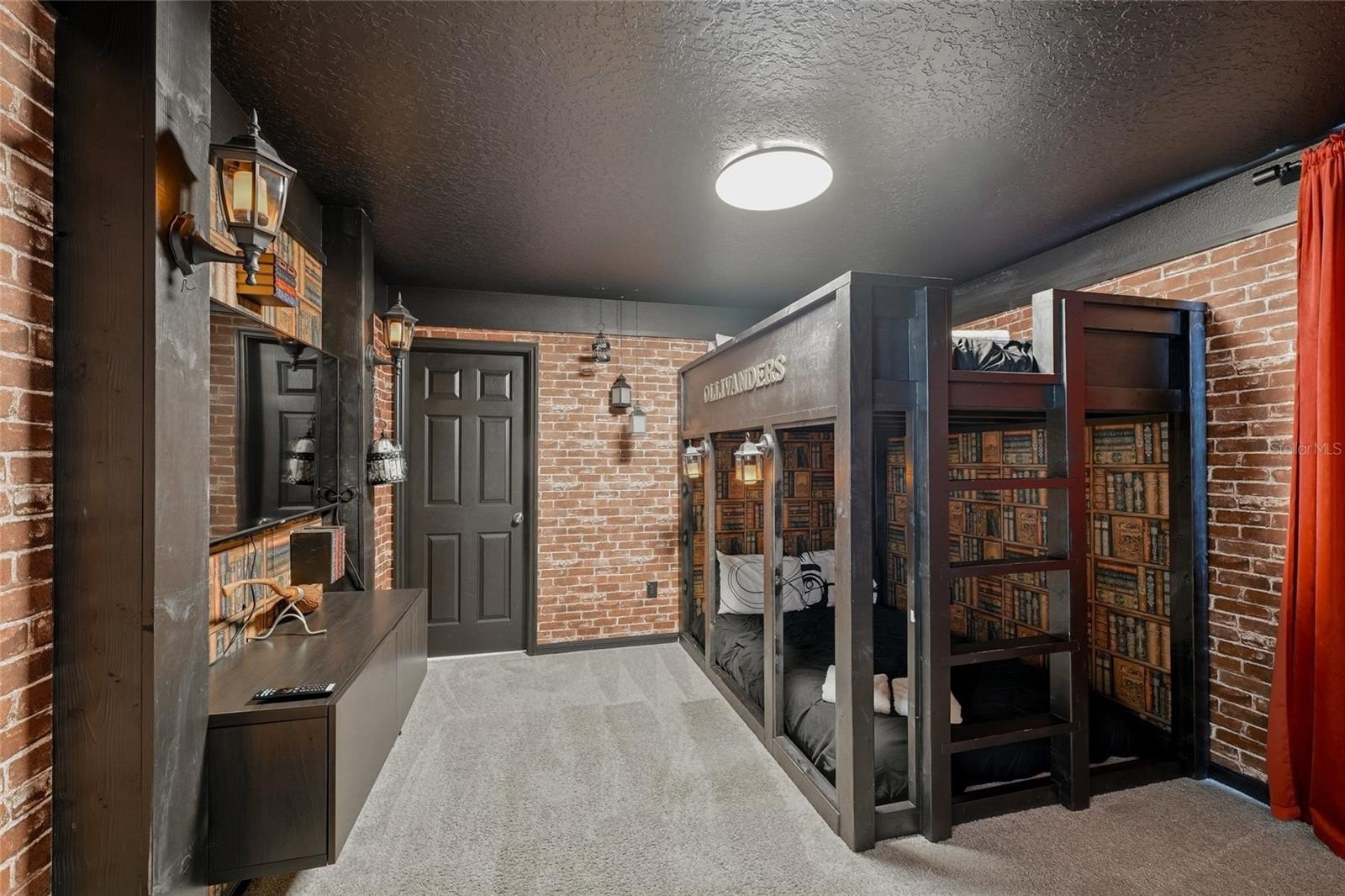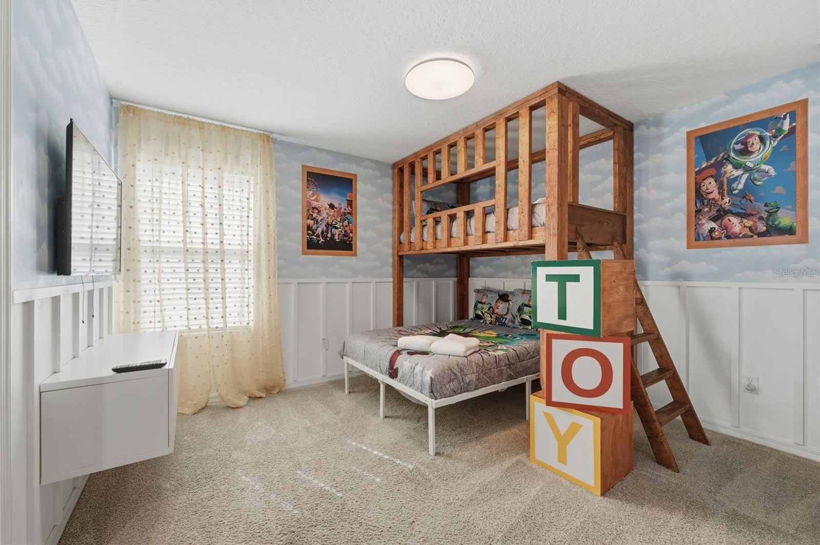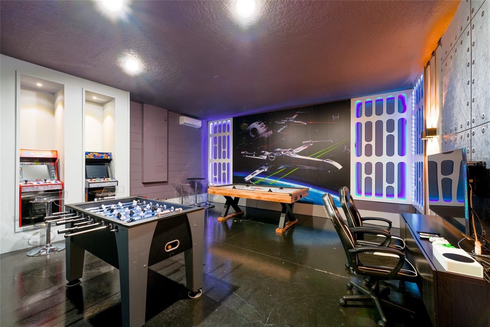 Upstairs, you’ll find themed bedrooms, multiple ensuite baths, and a large loft area with a movie theater, inviting space ideal for gatherings or entertainment. The garage has been fully converted into a vibrant game room, adding even more appeal for vacationers and maximizing rental potential.
