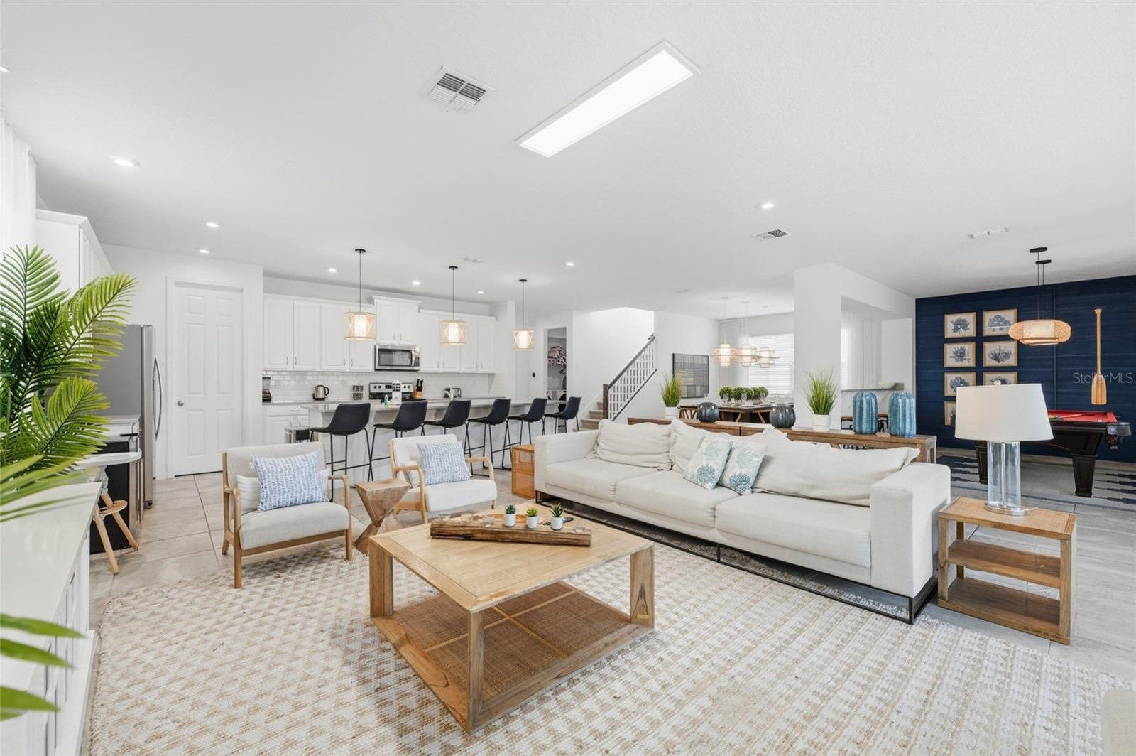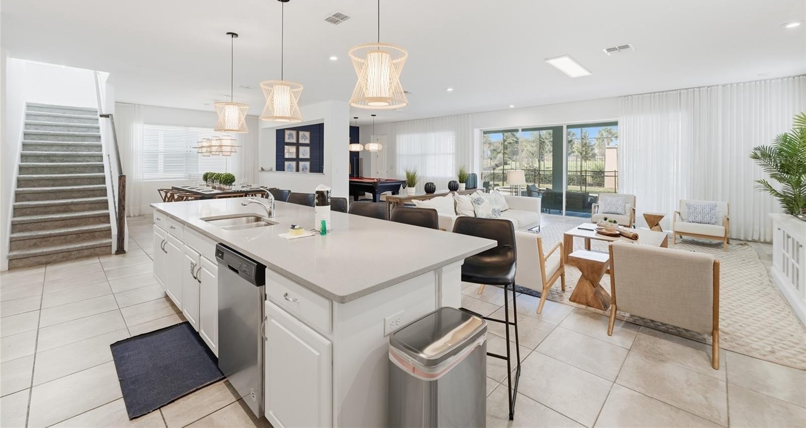 Step inside to an open-concept floor plan with soaring ceilings, abundant natural light, and stylish finishes throughout. The spacious living and dining areas flow seamlessly into the chef-inspired kitchen, cabinetry, granite countertops, stainless steel appliances, and a large island with breakfast bar—perfect for entertaining family and guests.