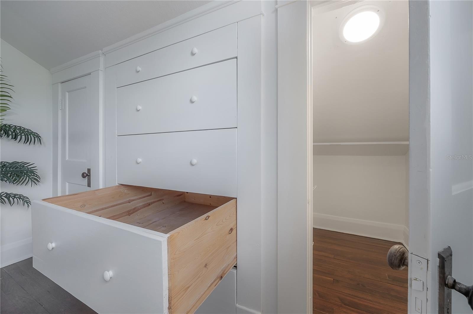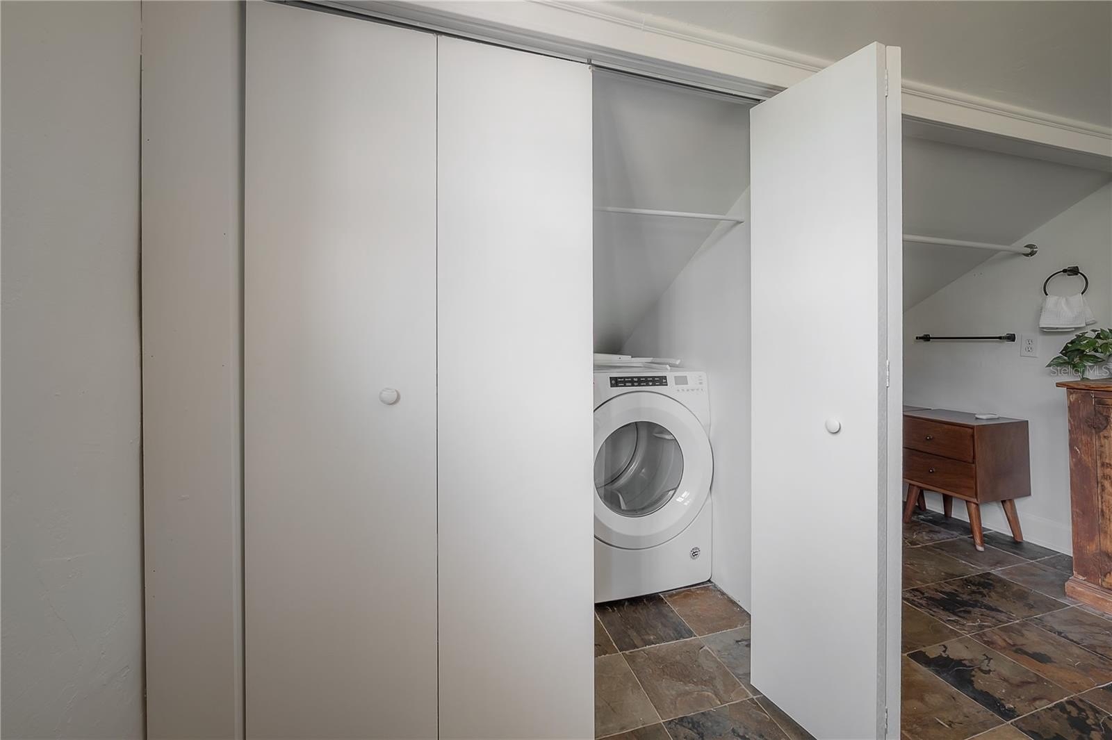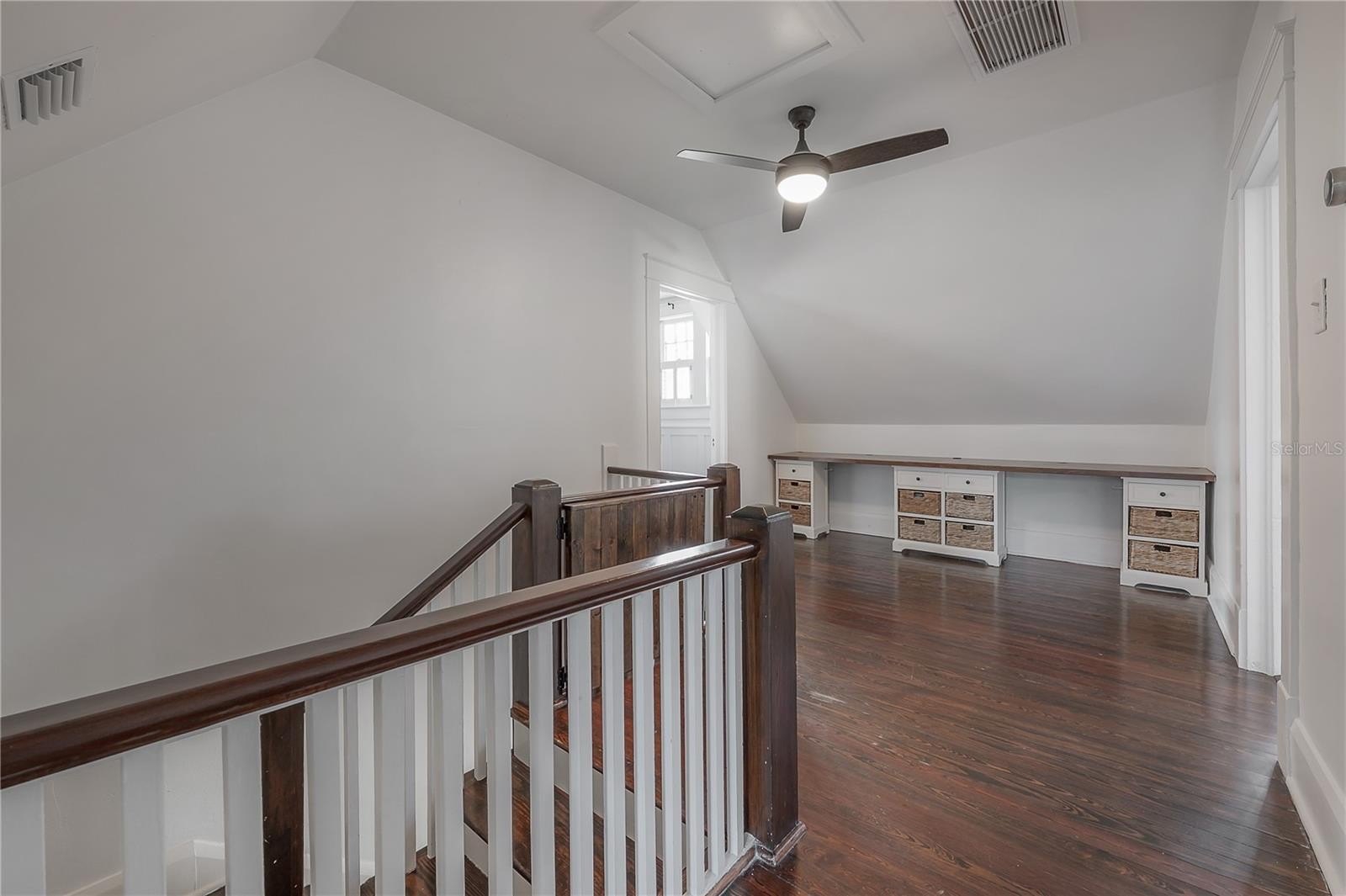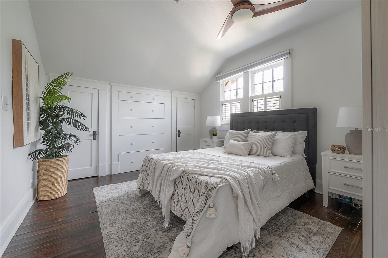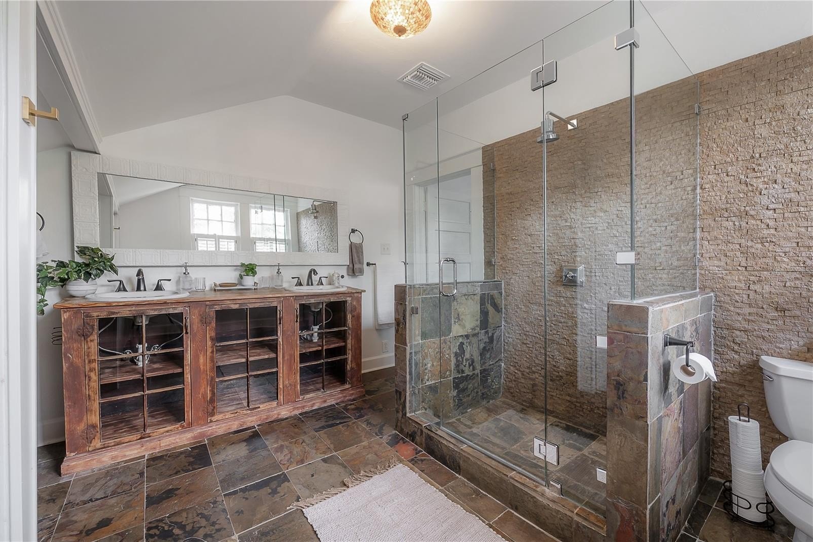 The main floor includes two full bathrooms and a versatile guest suite, ideal for visitors, a home office, or multi-generational living. Upstairs, a charming loft with built-in workstations provides an inspiring nook for work, study, or creative projects. The primary suite offers a sense of calm, complete with dual closets, built-in drawers, and a spa-inspired bath boasting an antique double vanity, rainfall shower, and slate flooring.